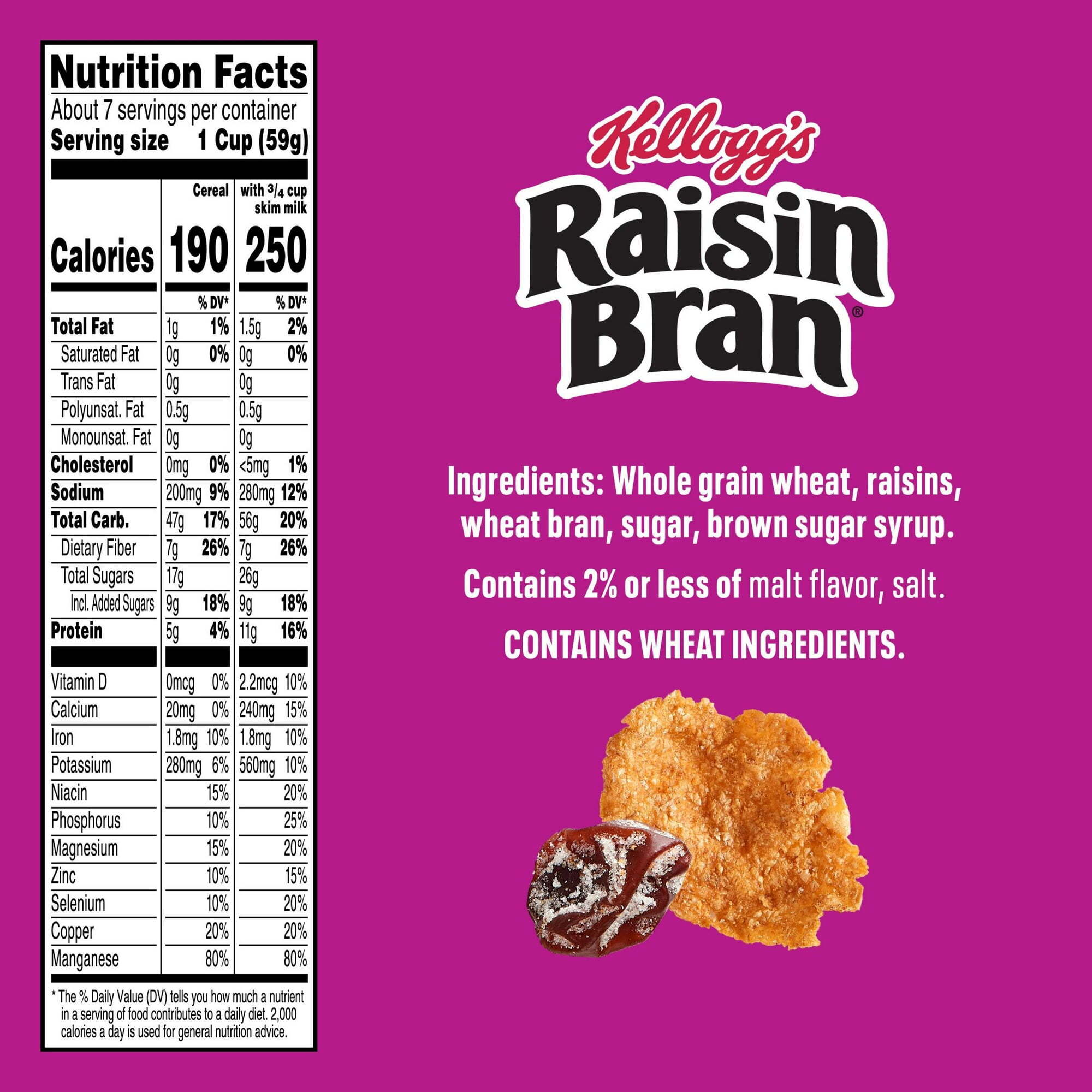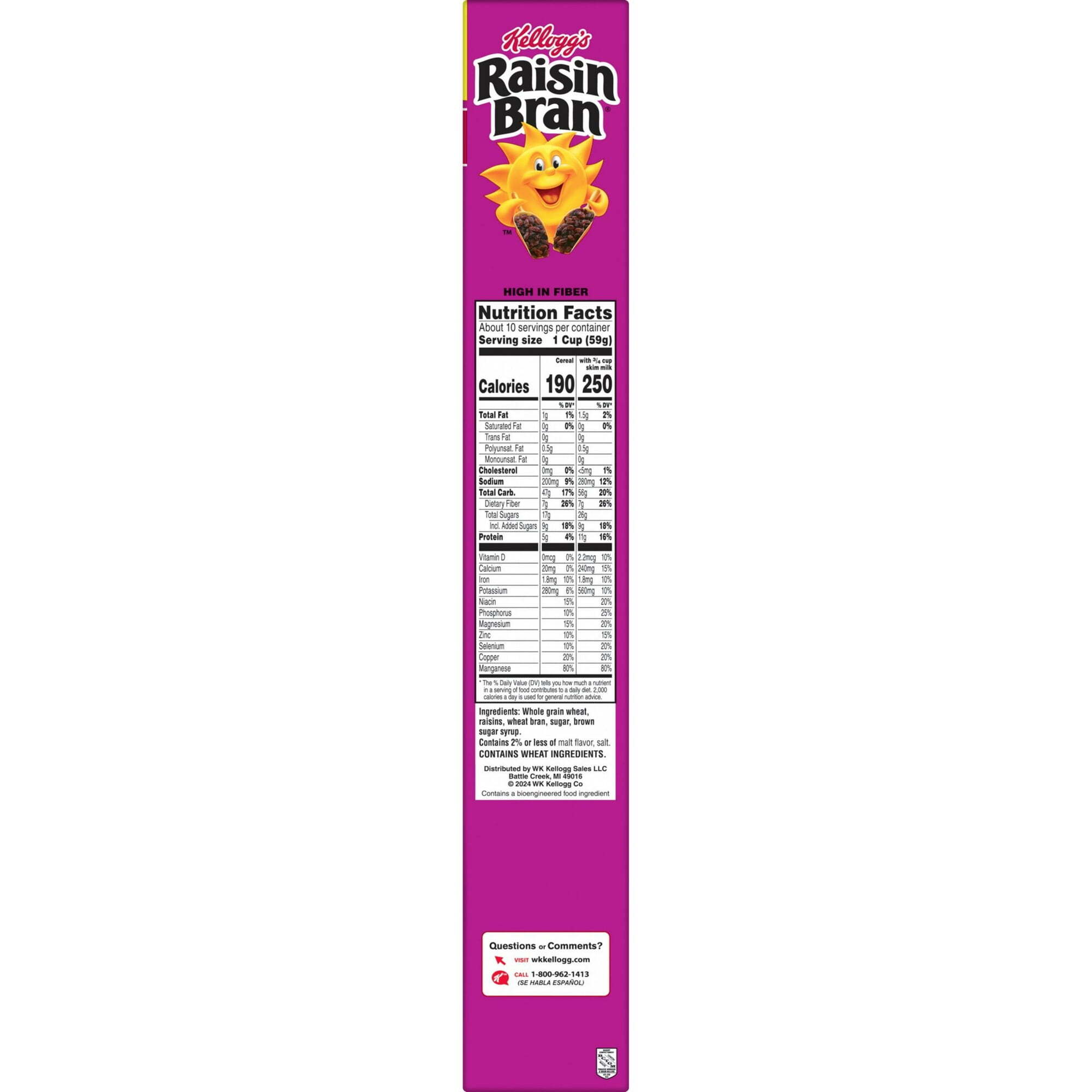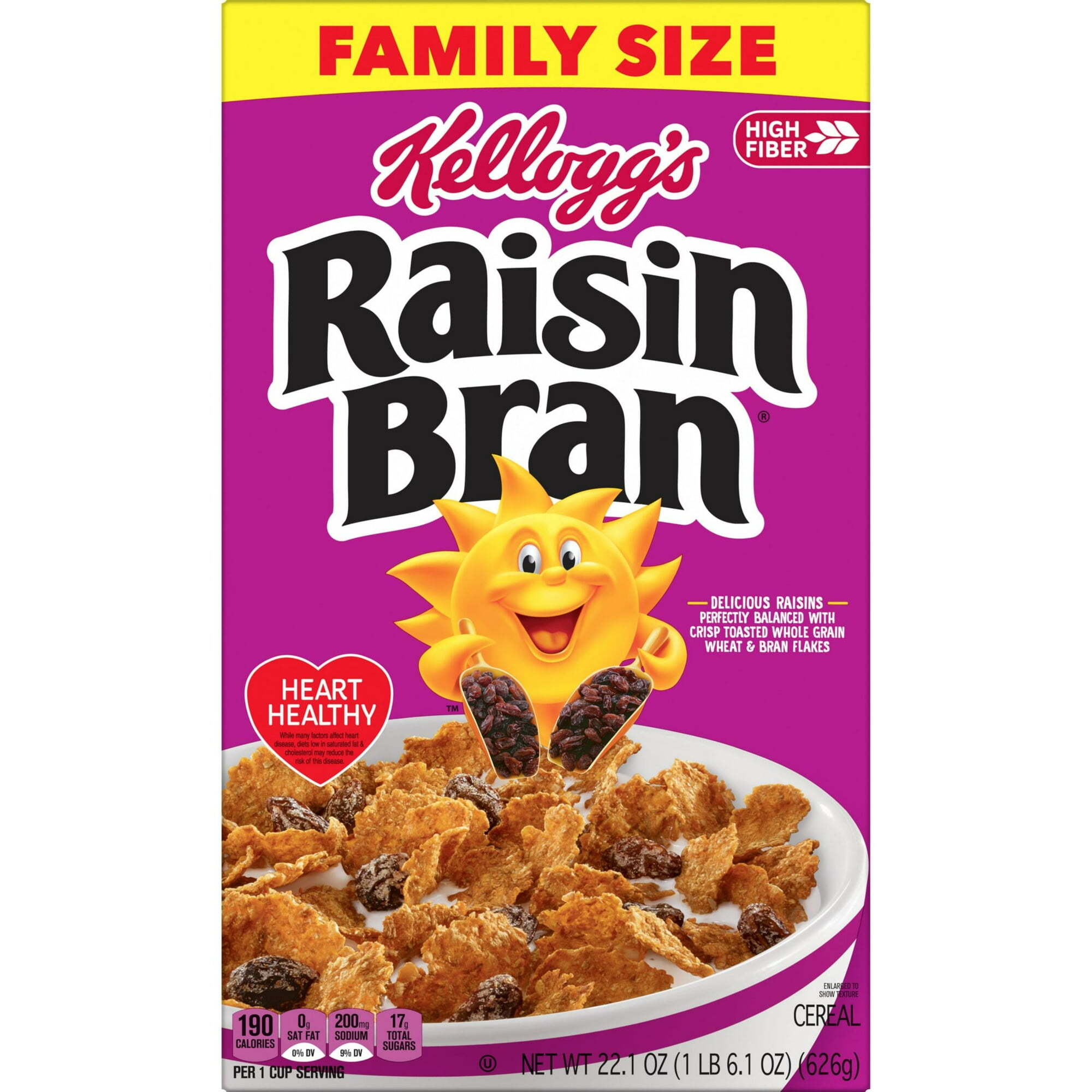 Wake up with Sunny and the delicious taste of Kellogg’s Raisin Bran, a delicately crafted cereal that helps bring energy to start your day. This crunchy, healthy cereal is made with crispy, toasted whole grain wheat and bran flakes balanced with the satisfying taste of sweet sun-ripened raisins in every spoonful; Just as nutritious as it is delicious, this breakfast cereal is heart-healthy (while many factors affect heart disease, diets low in saturated fat and cholesterol may reduce the risk of this disease). Kellogg’s Raisin Bran cereal provides 26% of your daily value of fiber and is a good source of 8 vitamins and minerals to help you start your day off strong. This crunchy cereal is bursting with delicious, so you can enjoy our best in every bite. Whether you prefer your Kellogg’s Raisin Bran in a bowl with your favorite milk for a quick breakfast, sprinkled over yogurt for an afternoon treat, or as a crispy snack straight from the box, Kellogg’s Raisin Bran cereal lets you make the most of your day.