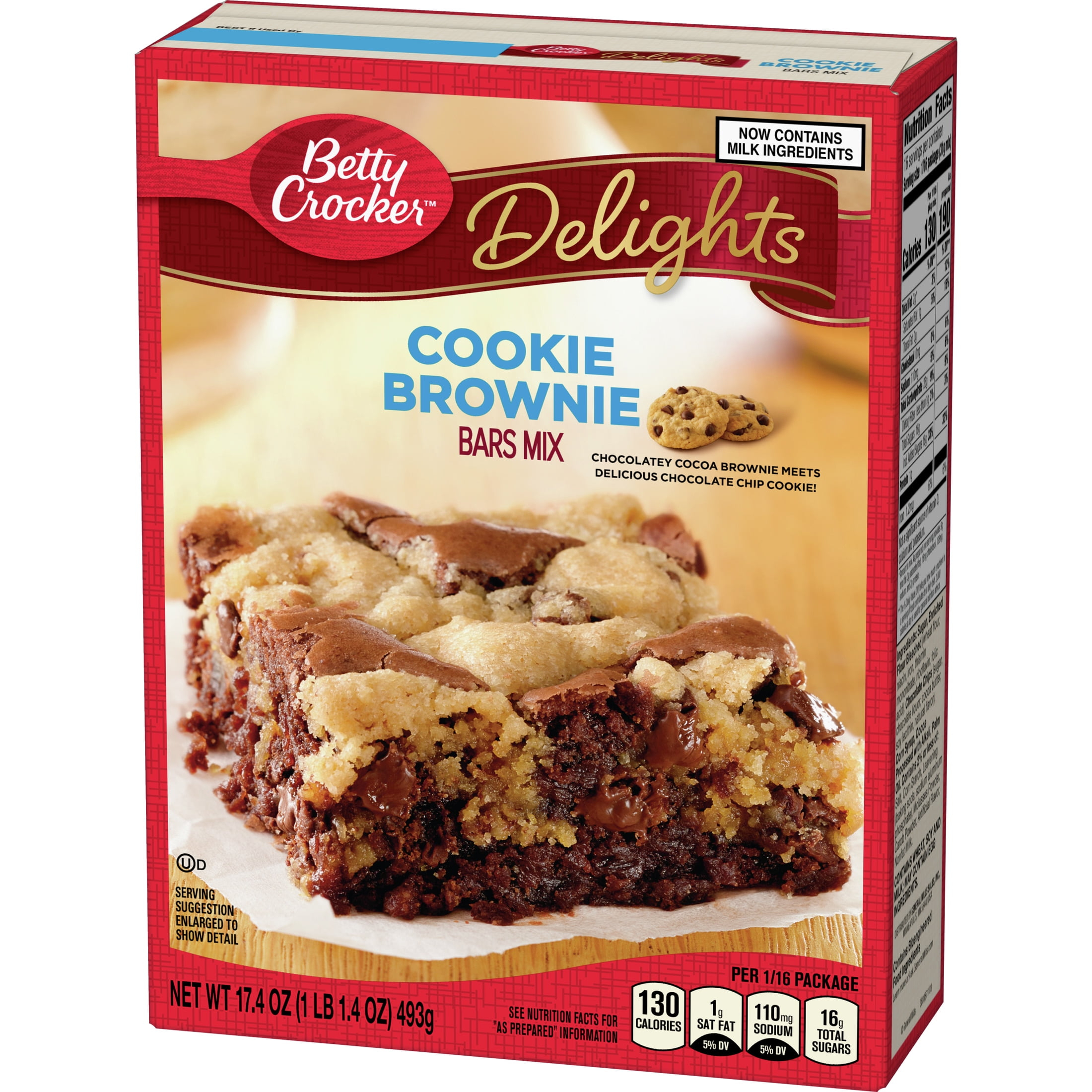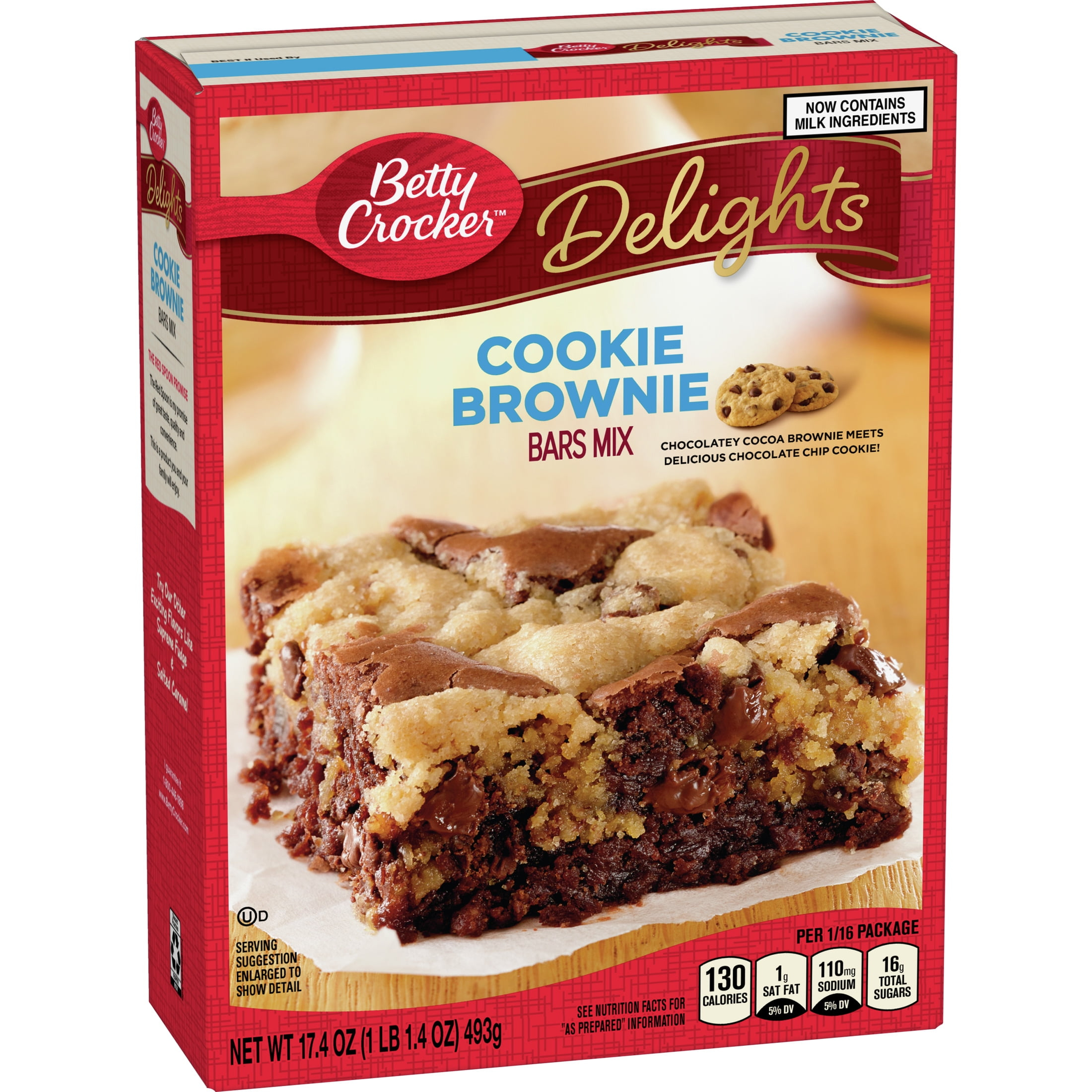 Satisfy your sweet tooth cravings with Betty Crocker Delights Cookie Brownie Bars Mix. This brownie mix, combined with cookie mix, is the quick and easy way to create a delicious treat the whole family will love by adding just a few ingredients. Bite into a decadent cookie bar mixed with chocolatey brownie in just a few simple steps. Impress friends and family at your next gathering or brighten up a Tuesday with these yummy bars. For more than a century, Betty Crocker has been a popular creator of easy, delicious recipes. Today, the Betty Crocker kitchen is still providing convenient, tasty dessert mixes, frostings, and convenient meal options and side dishes. And today, you can still find those same products you grew up with on grocery shelves.