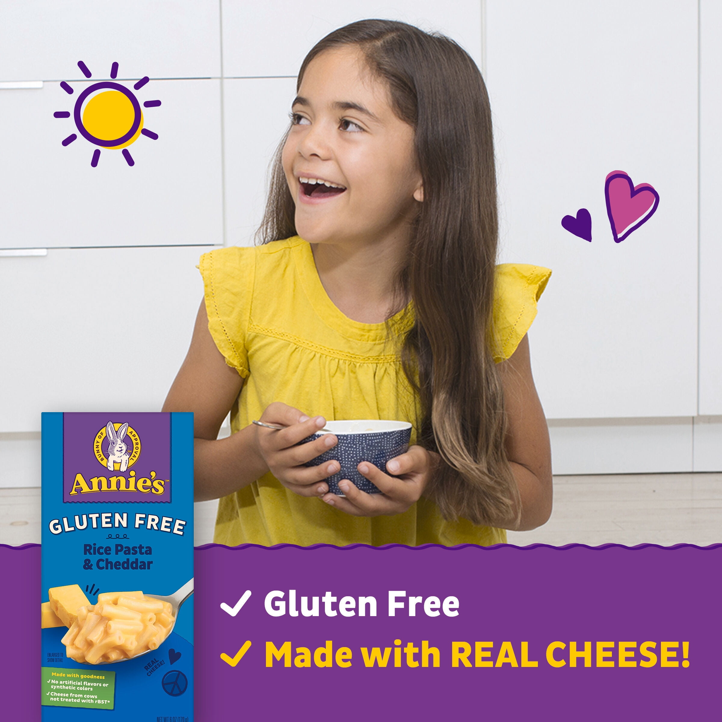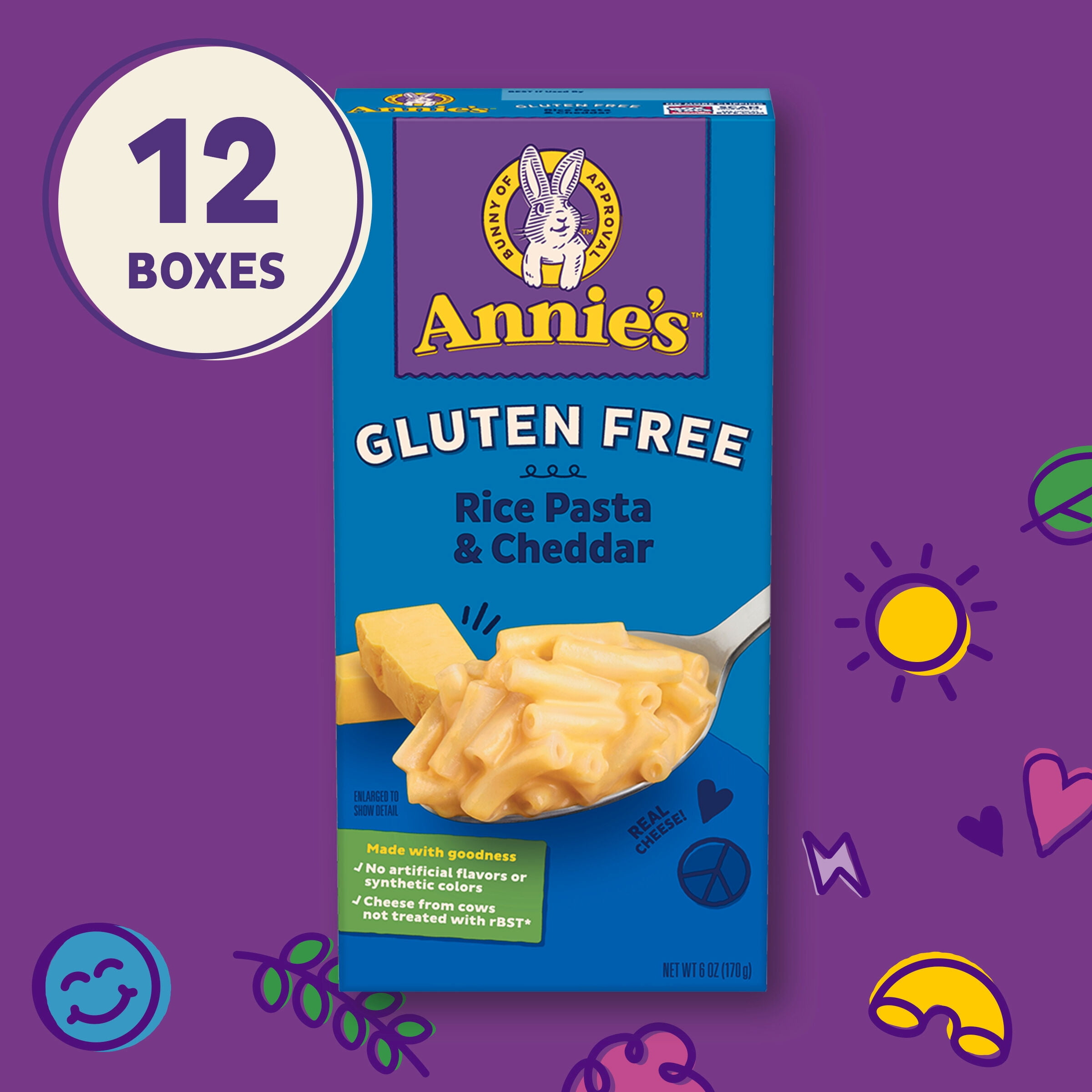 - CONTAINS: One 6 oz box of Annie’s Gluten Free Rice Pasta and Cheddar Macaroni and Cheese