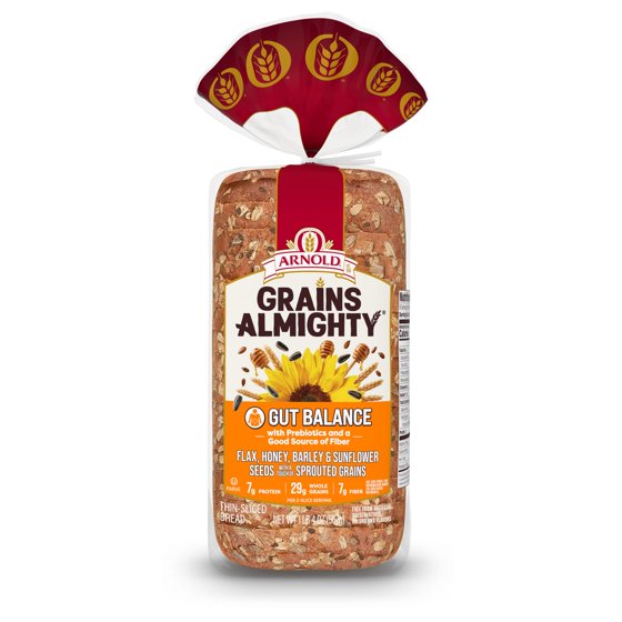 Arnold Grains Almighty is amazing tasting bread that celebrates all the benefits that whole grains have to offer. Each variety is carefully made with a blend of sprouted grains and combined with natural ingredients to nourish your body. It’s the perfect bread for your lunch sandwich or avocado toast snack or breakfast. Arnold Grains Almighty Gut Balance is specifically made with your digestive health in mind and therefore builds on fiber that’s naturally in the the sprouted grain blend by adding a prebiotic fiber as well . And as it always is, Arnold is committed to bringing you bread that you can believe in – so you can live your life and love your loaf. This item is Shelf Stable. Size Description: Regular.
