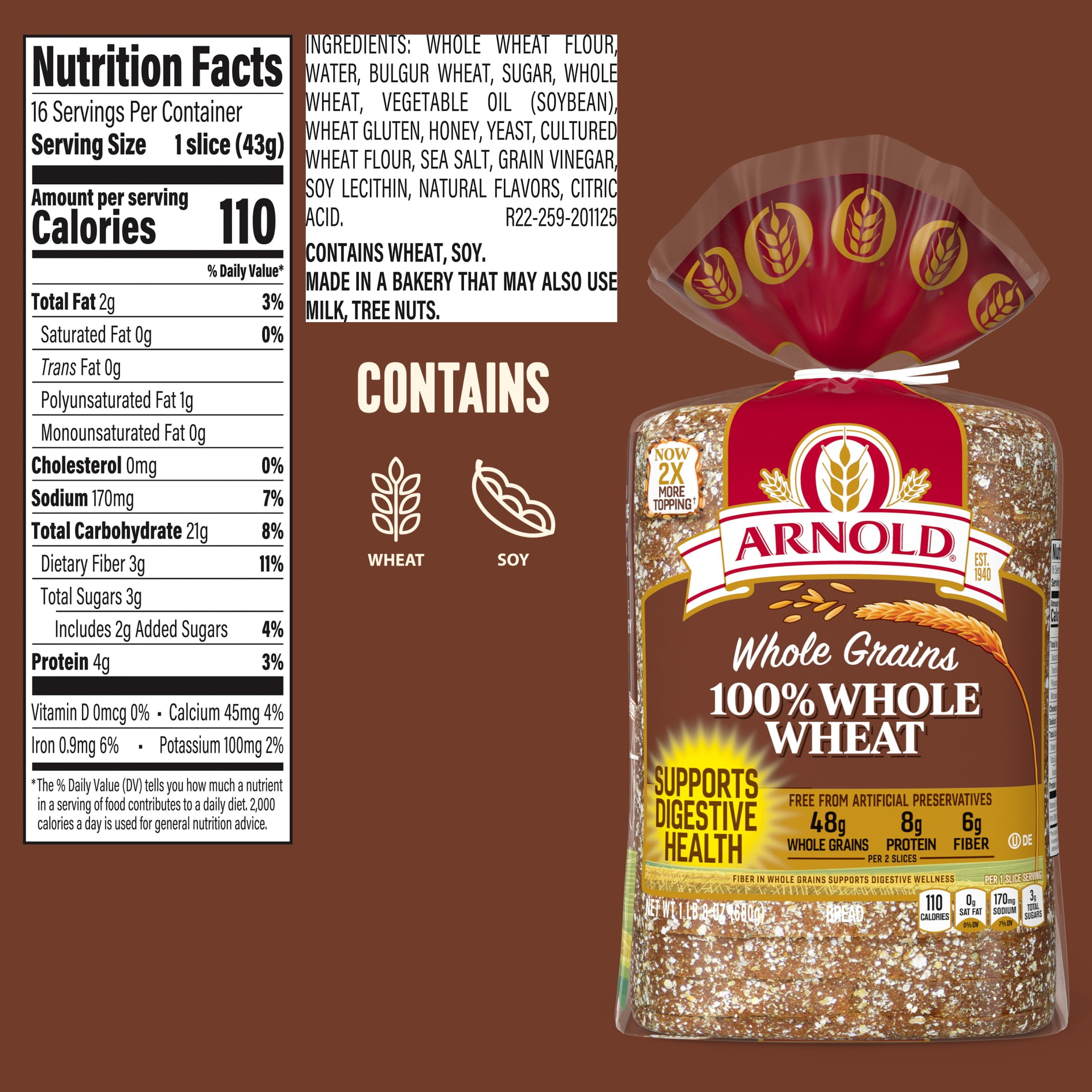 Arnold Whole Grains 100% Whole Wheat Bread is baked with the goodness of grains, making it a simple choice that supports your goal of living a balanced life. This whole grain bread loaf gives your favorite sandwiches a rich, nutritional flavor. Free from artificial colors, flavors and preservatives, as well as high fructose corn syrup, this loaf of bread delivers nutrition in every bite. With 23 grams of whole grains, 4 grams of protein and 3 grams of fiber per slice, this sliced bread helps support digestive health. Arnold whole grain bread provides a great foundation for savory egg salad sandwiches and other tasty meals whether you are at home, at work or need on the go snacks. This sandwich bread is also great for peanut butter and jelly or deli sandwiches as part of a school lunch. Enjoy a slice of Arnold Whole Grains 100% Whole Wheat Bread as your morning toast topped with butter and jelly or use it in other kitchen creations. Arnold Whole Grains Bread offers delicious nutrition for your balanced life from an expert name in bread. This item is Shelf Stable. Size Description: Regular.