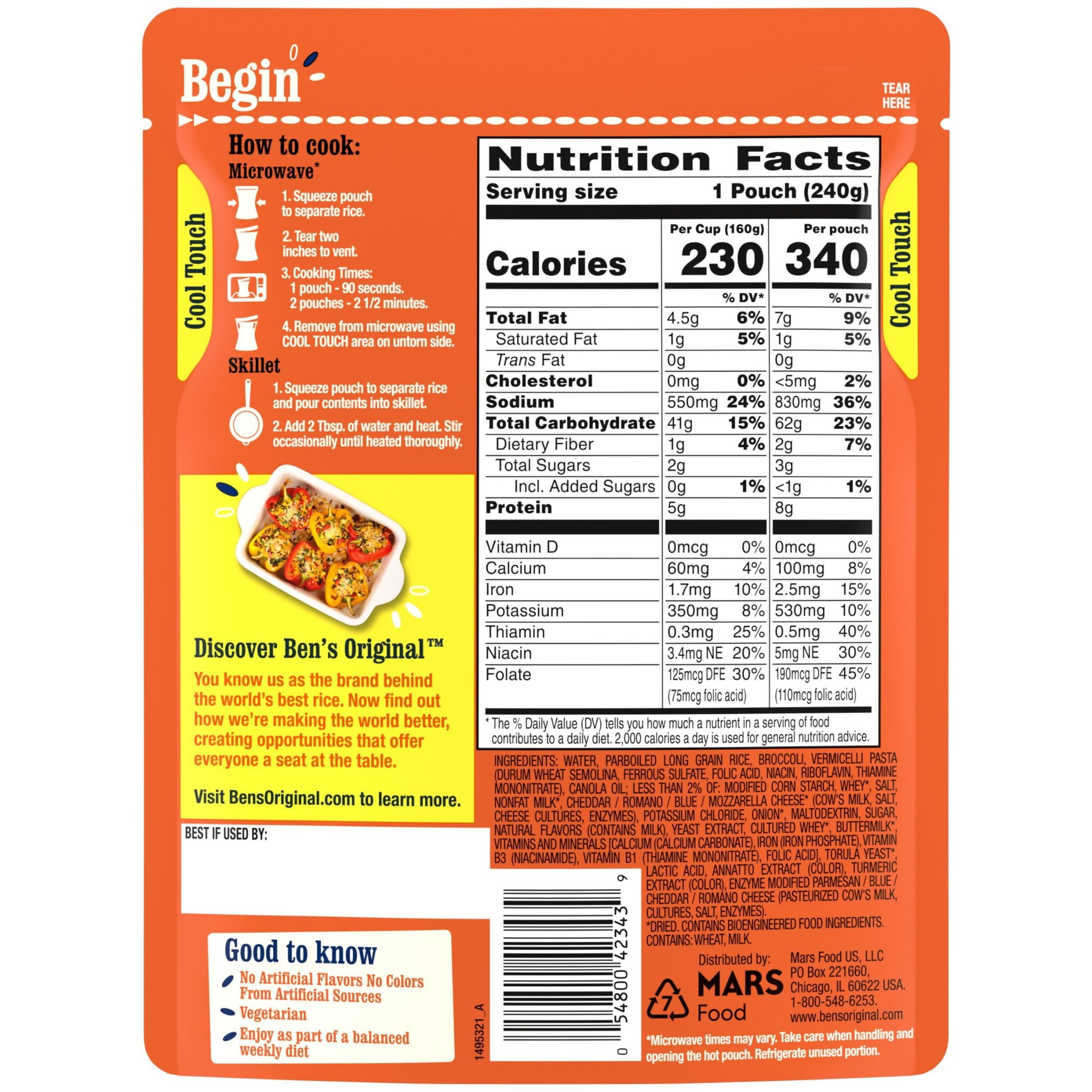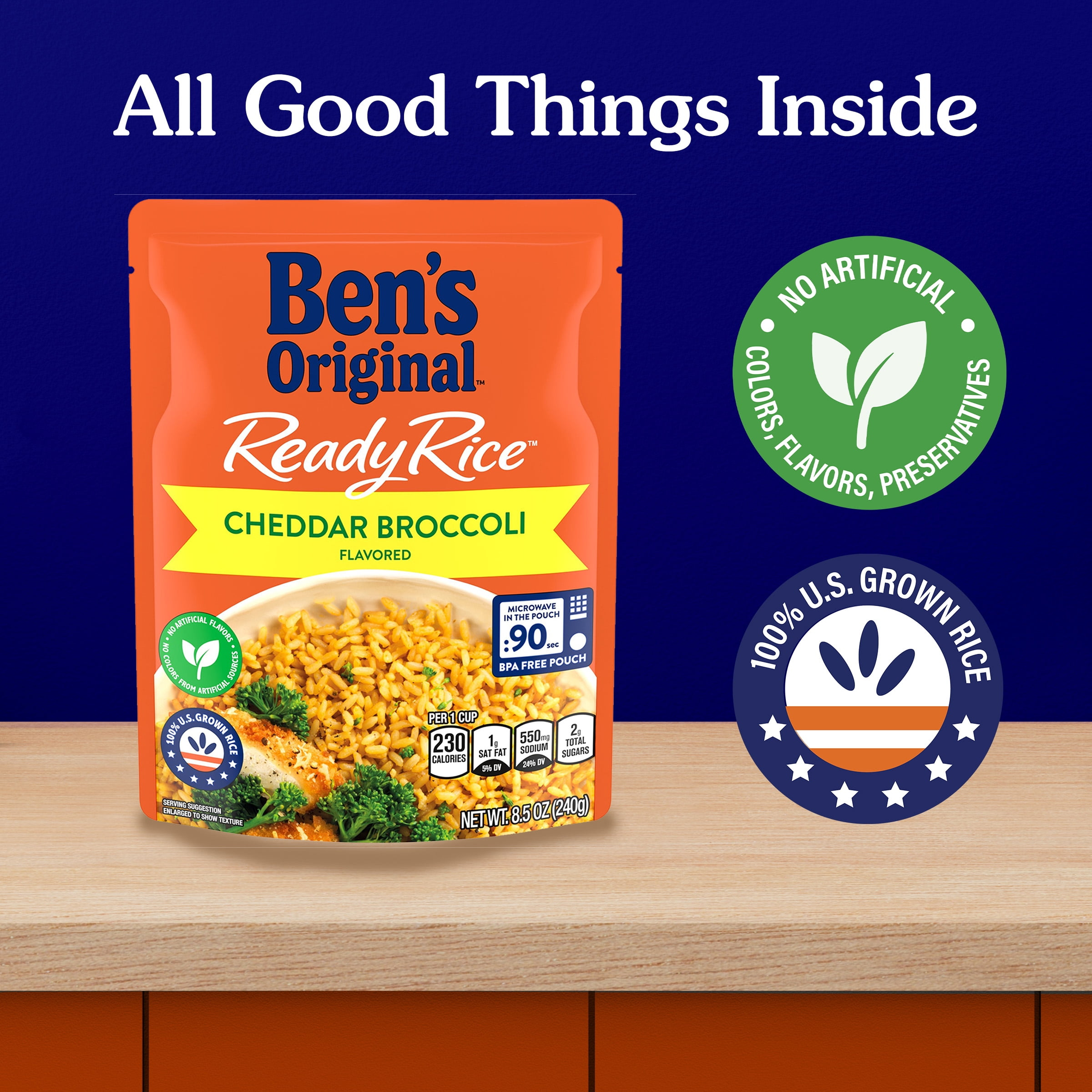 - One 8.5 oz pouch of BEN’S ORIGINAL Ready Rice Cheddar Broccoli Flavored Rice