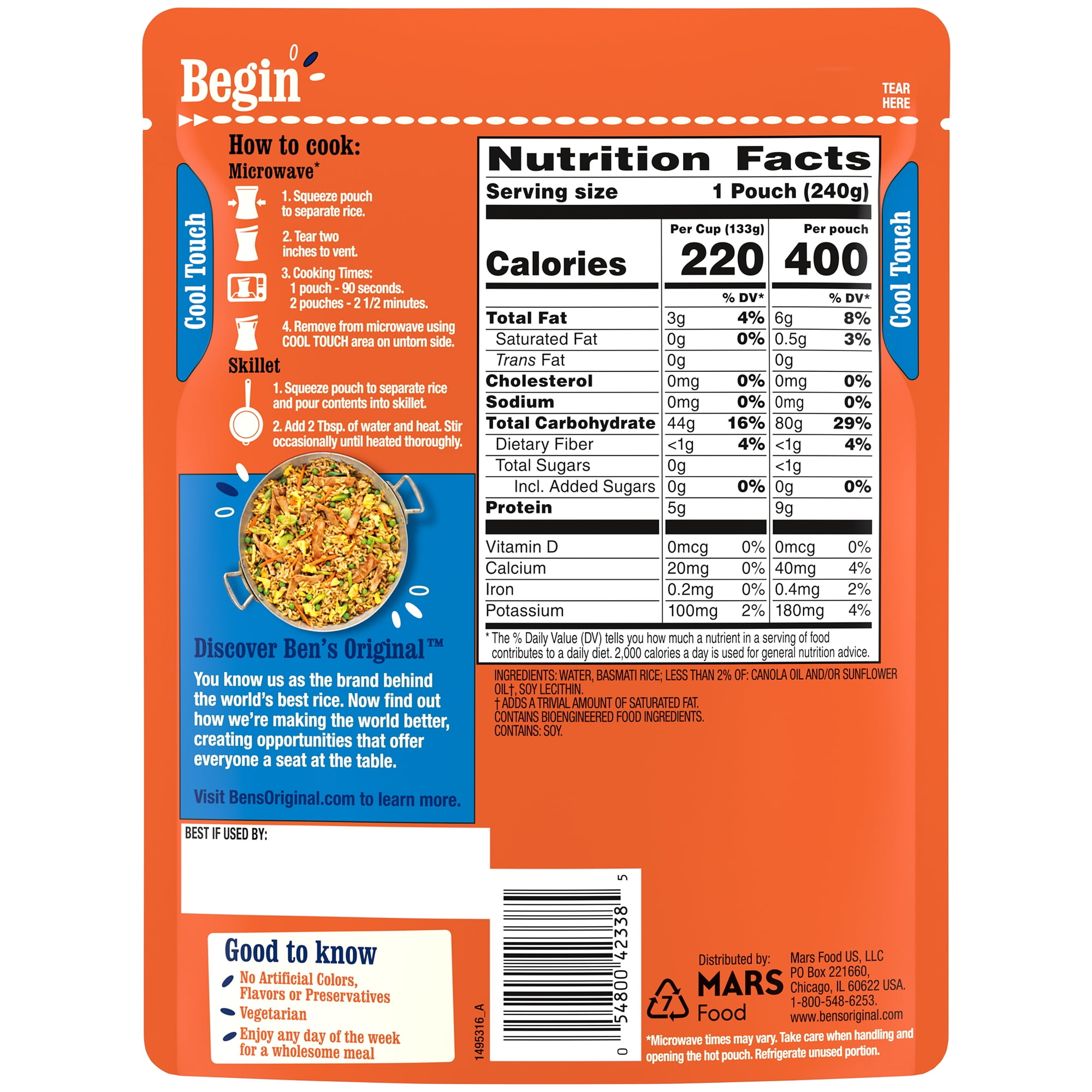BEN’S ORIGINAL Ready Rice Basmati Rice makes it easier than ever to create a tasty, globally inspired cooked rice meal. This authentic Indian rice comes fully cooked for your convenience, featuring long grains and a fine texture reminiscent of classic aromatic rice with a deliciously subtle, nutty flavor. BEN’S ORIGINAL Ready Rice comes in a BPA-free microwavable rice pouch for easy cooking without requiring any prep or cleanup. Cook this rice in the microwave for 90 seconds or pour it into a skillet and heat it thoroughly. Perfect as a flavorful rice side dish or part of a main course meal, pair this basmati rice with your favorite curries, braised or roasted meats, or serve it plain. This Indian rice is vegetarian, very low in sodium, contains no artificial flavors, no artificial colors, no preservatives, trans fat, or cholesterol and is low in saturated fat. BEN’S ORIGINAL is dedicated to creating meals and experiences that offer everyone a seat at the table.
