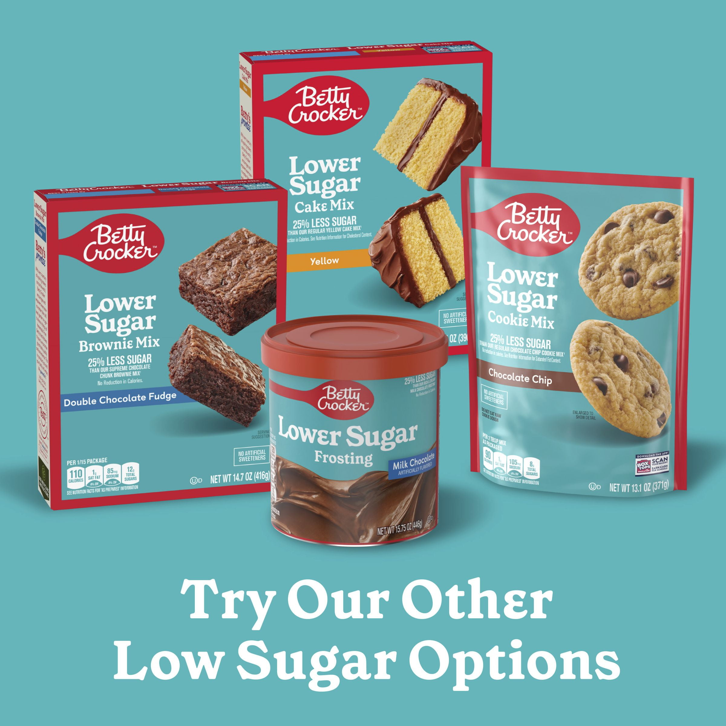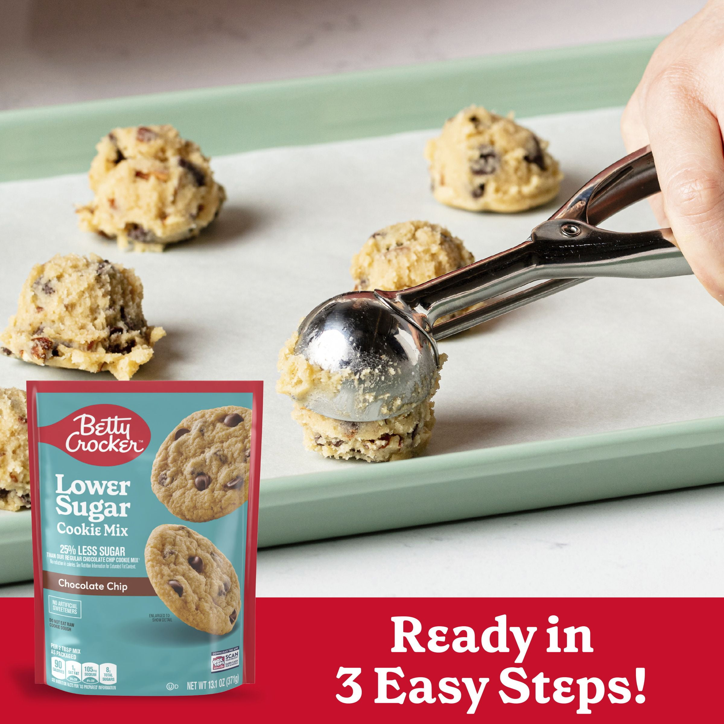 Prepare a dessert with the irresistible taste you expect from Betty Crocker and 25% less sugar than our regular chocolate chip cookie mix (Sugar content has been reduced from 12g to 8g per serving. No reduction in calories. See nutrition information for saturated fat content). Betty Crocker Lower Sugar Chocolate Chip Cookie Mix makes it easy to create cookies with irresistible flavor and without artificial sweeteners. In just a few minutes, you can take this dry baking mix from the box to the oven. Simply add butter and an egg, then bake according to package directions. Try topping cooled cookies with Betty Crocker Lower Sugar Frosting for a doubly delicious treat. Betty Crocker Lower Sugar Cookie Mix is ideal for a party, afternoon snack, or an anytime treat that can help you meet dietary needs. Keep a box in your pantry as a tasty addition to a lower sugar lifestyle. Betty’s got your back! For more than a century, Betty Crocker has been a popular creator of easy, delicious recipes. Today, the Betty Crocker kitchen is still providing convenient, tasty dessert mixes, frostings, and convenient meal options and side dishes.