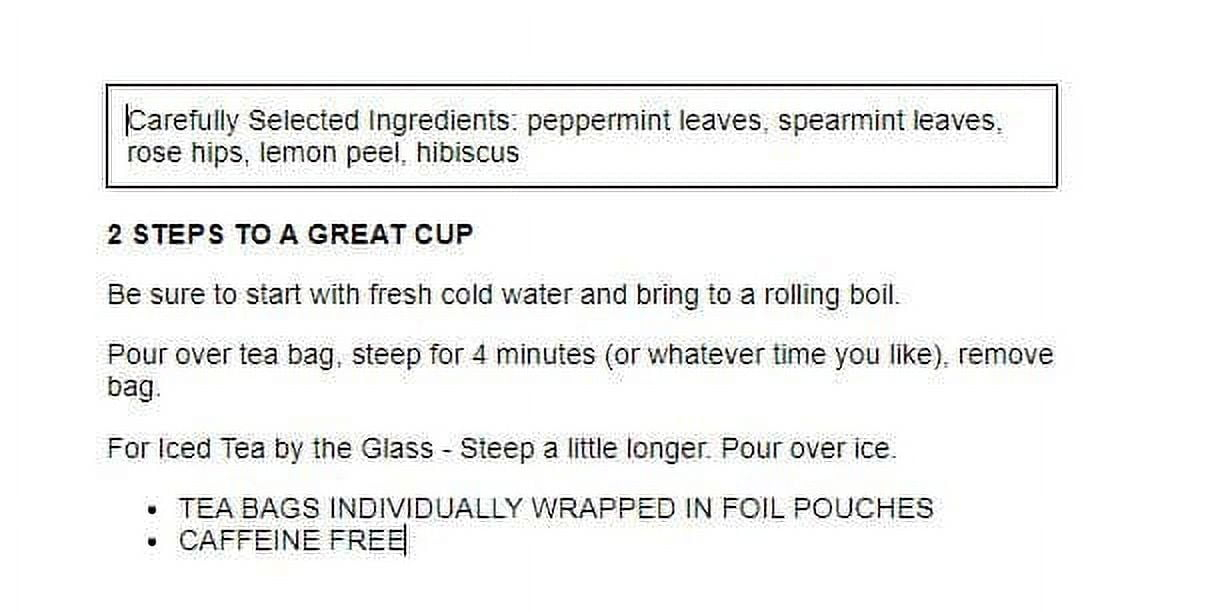 most teas just load up on peppermint extract. This tea’s flavor is peppermint forward but at least there’s other stuff going on too, with decent spearmint flavor to balance it out. Its an OK alternative while my regular brand is being price-gouged by third party sellers.