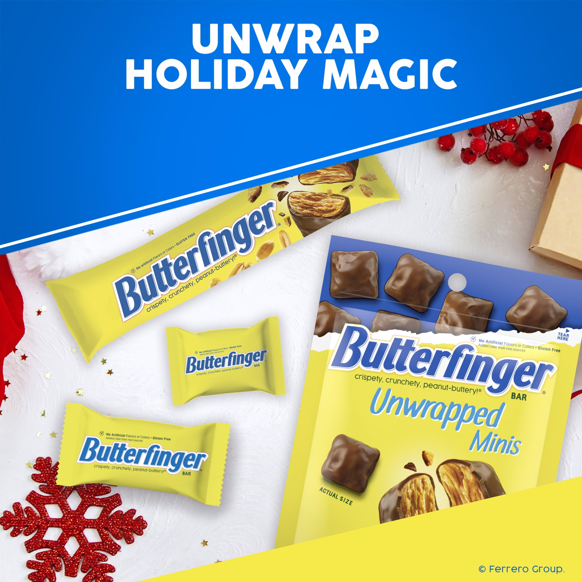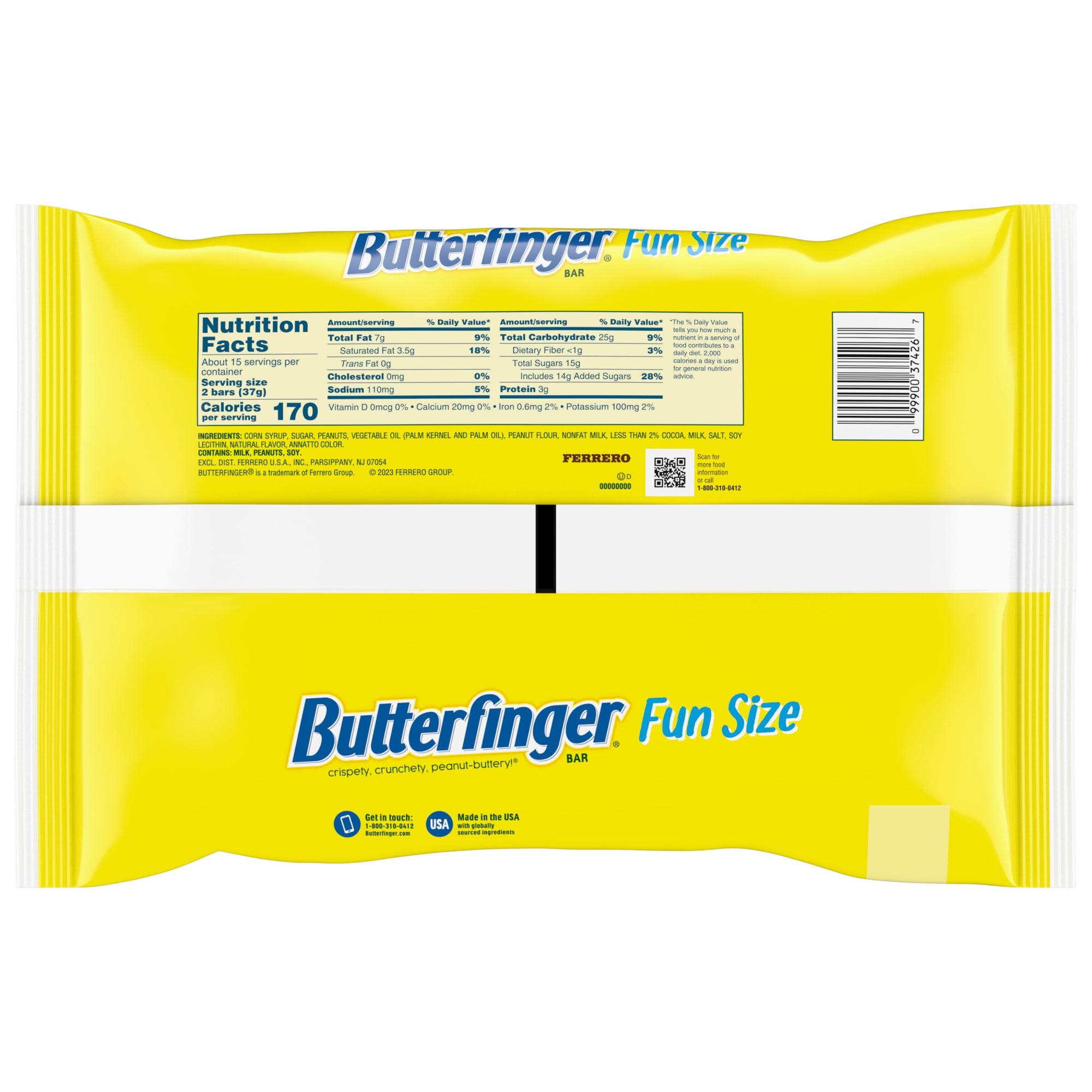 Get your treat on with Butterfinger Fun Size candy bars in a shareable bag. These fun sized bars are small in size but big on taste. Packed with the crispety, crunchety, peanut-buttery taste everyone loves, these candy treats are easy to snack on and enjoy. The shareable pack lets you take these delicious bars anywhere and share with anyone. They’re great for the home or office candy bowl, parties, get-togethers or a dessert sweet treat. Butterfinger is made with no artificial flavors or colors and is gluten-free.