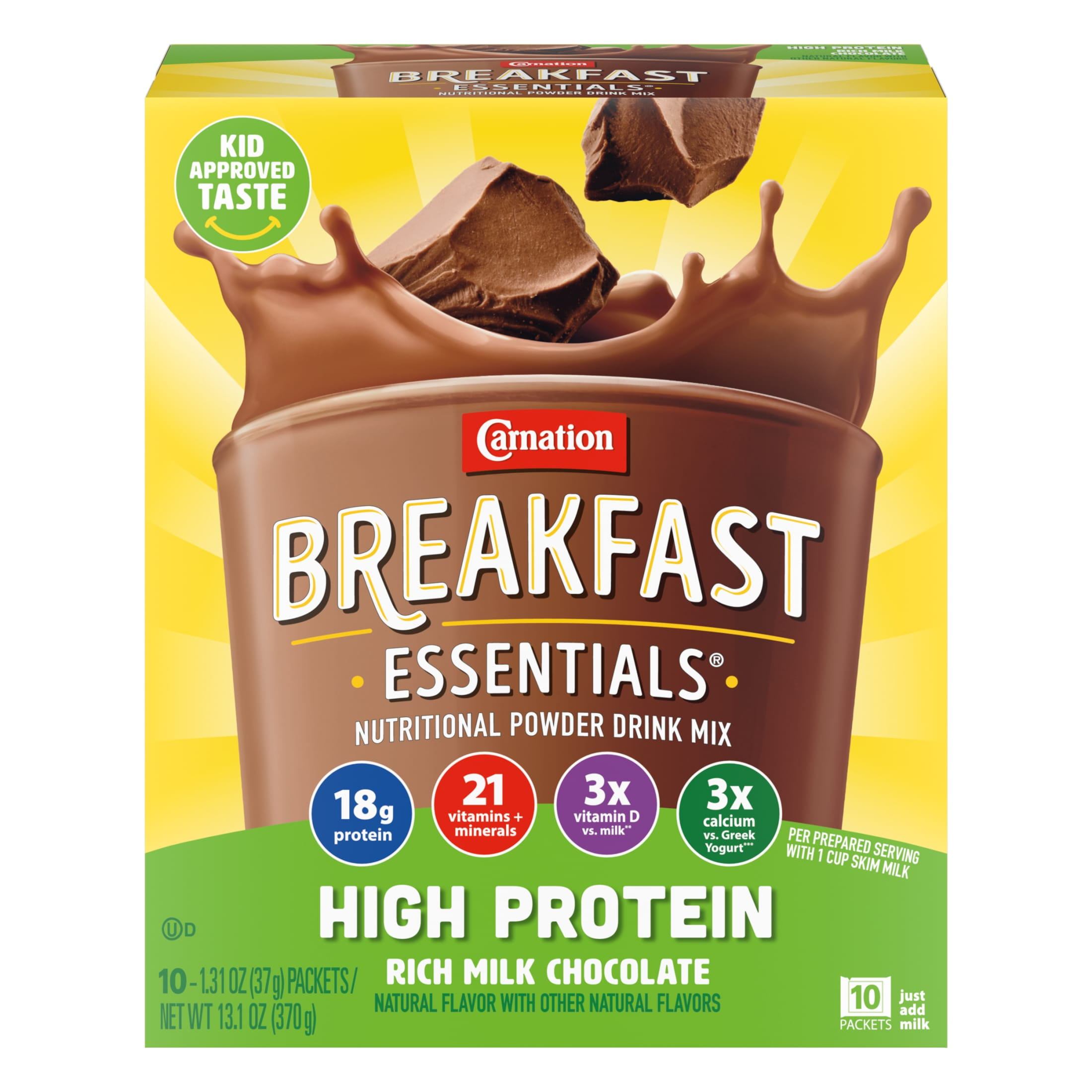 Carnation Breakfast Essentials High Protein Rich Milk Chocolate Nutritional Drink Mix is a powdered mix that is high in protein, to help build and maintain muscle. Start your day right with this chocolate drink mix that contains 18 grams of protein and 220 calories when prepared as directed with 1 cup of skim milk. Carnation Breakfast Essentials High Protein Rich Milk Chocolate powder drink mix is a quick and convenient protein shake for families to get the protein, vitamins and minerals they need to kick off their day. Each prepared serving of this breakfast drink powder has 21 vitamins and minerals, including three times the amount of Vitamin D as an eight fluid ounce glass of milk and three times as much calcium as a 5.3 ounce cup of Greek yogurt. These powdered nutritional drinks are great at home or on the go, for breakfast or between meals. The box includes ten 37 gram powder of breakfast shakes for enjoying on the go. Carnation Breakfast Essentials nutritional shakes make it easy to start your day with good breakfast nutrition. Nutritionally appropriate for ages 9 years and older, including teens and adults.