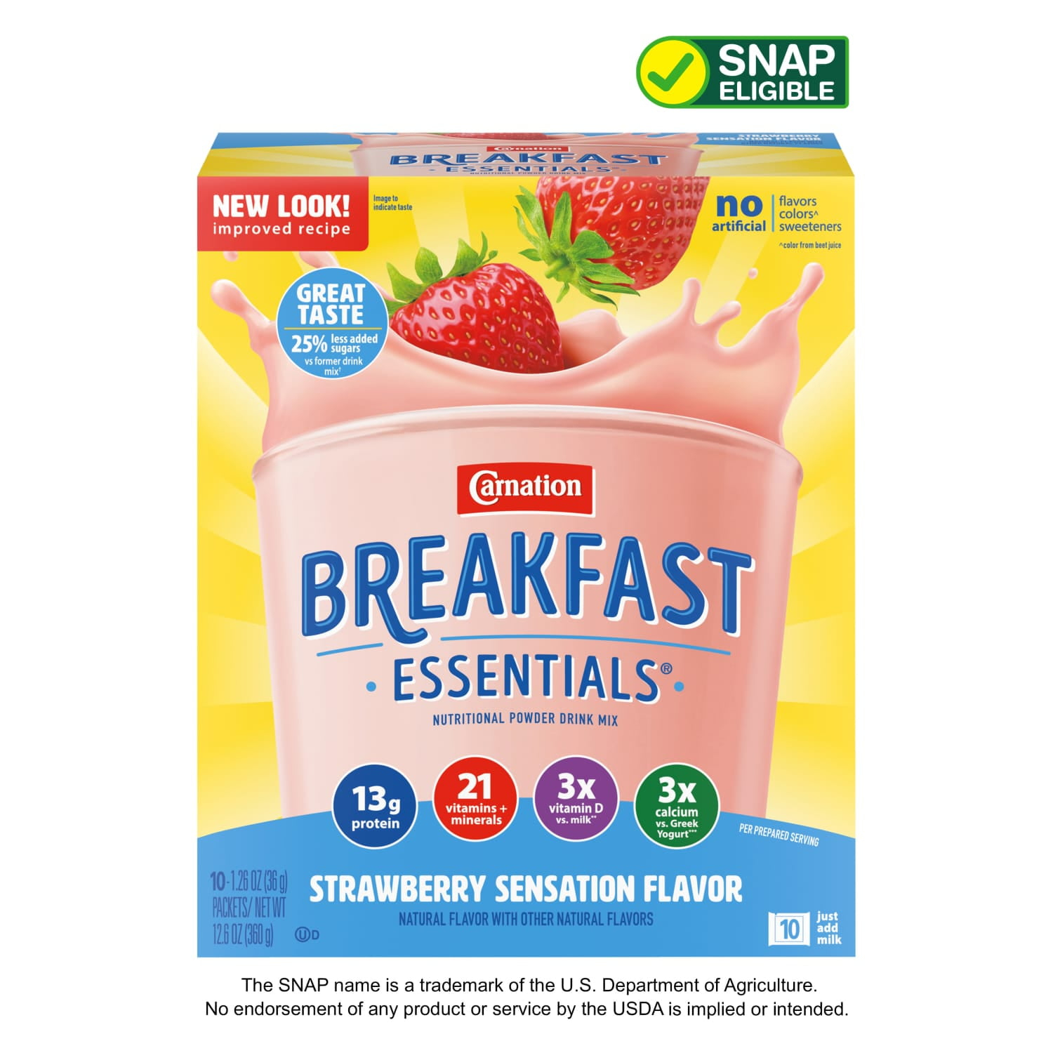 Carnation Breakfast Essentials Strawberry Sensation Flavor Nutritional Drink mix is a powdered mix that makes a delicious breakfast drink the whole family will love—just mix with 1 cup of skim milk. Start your day right with this strawberry drink mix that contains 13 grams of protein and 220 calories per prepared serving. Carnation Breakfast Essentials Strawberry Sensation Flavor powder drink mix is a quick and convenient way for families to get the protein, vitamins and minerals they need to kick off their day. Each prepared serving has 21 vitamins and minerals, including three times the amount of Vitamin D as an eight fluid ounce glass of milk and three times as much calcium as a 5.3 ounce cup of Greek yogurt. These powdered nutritional drinks are great at home or on the go or between meals. The box includes ten 36 gram powder packets for enjoying on the go. Carnation Breakfast Essentials nutritional shakes make it easy to start your day with good breakfast nutrition. Nutritionally appropriate for ages 4 years and older, including teens and adults.