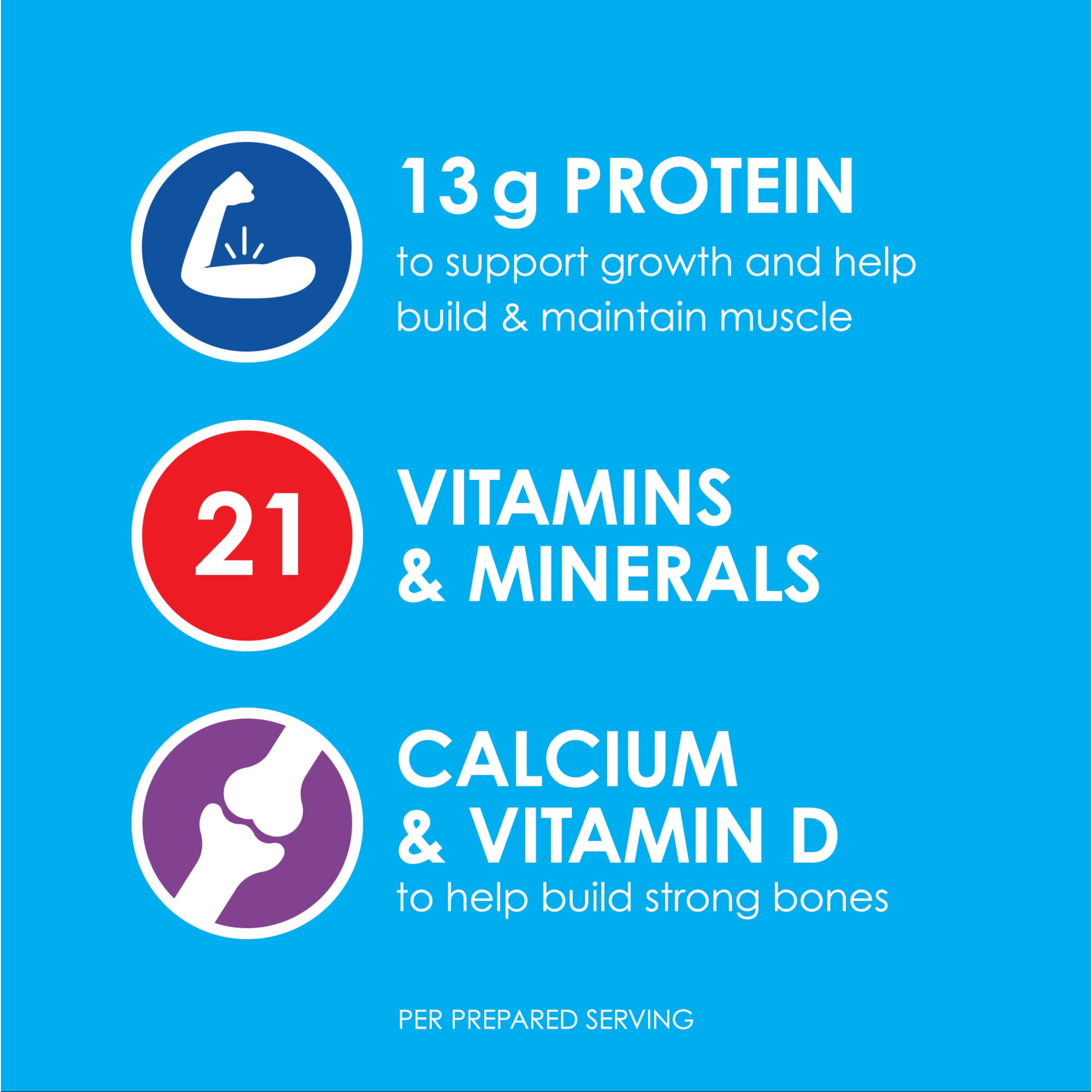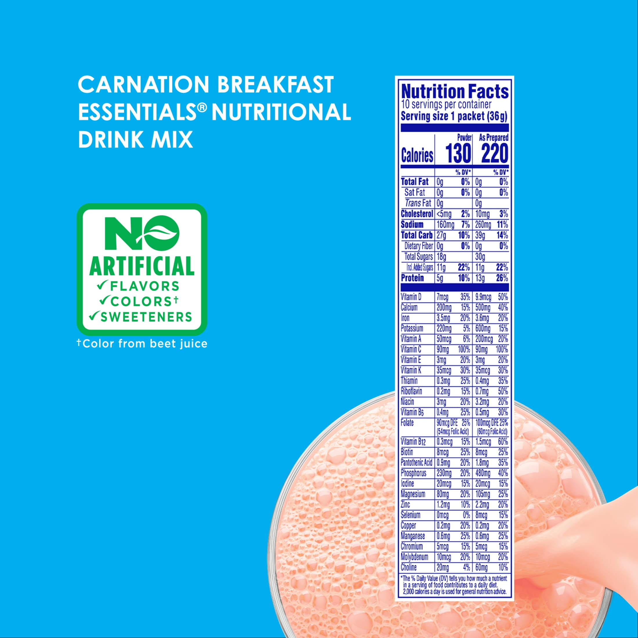 Carnation Breakfast Essentials Strawberry Sensation Flavor Nutritional Drink mix is a powdered mix that makes a delicious breakfast drink the whole family will love—just mix with 1 cup of skim milk. Start your day right with this strawberry drink mix that contains 13 grams of protein and 220 calories per prepared serving. Carnation Breakfast Essentials Strawberry Sensation Flavor powder drink mix is a quick and convenient way for families to get the protein, vitamins and minerals they need to kick off their day. Each prepared serving has 21 vitamins and minerals, including three times the amount of Vitamin D as an eight fluid ounce glass of milk and three times as much calcium as a 5.3 ounce cup of Greek yogurt. These powdered nutritional drinks are great at home or on the go or between meals. The box includes ten 36 gram powder packets for enjoying on the go. Carnation Breakfast Essentials nutritional shakes make it easy to start your day with good breakfast nutrition. Nutritionally appropriate for ages 4 years and older, including teens and adults.
