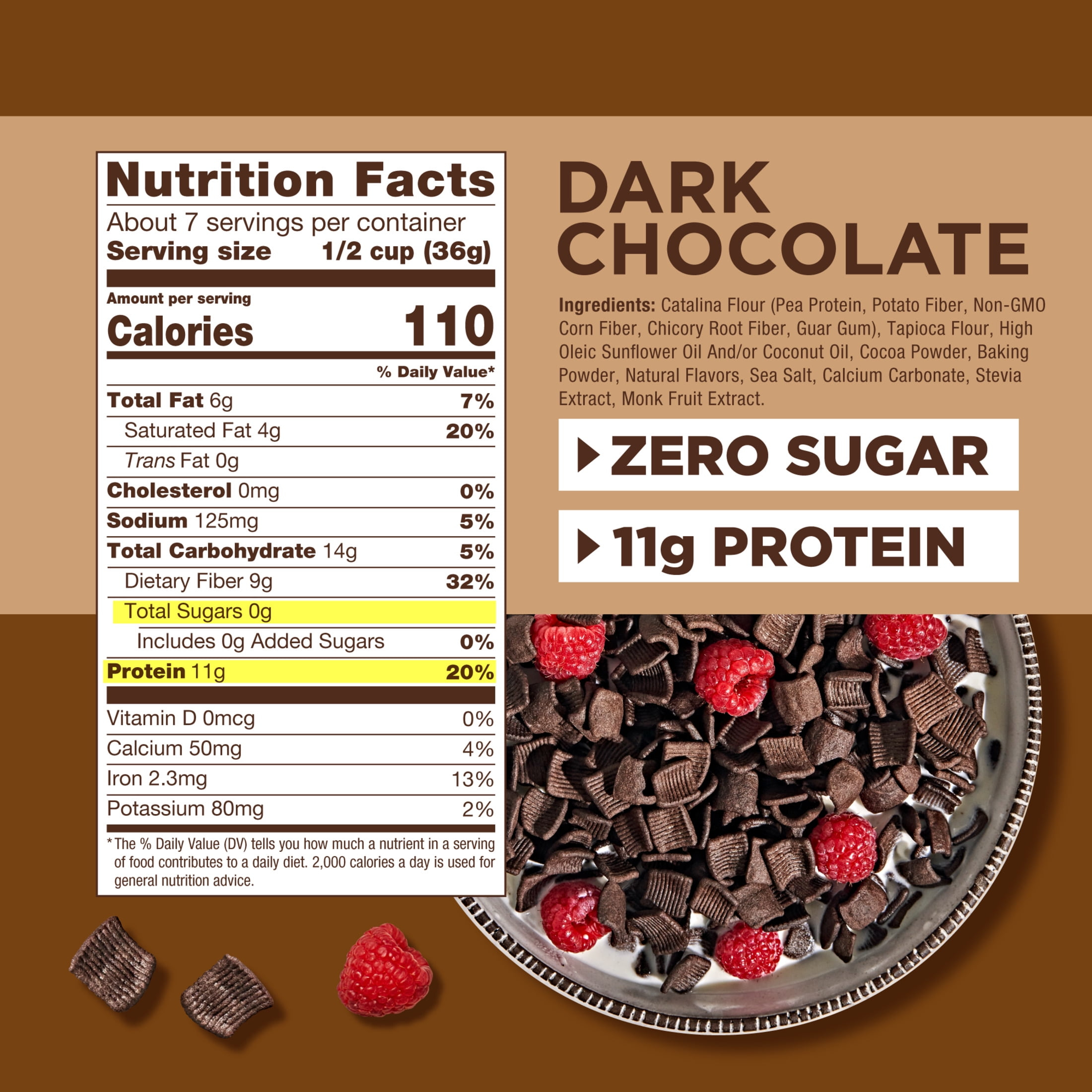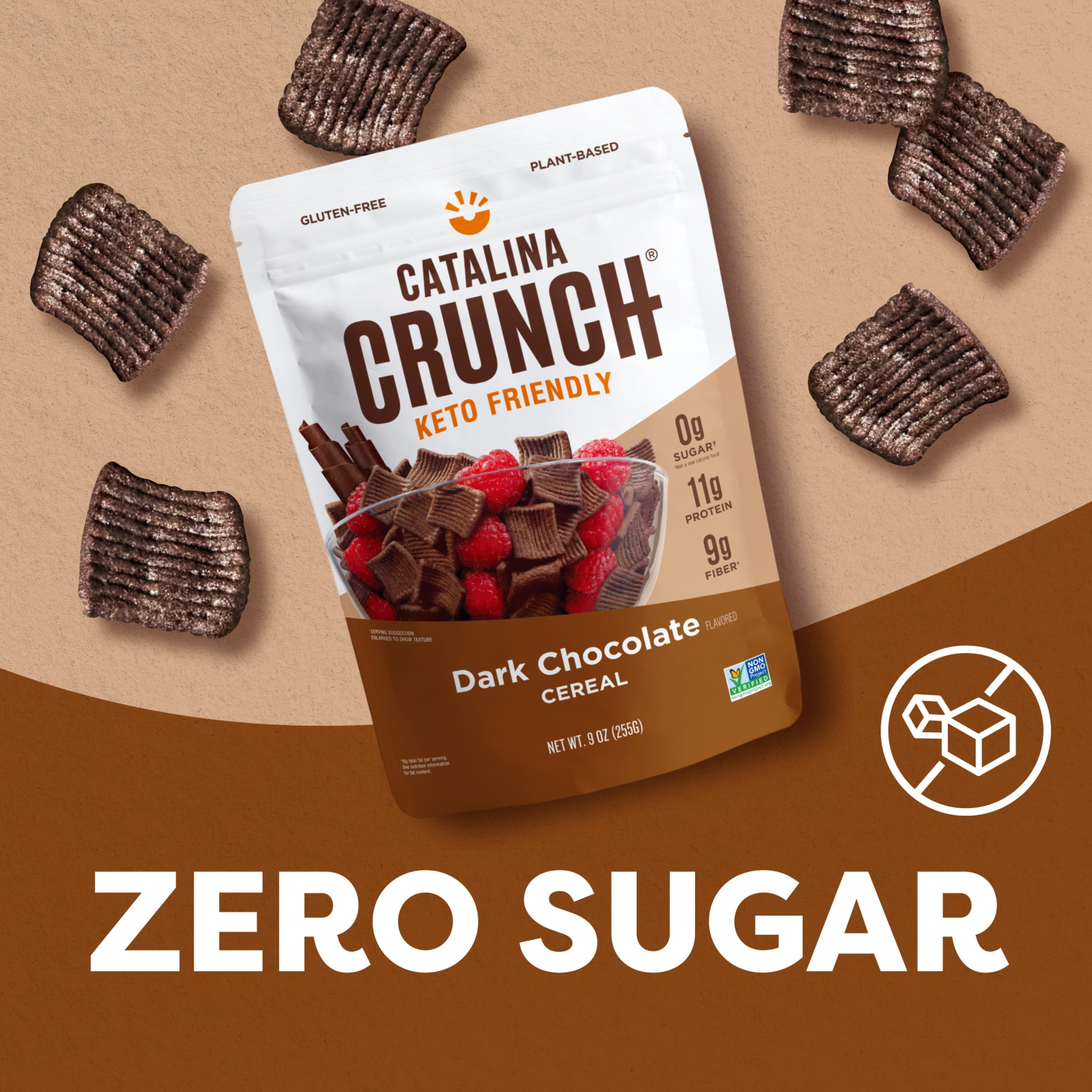 Catalina Crunch Dark Chocolate Zero Sugar Cereal is made with the same delicious taste and crunch of your childhood favorites. Featuring 11 grams of plant-based protein and 9 grams of fiber with zero sugar, this keto friendly, protein-rich cereal is made from specially curated natural ingredients. All Catalina Crunch cereals are sweetened with stevia making them free of added sugars, gluten-free, plant-based, vegan, and Non-GMO Project Verified. Catalina Crunch Cereal has no artificial ingredients, and no added sugars so you can enjoy it without worry.