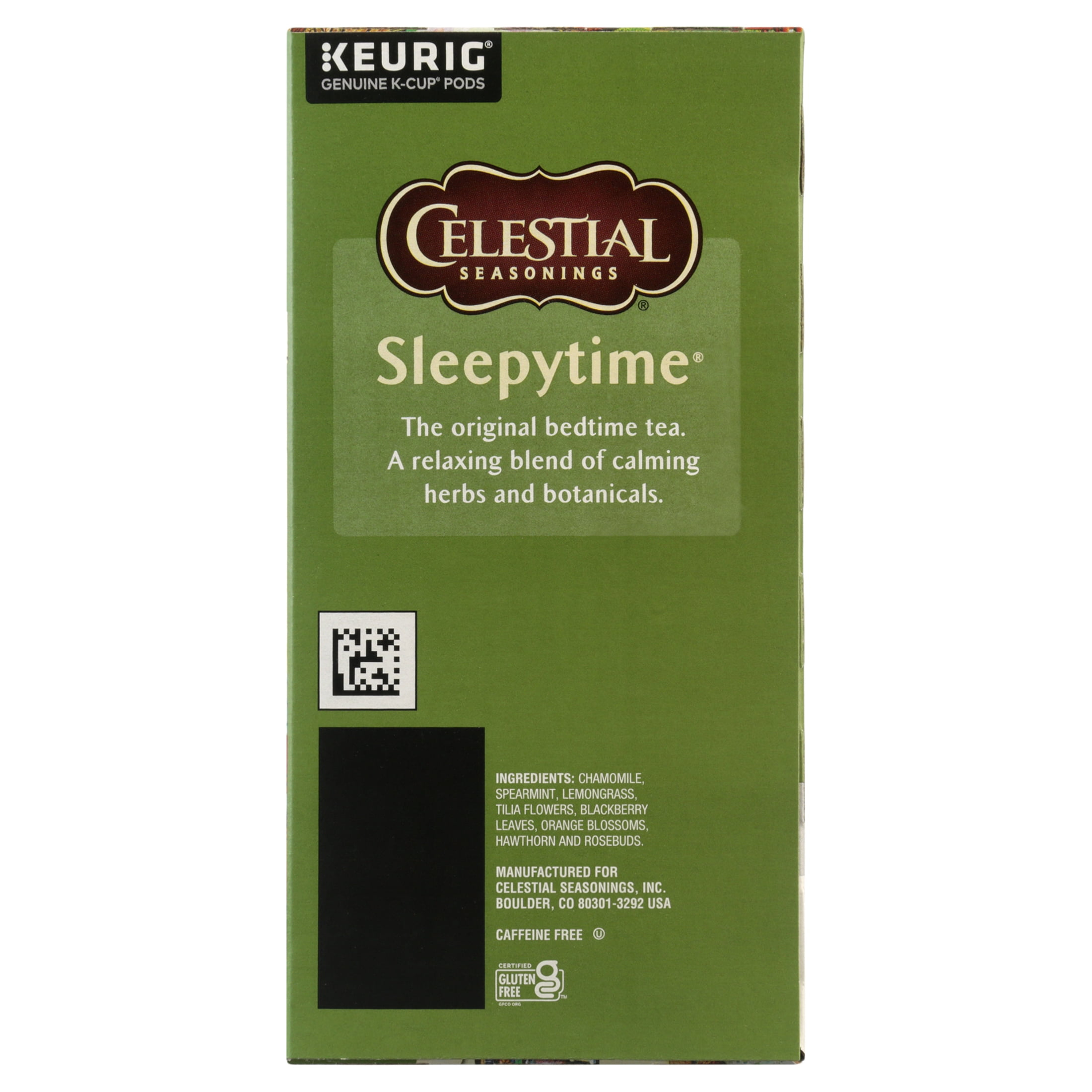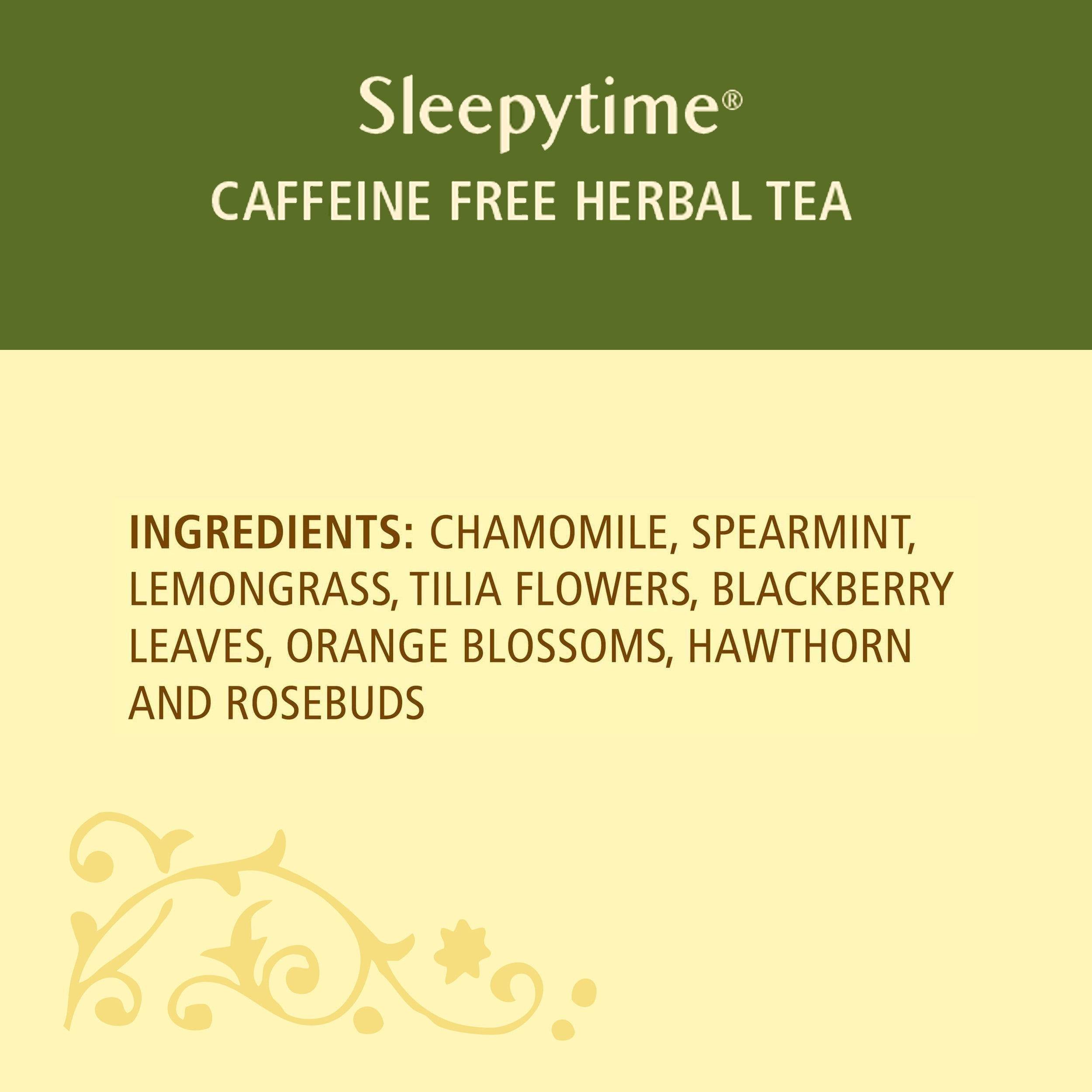 Celestial Seasonings Sleepytime Herbal Tea is the perfect cup to add to your bedtime routine. Our caffeine- and gluten-free tea contains chamomile, spearmint and lemongrass for a cool, calming blend with an aromatic finish. We achieve this flavor profile without the use of any artificial flavors, colors or preservatives. To reduce excess waste, our tea come packaged in recycled boxes. A comforting blend of chamomile and spearmint creates a lullaby of tender flavor to soothe your senses. The part of your day shared with Sleepytime is like coming home to find a friend waiting for you by the fire. There’s no calm like the sigh from the spirit when you take this moment for rest and reflection … there’s no time like Sleepytime.
