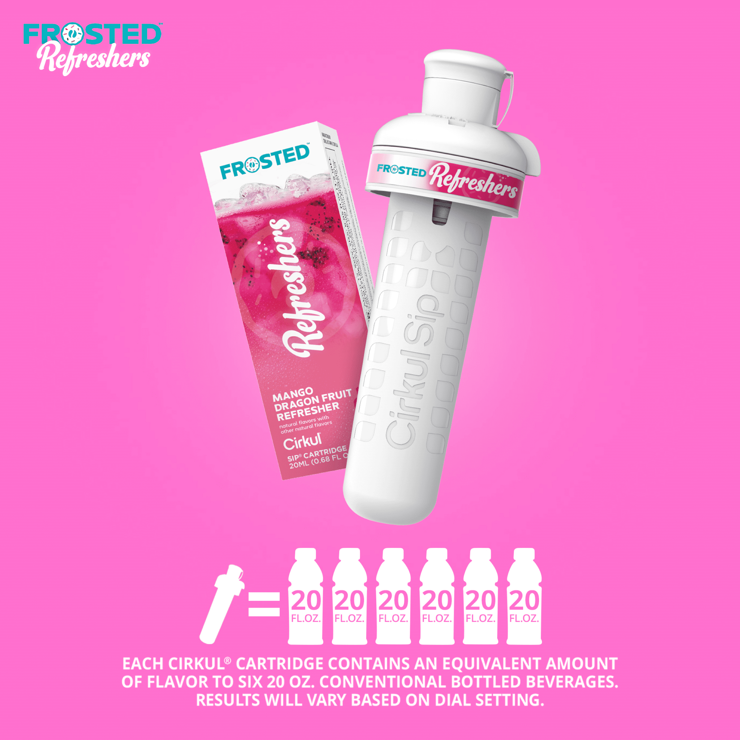 - Each Cirkul Cartridge contains an equivalent amount of flavor to six 20 oz. conventional bottled beverages. Results will vary based on dial setting.