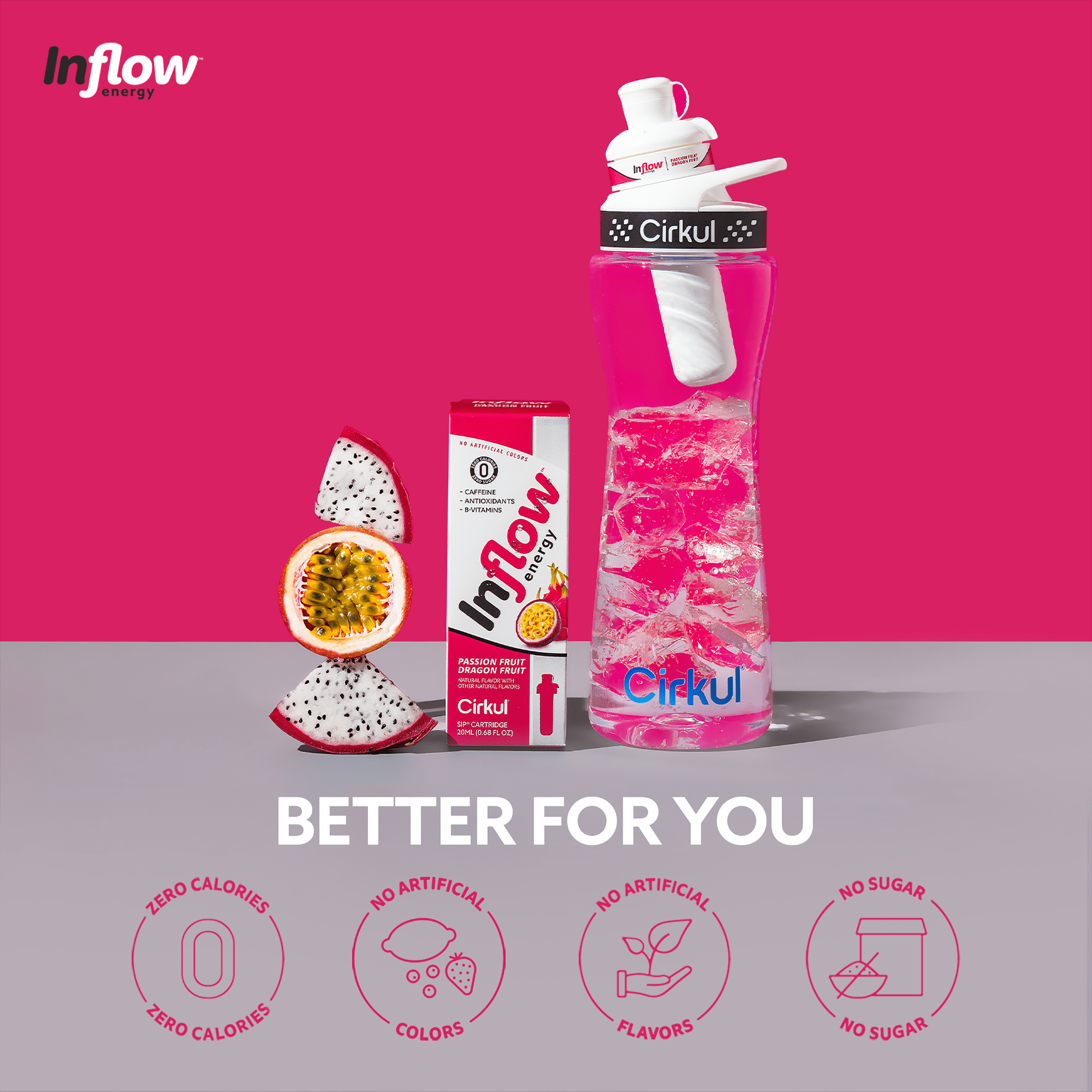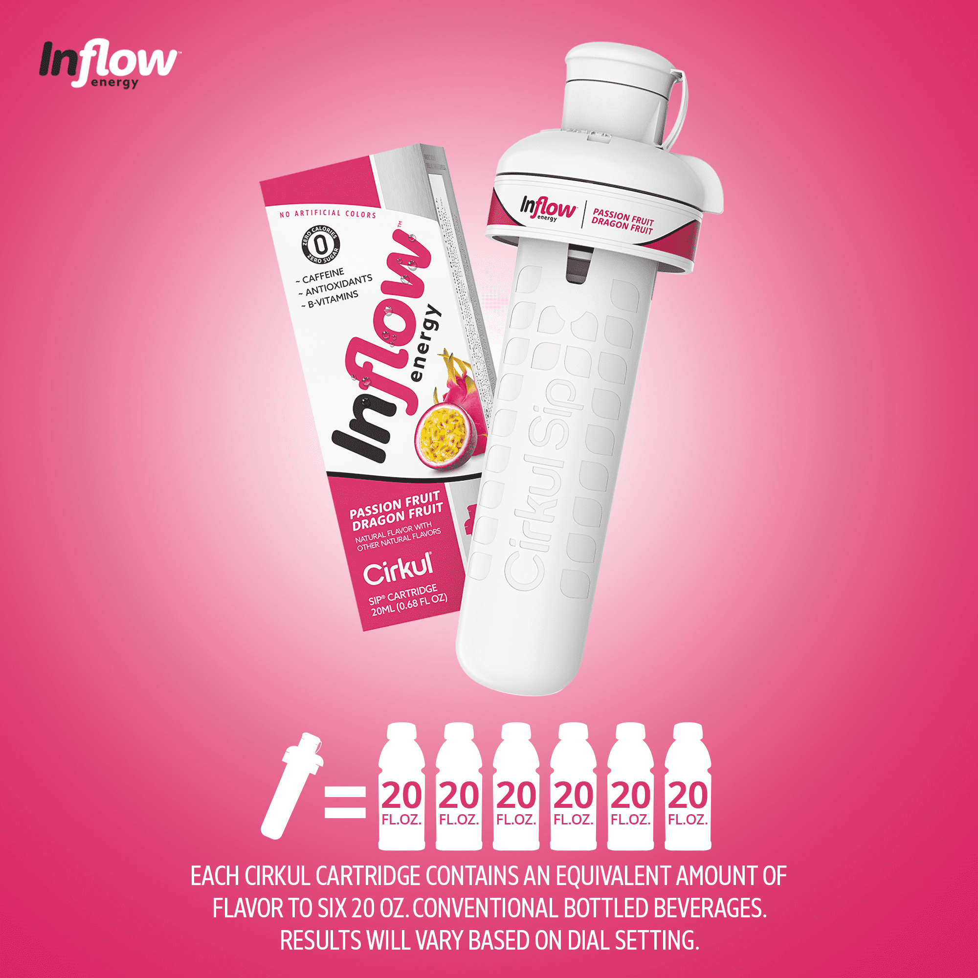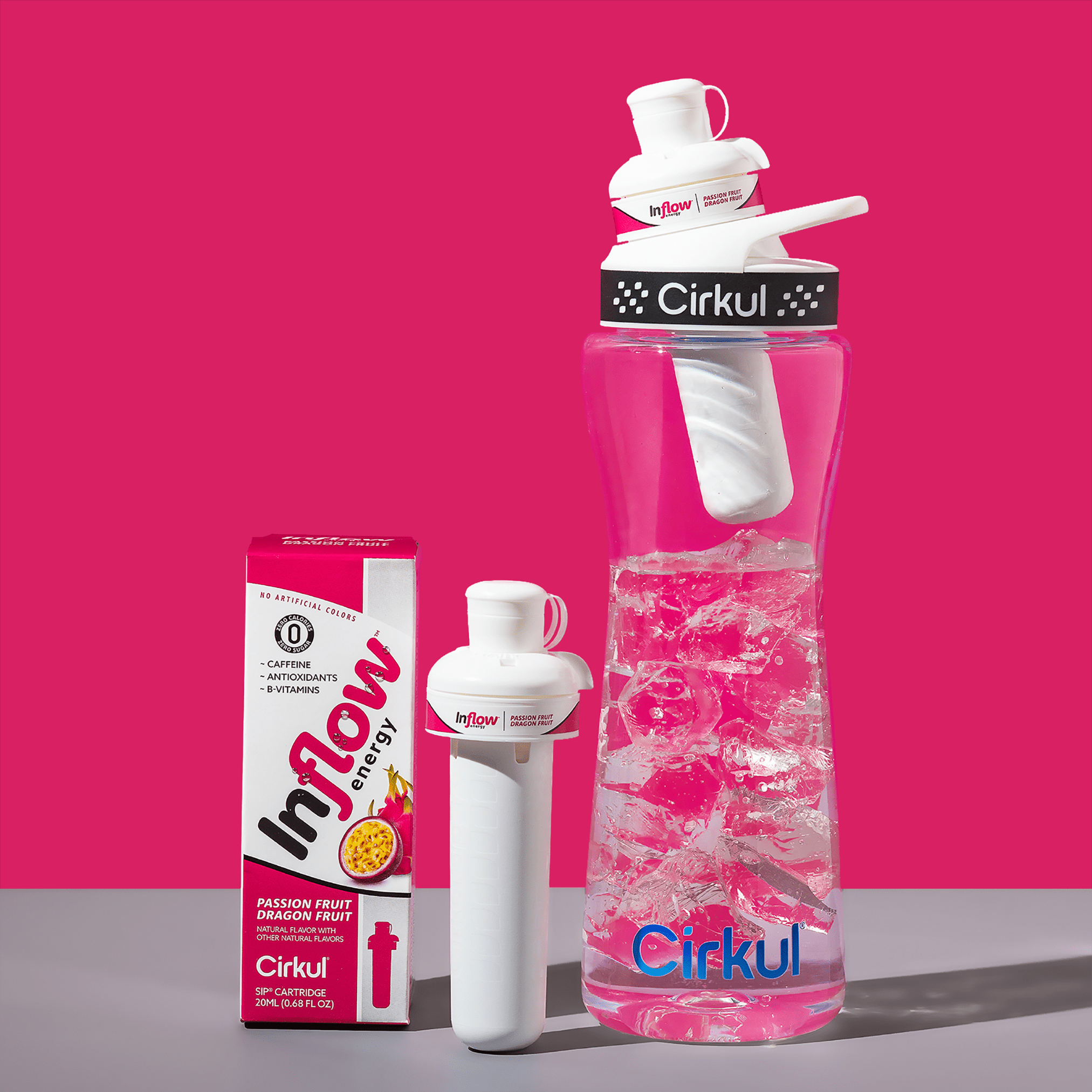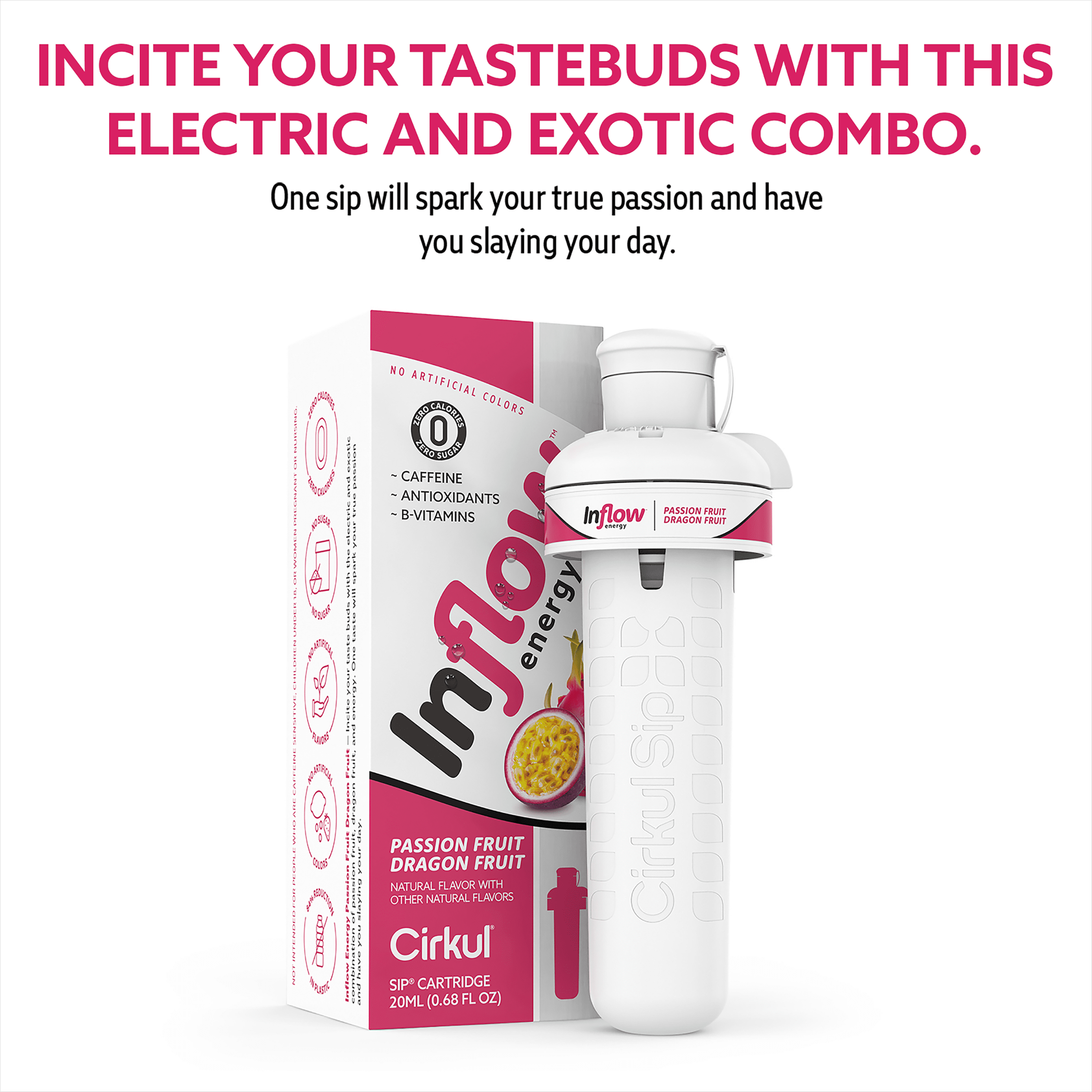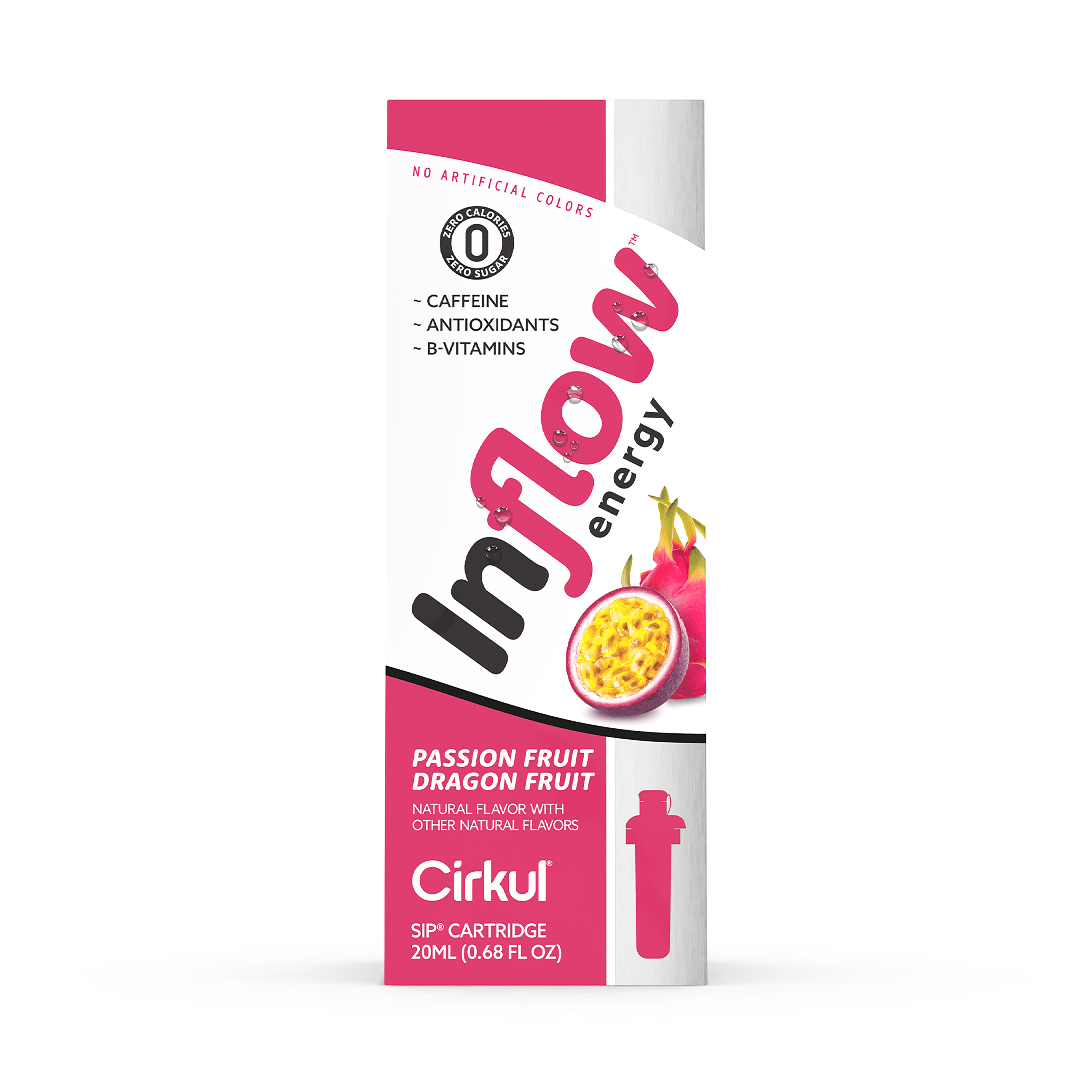 Incite your taste buds with the electric and exotic combination of passion fruit, dragonfruit, and energy. One taste will spark your true passion and have you slaying your day. This Inflow Energy Concentrated Flavor Cartridge contains caffeine, B vitamins, and taurine to get you in the flow. It is optimized with green tea and ginger root extracts, is dairy-free, and contains zero sugar and no artificial colors. We understand that drinking enough water can be challenging. At Cirkul, our mission is to make drinking water delicious, convenient, and fun.
