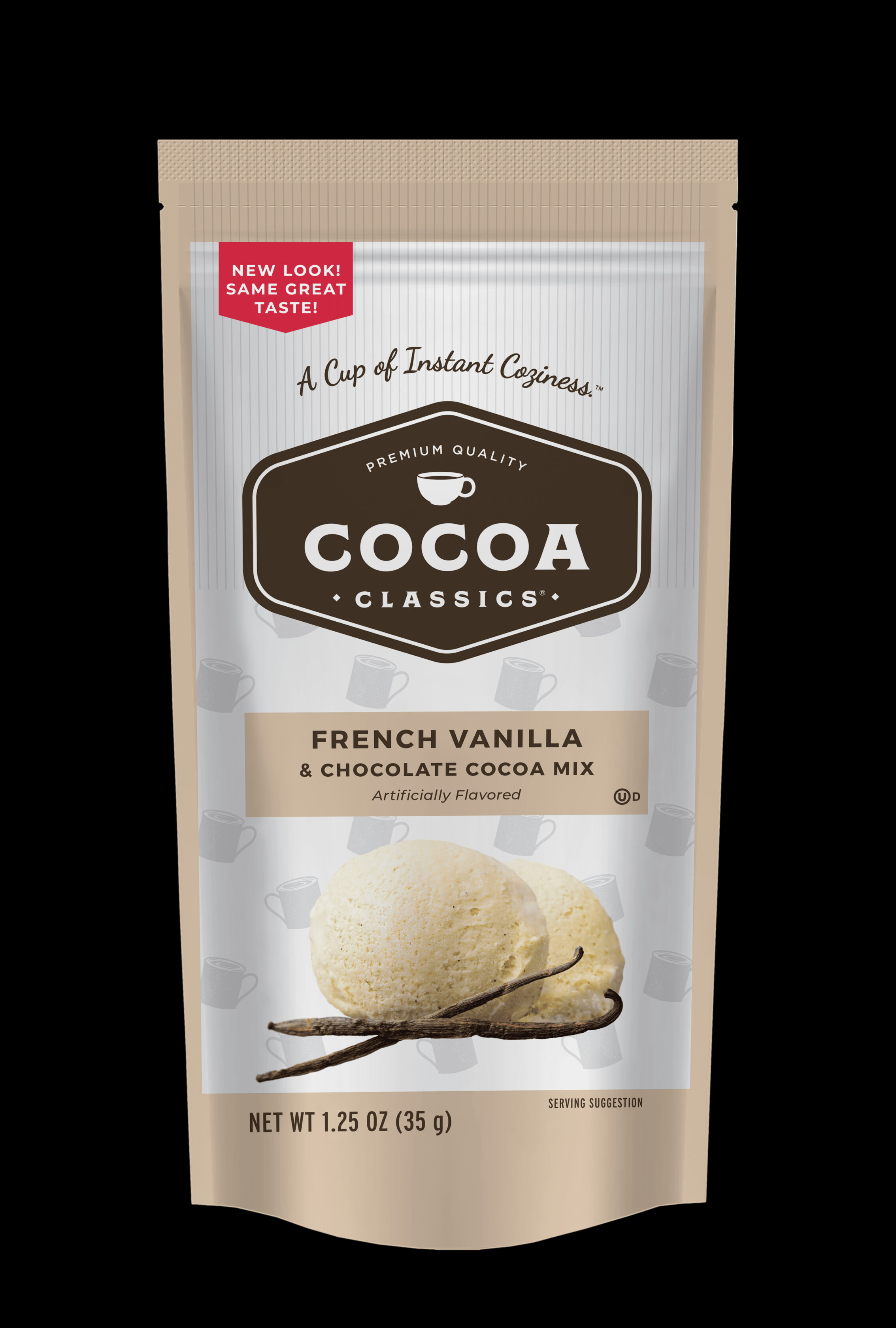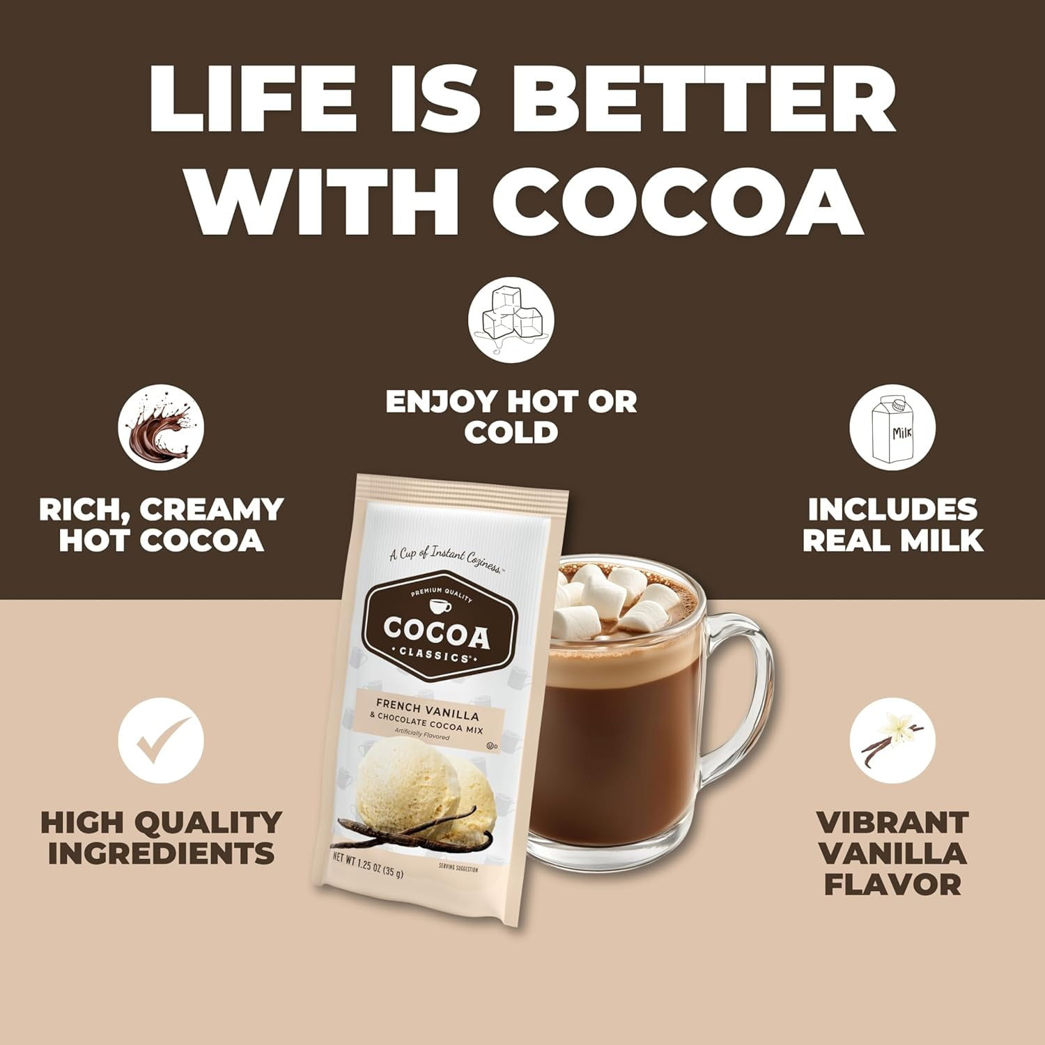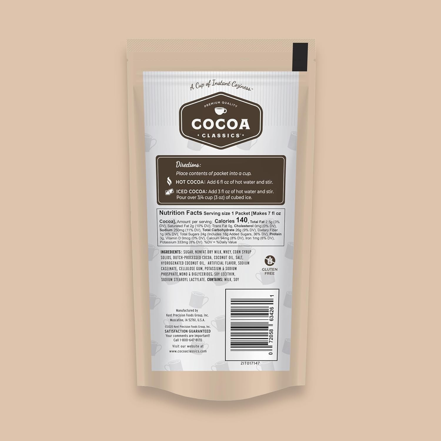 Let Cocoa Classics immerse you in a pool of delectable flavors. The rich chocolate cocoa crowned with a dense, decadent froth is sure to evoke warm memories of family and friends. Each flavor delicately balances cocoa, creaminess, and sweetness. Our classic dessert-inspired flavors are made from Dutch processed cocoa for smooth flavor and nonfat dry milk for a creamy froth, delivering that luscious cup of hot cocoa you expect from the Cocoa Classics family. Traditionally the perfect pick-me-up for cold days and rainy afternoons, it is a Cup of Instant Coziness™. Cocoa Classics instant hot cocoa is made using nonfat dry milk, so just add hot water for a rich, creamy, velvety cocoa. Place contents of packet into a cup. HOT COCOA: Add 6 fl oz of hot water and stir. ICED COCOA: Add 3 fl oz of hot water and stir. Pour over 3/4 cup (3 oz) of cubed ice.