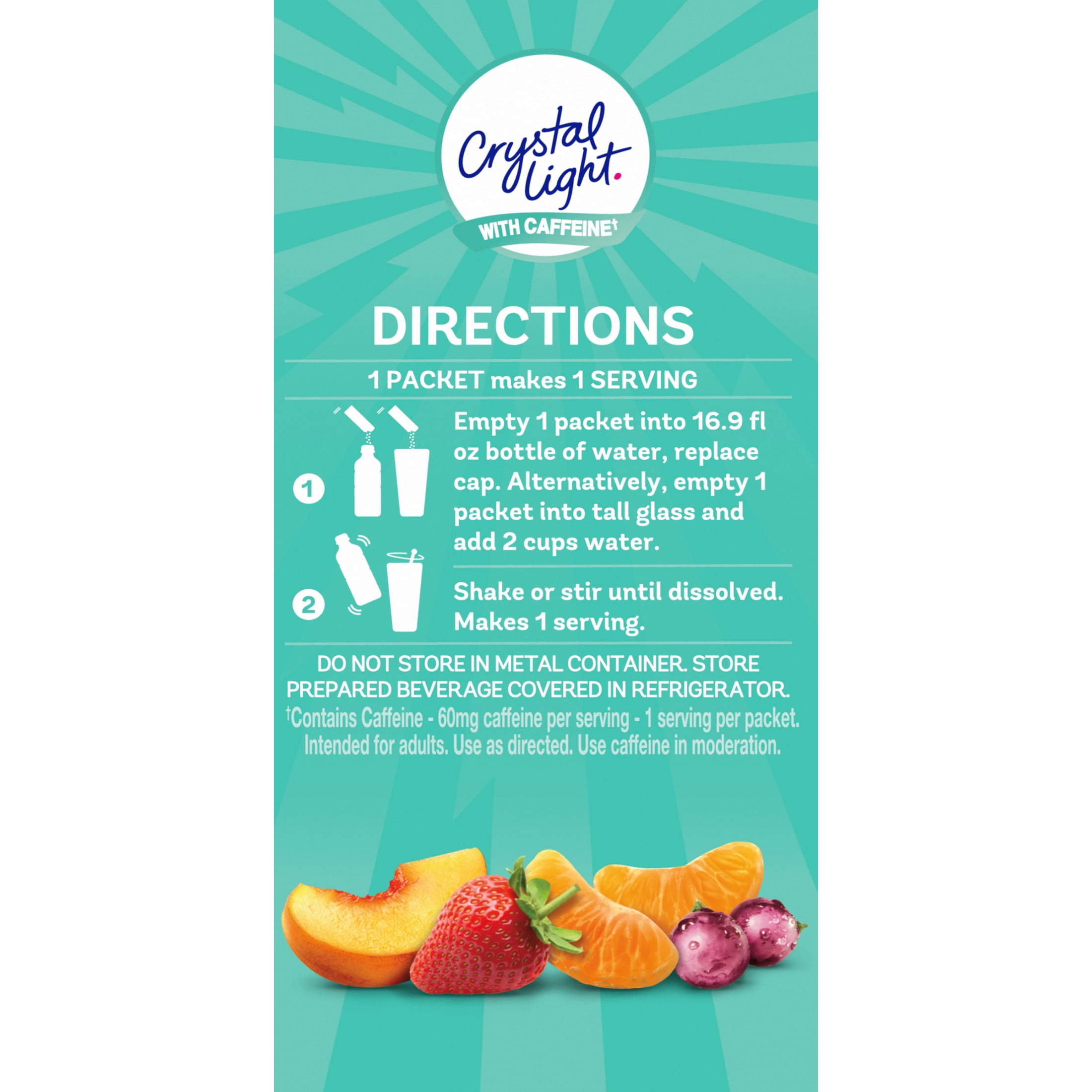The perfect caffeinated pick-me-up, no matter where you are! Crystal Light Energizing Variety Pack, 44 ct. On-the-Go Packets includes 11 packets each of natrually flavored peach mango with other natural flavors, artificially flavored wild strawberry, naturally flavored citrus and naturally flavored grape with other natural flavors drink mix. Every single-serve packet contains 60mg of caffeine, giving you an added boost of energy to conquer your day. With zero grams sugar and 90% fewer calories than leading beverages (Per 16 fl oz, this product is 5 -10 calories, leading beverages are 130 calories), Crystal Light is a great, guilt-free alternative to soda or juice. Each drink mix single makes one serving, allowing you to always keep some on hand. To prepare, simply empty one packet into a 16.9 oz. bottle or cup of water and shake or stir. Our caffeinated drink mixes are a great choice for when you are looking for a refreshing way to stay ahead of your busiest days.