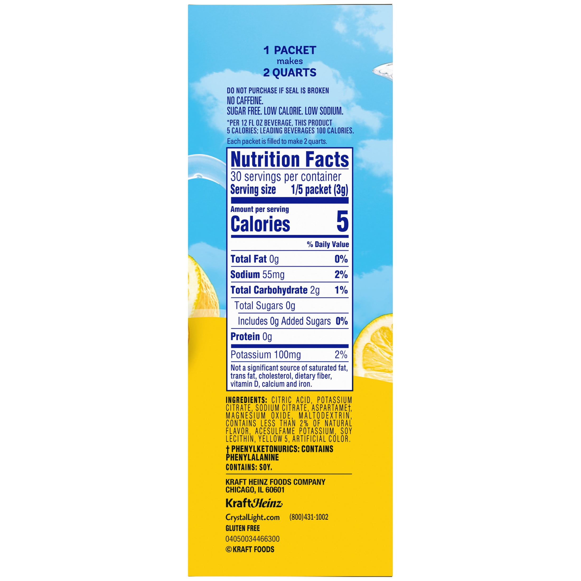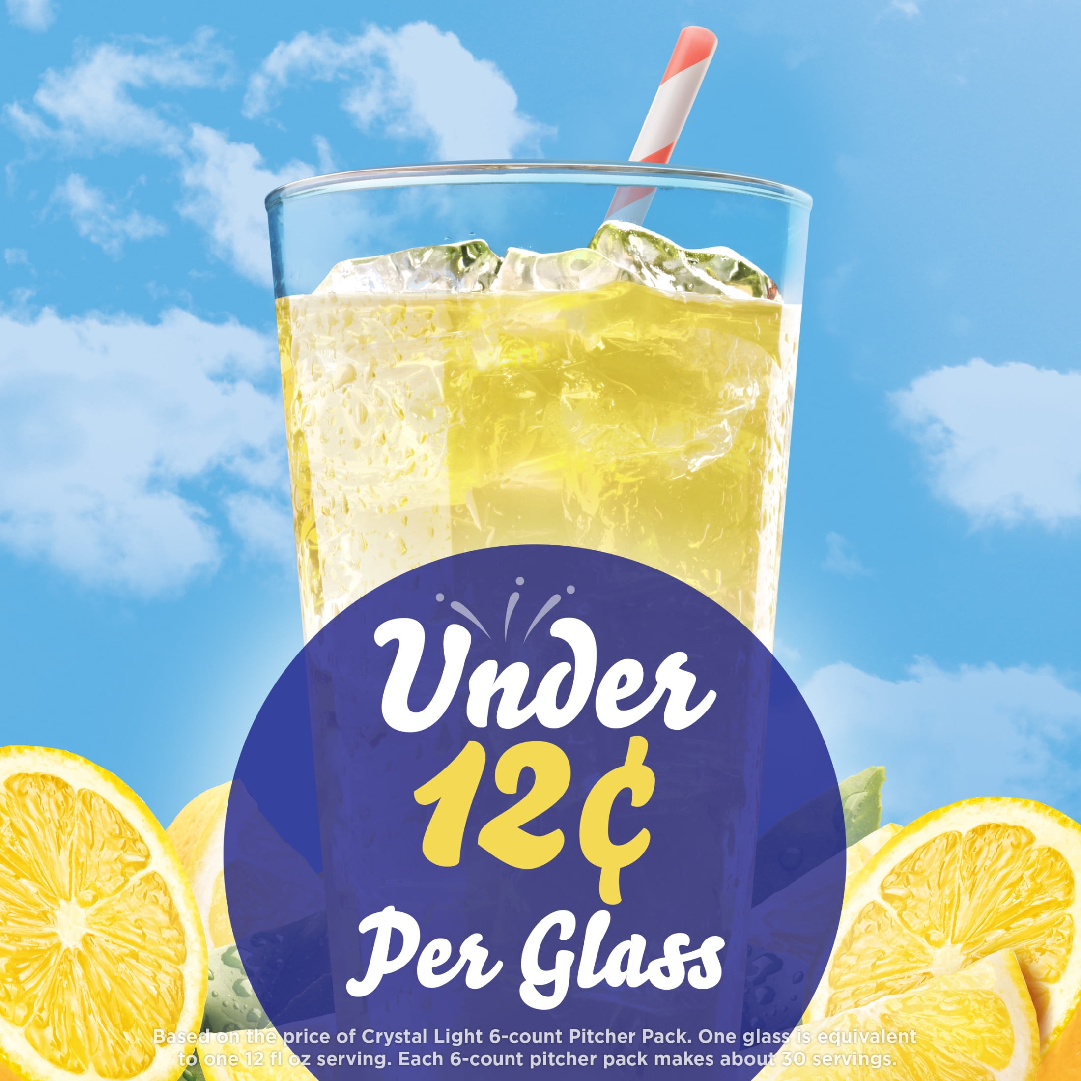 Crystal Light Naturally Flavored Lemonade Powdered Drink Mix is a refreshing beverage you can enjoy at a summer picnic or for sweet hydration at any time of year. With zero grams of sugar and only 5 calories per serving, Crystal Light lemonade is a sweet alternative to juice and soda and has 90 percent fewer calories than leading beverages, so you don’t have to compromise (this product is 5 calories, leading beverages are 130 calories). Crystal Light drink mix is made with natural flavors for a delicious, citrusy taste. Not too sour and not too sweet, each pitcher packet of sugar-free lemonade drink mix in our 6 count canister is perfectly portioned to make 2 quarts or 1 pitcher of Crystal Light lemonade, so there’s plenty to share with family and friends. Simply mix one packet of lemonade powder with 8 cups or 2 quarts of water, stir, and enjoy! If you like our Crystal Light drink mix pitcher packs, try our drink mix singles.