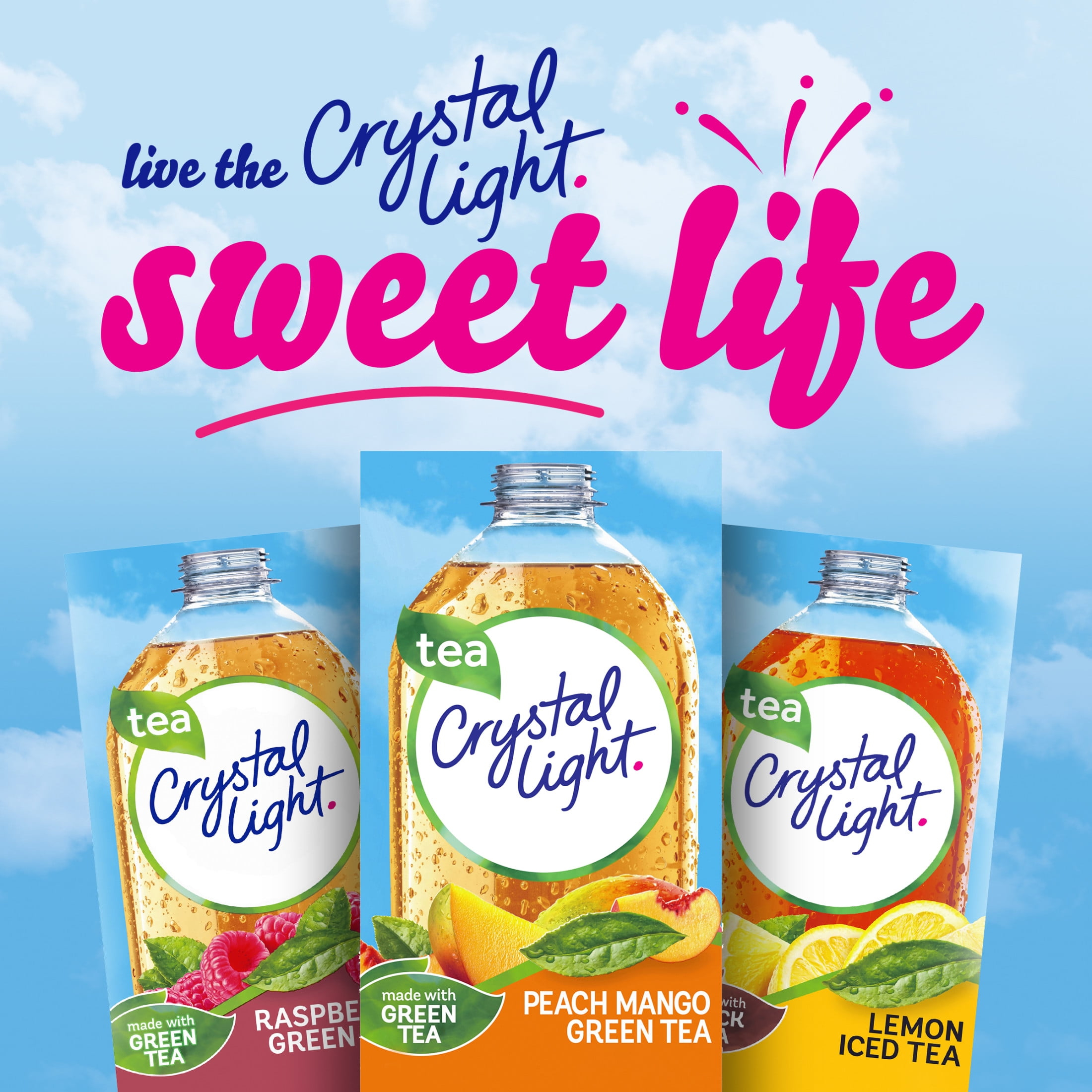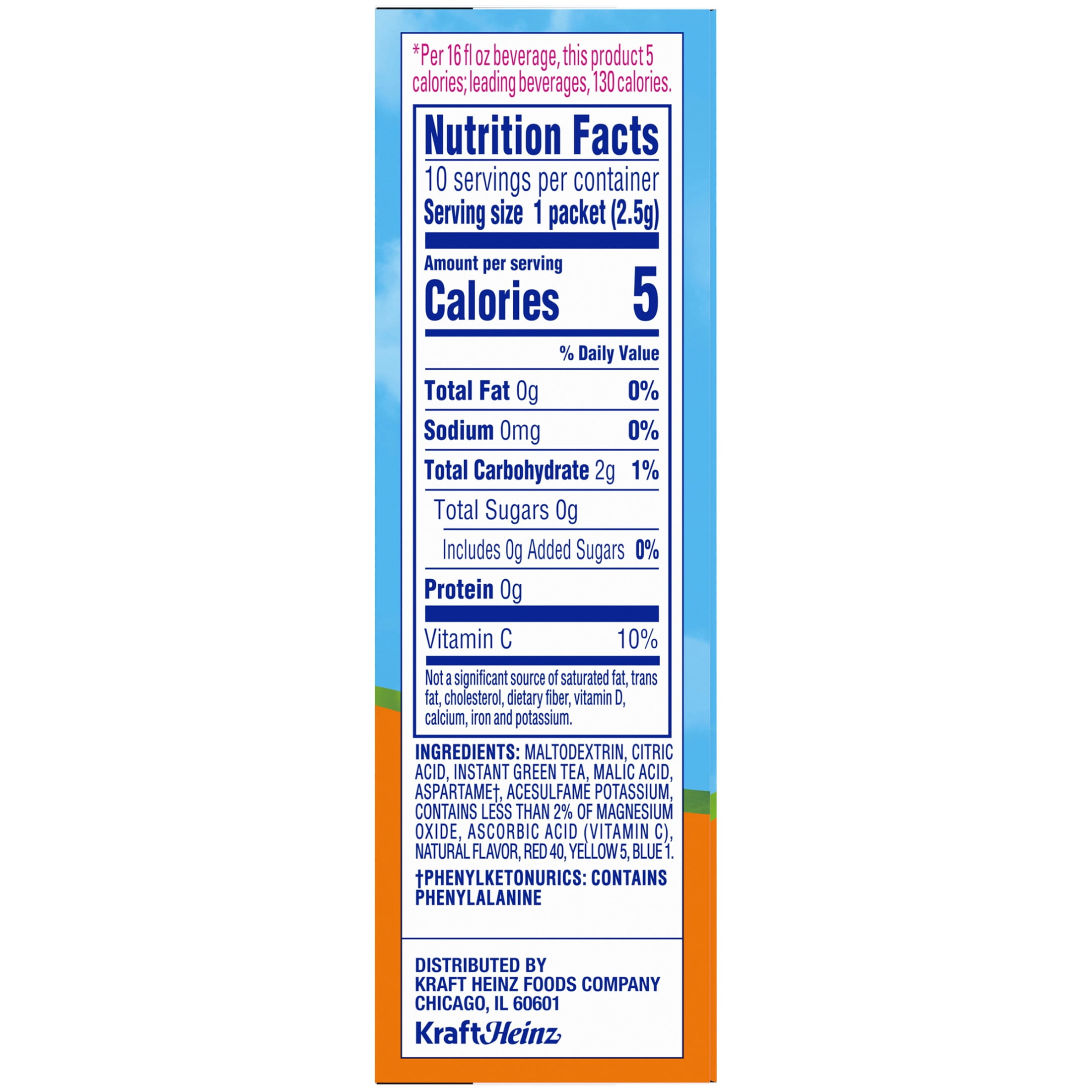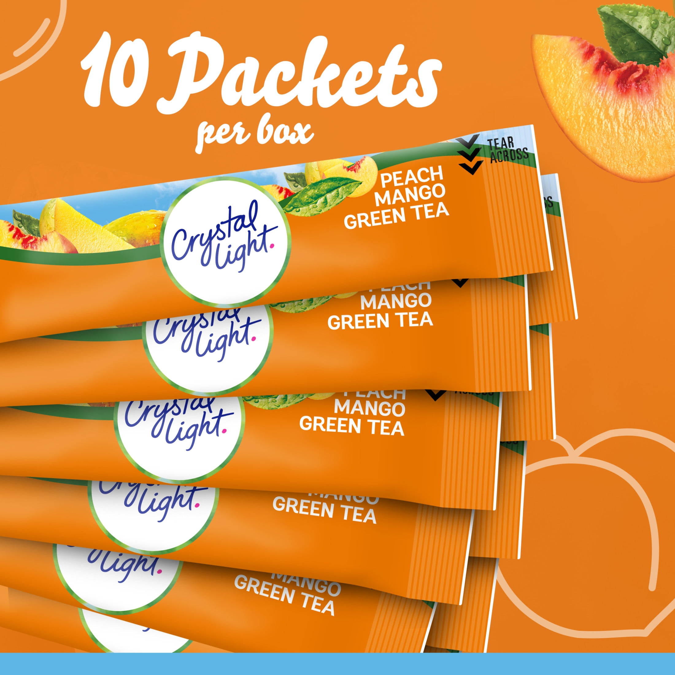 Crystal Light Naturally Flavored Peach Mango Green Tea On-the-Go Powdered Drink Mix is a light and refreshing beverage you can enjoy at any time of day. With zero grams of sugar and 5 calories per packet, Crystal Light drink mix is a sweet alternative to juice and soda and has 90 percent fewer calories than leading beverages, so you don’t have to compromise (this product is 5 calories, leading beverages are 130 calories). Our peach mango drink mix is made with real green tea for a deliciously smooth and robust taste that tea lovers are sure to enjoy. Each 0.08 ounce individual packet in our 10 count box of sugar-free Crystal Light iced tea mix fits easily in your bag, desk or glove compartment, so you can enjoy Crystal Light anywhere. Simply empty one Crystal Light singles to-go drink mix packet into a 16.9 fluid ounce bottle or glass of water, mix and enjoy! If you like our drink mix singles, try our Crystal Light drink mix pitcher packs.