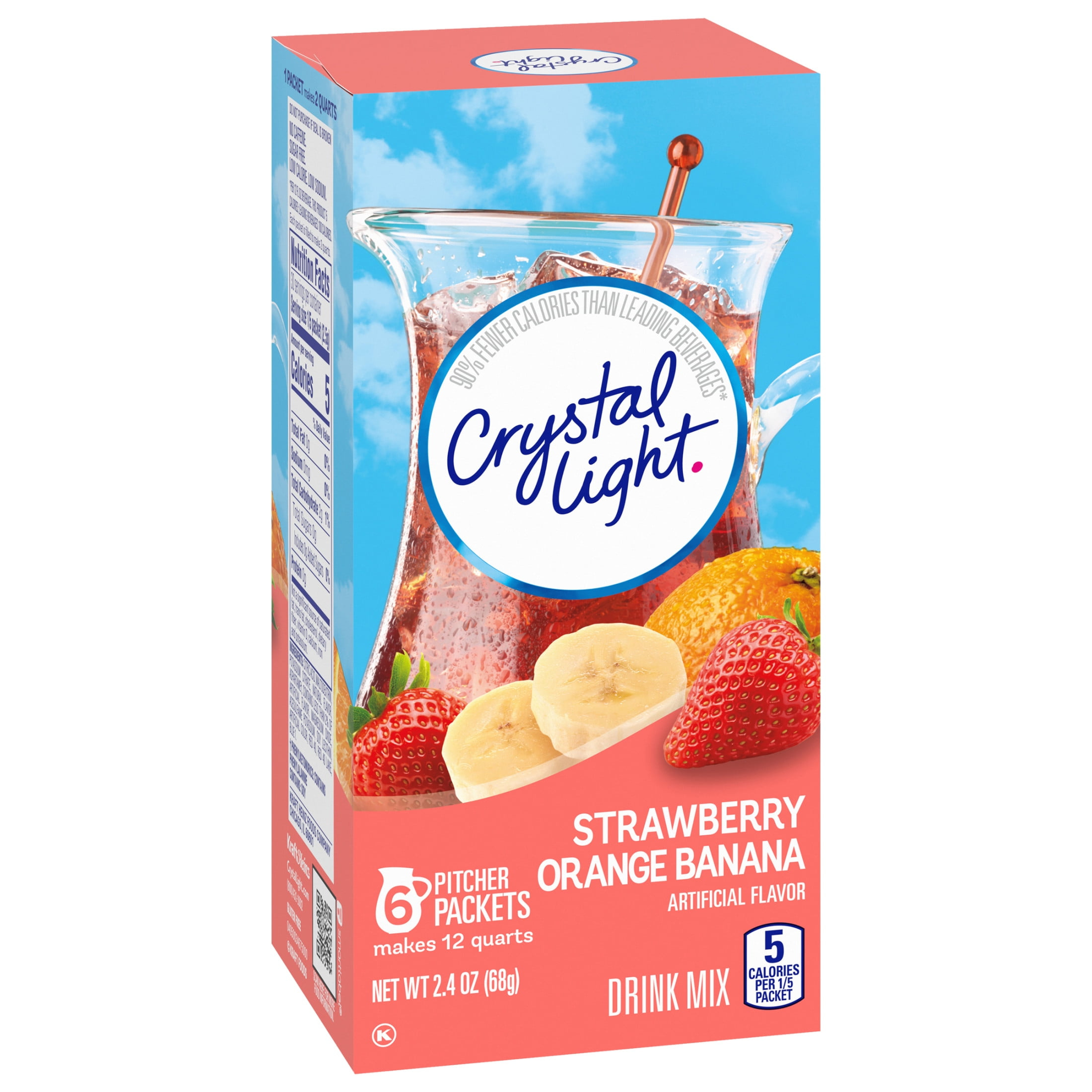 Crystal Light Artificially Flavored Strawberry Orange Banana Powdered Drink Mix is a refreshing beverage you can enjoy at any time of day. With zero grams of sugar and only 5 calories per serving, Our drink mix offers a sweet alternative to juice and soda with 90 percent fewer calories than leading beverages, so you don’t have to compromise (this product is 5 calories, leading beverages are 70 calories). Crystal Light drink mix features fruity blend flavors for a bright, tropical taste. Each pitcher packet of sugar-free powdered strawberry orange banana drink mix in our 6 count canister is perfectly portioned to make 2 quarts or 1 pitcher of Crystal Light, so there’s plenty to share with family and friends. Simply mix one packet with 8 cups or 2 quarts of water, stir and enjoy! If you like our Crystal Light drink mix pitcher packs, try our drink mix singles.