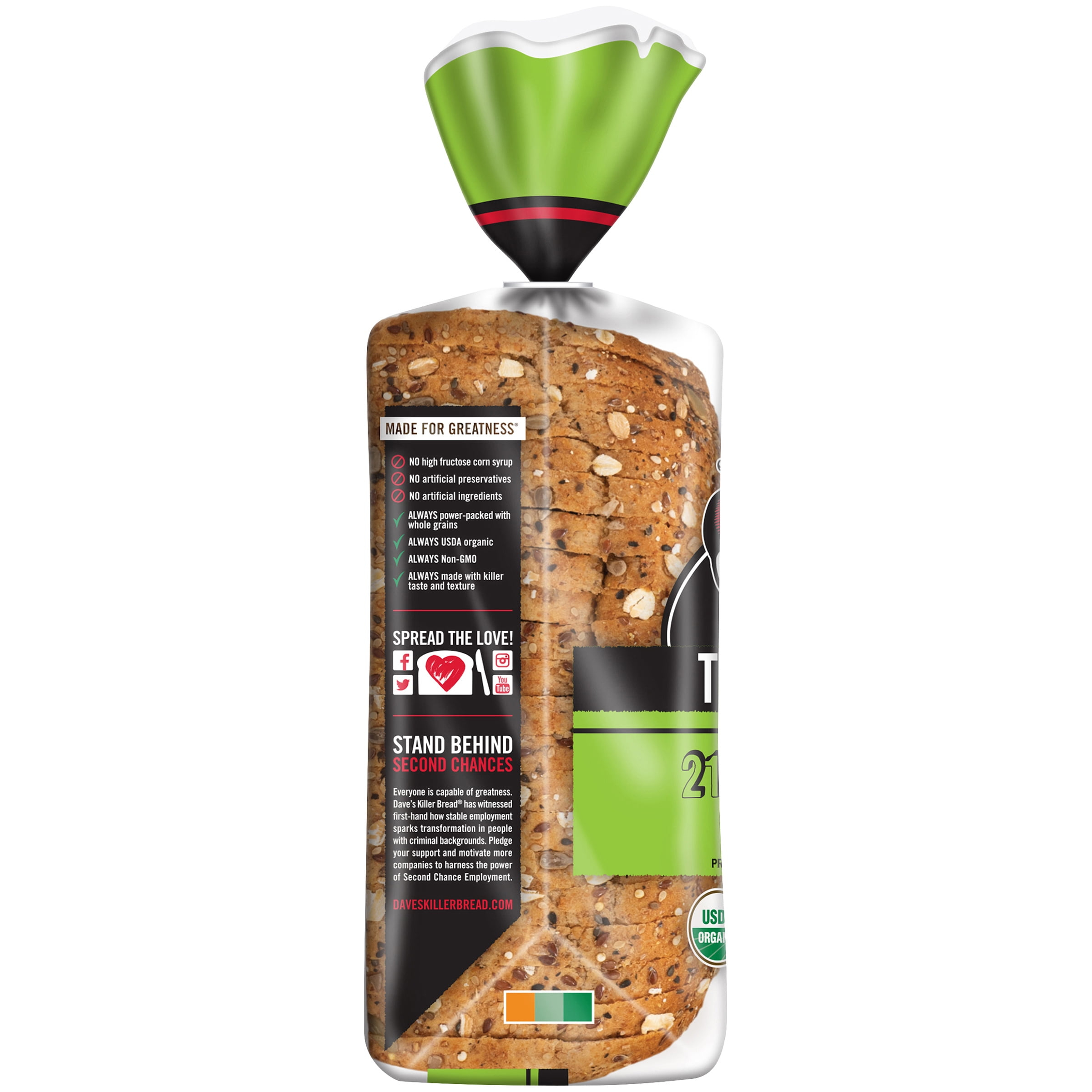 Dave’s Killer Bread® 21 Whole Grains & Seeds Thin-Sliced is USDA organic bread with killer taste and texture. It has the baked hearty texture and subtle sweetness you love of 21 Whole Grains and Seeds bread loaf, but in a thinner slice with 60 calories per slice. 3g protein, 3g fiber, 80mg ALA Omega-3 and 12g whole grains per slice. That’s what we call big nutrition in a little slice! Plus, each Non-GMO Project Verified, USDA organic loaf is coated in Dave’s signature 21 Whole Grains & Seeds mix. Dave’s Killer Bread has no high-fructose corn syrup, no artificial preservatives and no artificial ingredients. You can trust Dave’s Killer Bread to deliver killer taste, texture and whole grain nutrition. 21 Whole Grains & Seeds Thin-Sliced is the sliced bread you need for sandwiches, toast and snacks.The story of Dave’s Killer Bread® began at the Portland Farmers Market, when Dave Dahl and his nephew brought some loaves of Dave’s bread to sell. For Dave, this marked the beginning of a new chapter in his life. Though he grew up in a family of bakers, his life took a different path. A path that landed him in prison for 15 years. Determined to prove his worth and make a positive impact, Dave worked tirelessly to bake breads that tasted unlike anything else on the market — packed with seeds and grains, made with only the very best organic and Non-GMO Project Verified ingredients. Dave’s Killer Bread® believes everyone is capable of greatness. One in three of the company’s employee partners at their Milwaukie, OR bakery has a criminal background—but your past doesn’t define your future. As a proud Second Chance Employer, Dave’s Killer Bread® truly believes everyone deserves a second chance to become a Good Seed.