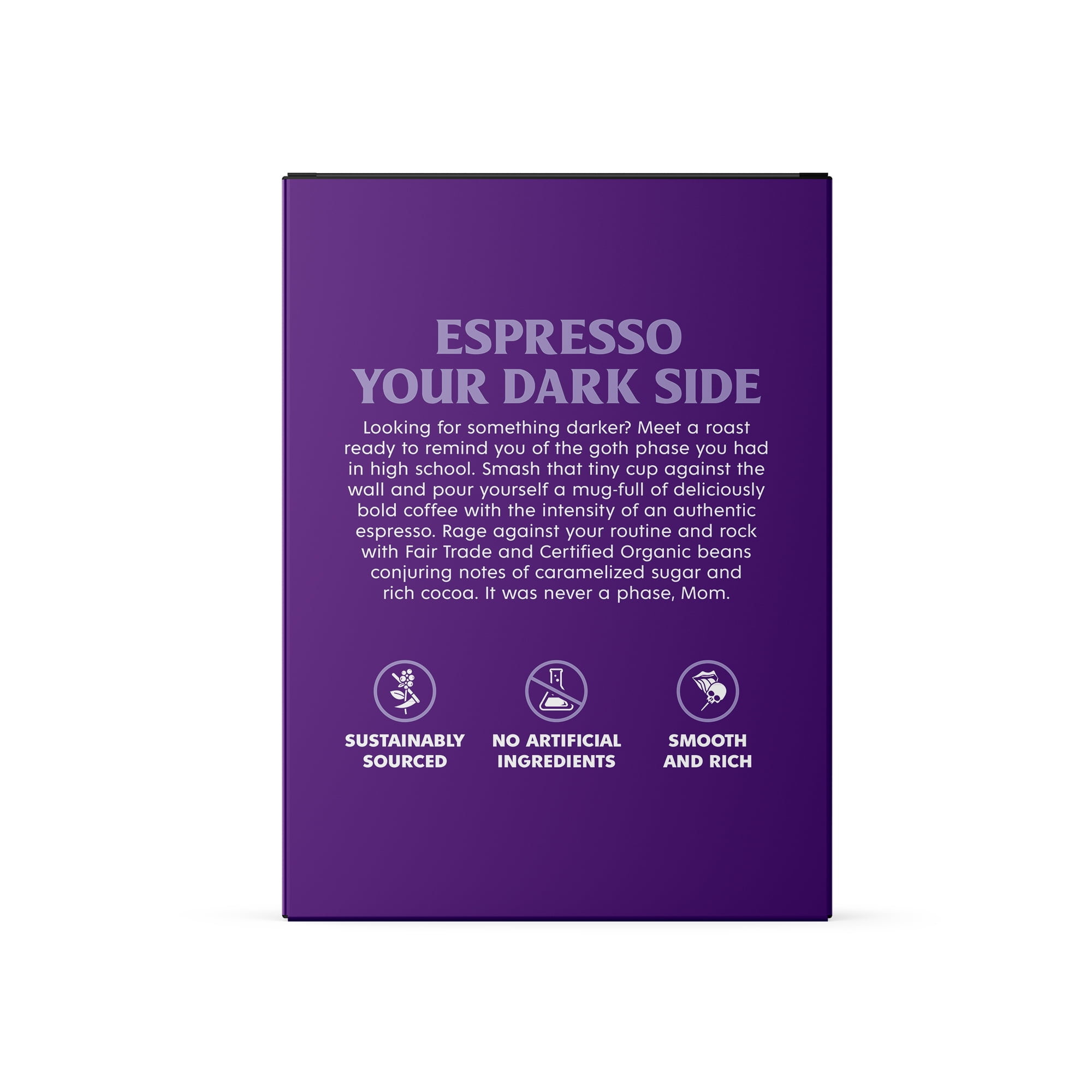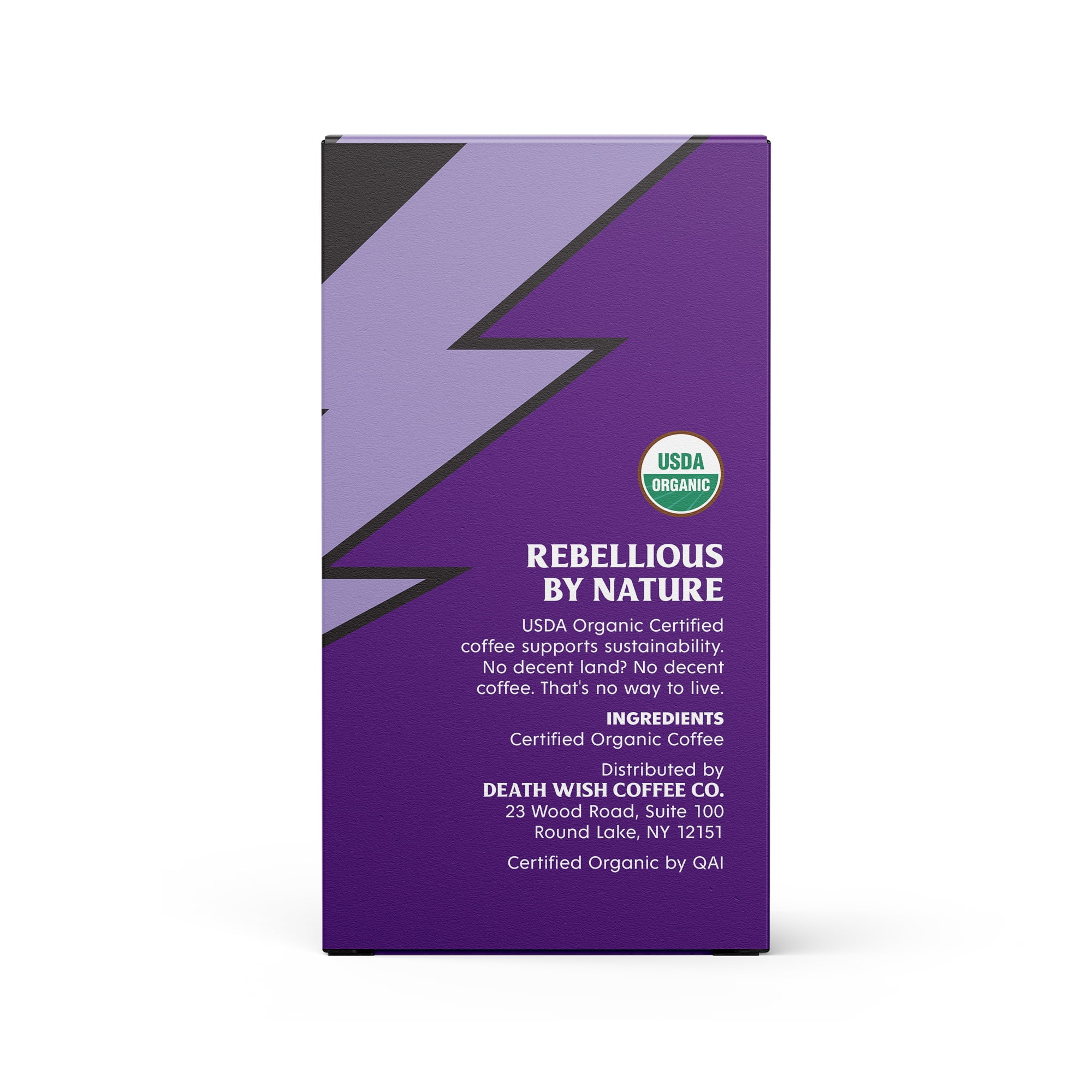 Death Wish Coffee Espresso Roast Single-Serve Coffee Pods allow you to exorcise the demons of “blah” beans and boring routines by sipping on the next dimension of darkness. Compatible with most K-Cup® coffee machines, each single-serve, shelf-stable coffee pod is deadpan-perfect for intense cups of coffee and espresso drinks. Our Espresso Roast Coffee is sourced from the highest-quality, Fair Trade Certified, and USDA Certified Organic coffee beans in the world. Spawned specifically for deep notes of cocoa, caramelized sugar, and cherries, Death Wish Coffee Espresso Roast Single-Serve Coffee Pods encourage any coffee lover to abandon barista banter and café lines for a cup of otherworldly strength that’s brimming with espresso-like texture and depth.