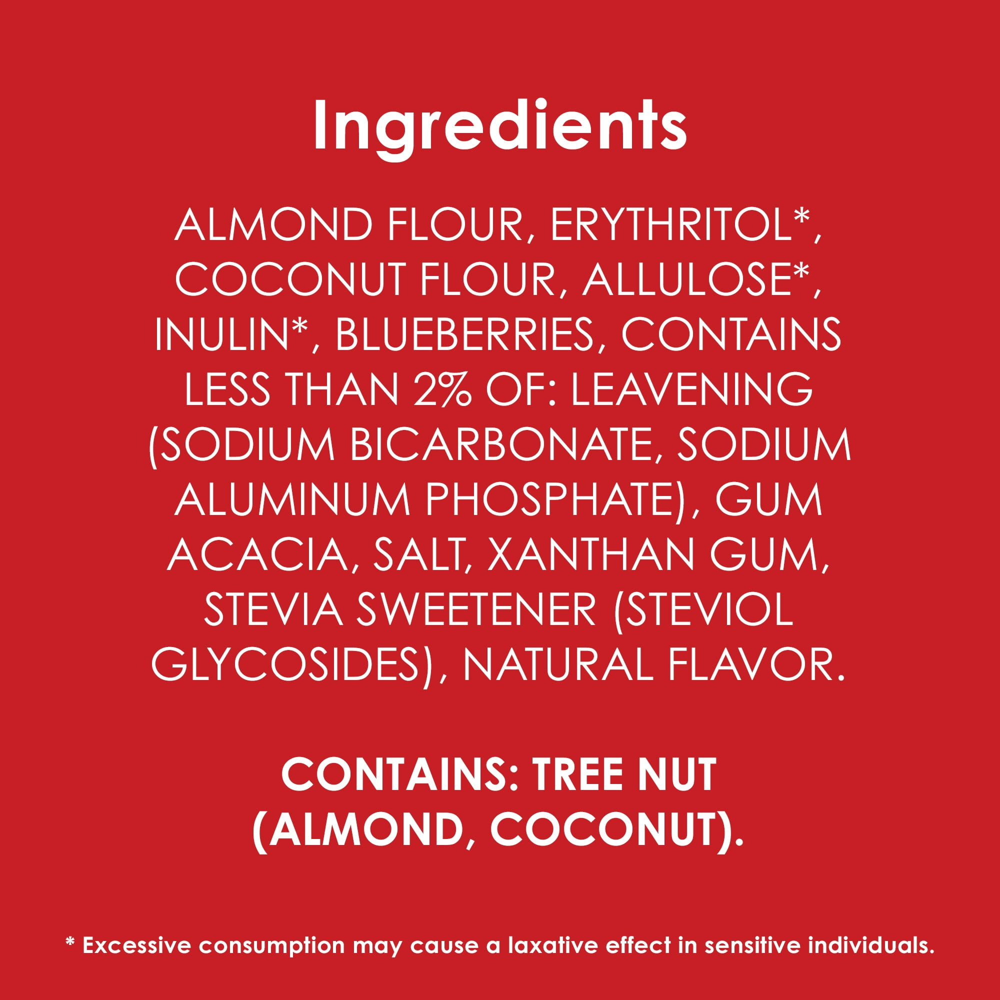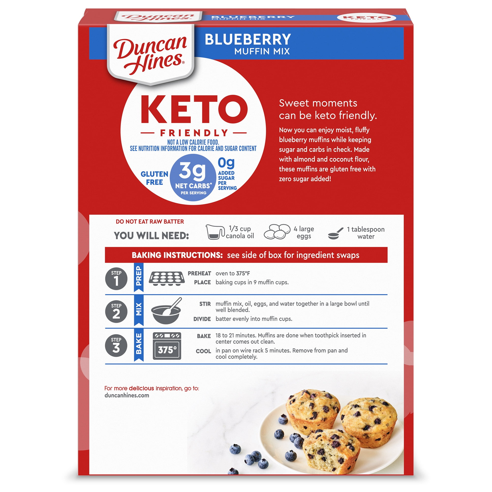 Duncan Hines Keto Friendly Blueberry Muffin Mix makes delicious muffins that fit your lifestyle. Loaded with flavor, these blueberry muffins are made with almond and coconut flours, blueberries and stevia for a delightful keto friendly start to your day. These gluten free muffins contain 3 grams of net carbs* and 0 grams of sugar** per serving. Simply add water, eggs and oil to the baking mix, stir to combine and bake for the recommended time in the instructions. Prepare this muffin mix to make keto muffins for a quick breakfast or use it to make mini muffins for sweet school snacks. These keto breakfast muffins help you feel good about the baked goods you serve. Each package makes 9 muffins. *3g net carbs = 18g total carbs – 5g dietary fiber – 5g erythritol – 5g allulose **Not a low calorie food. See nutrition information for calorie and sugar content