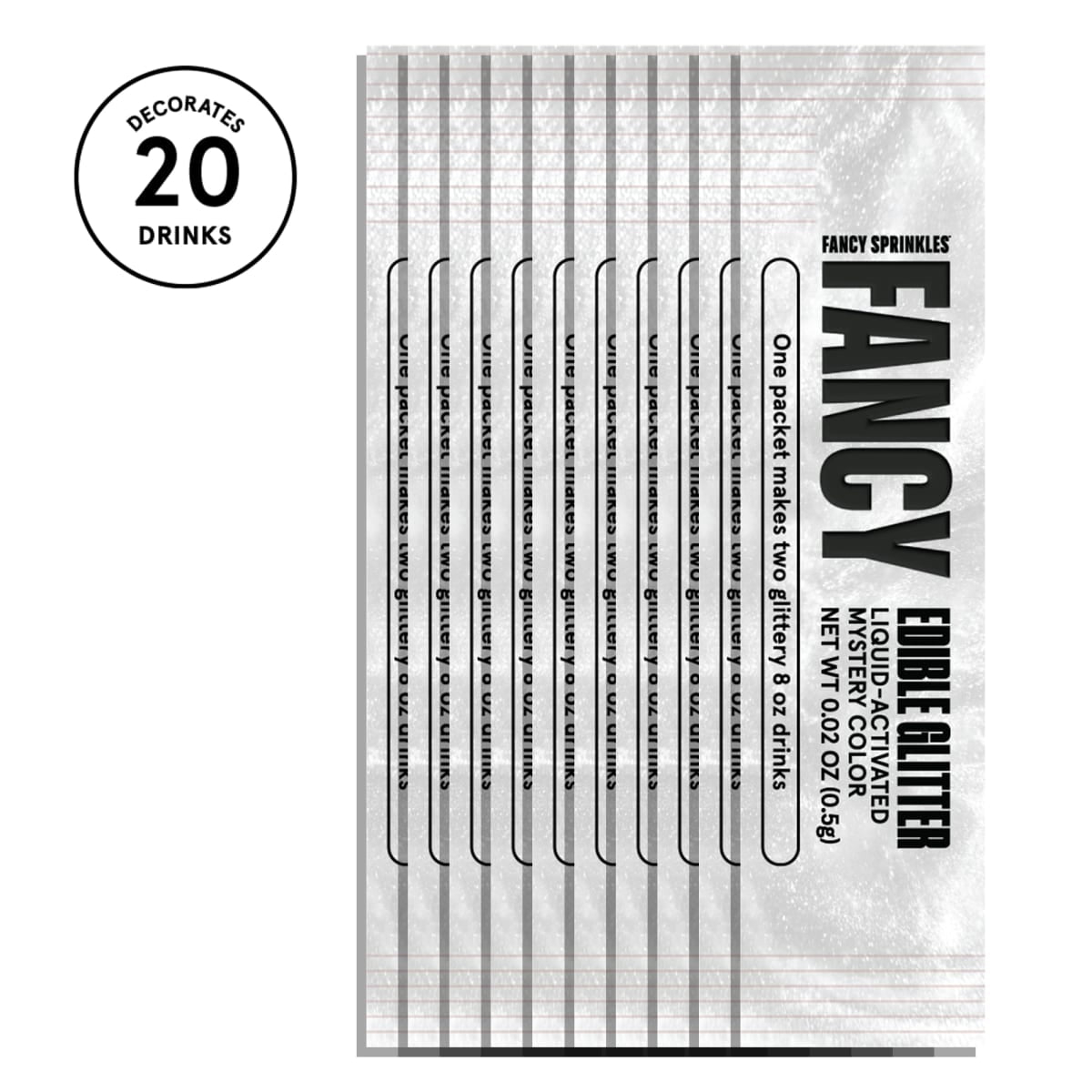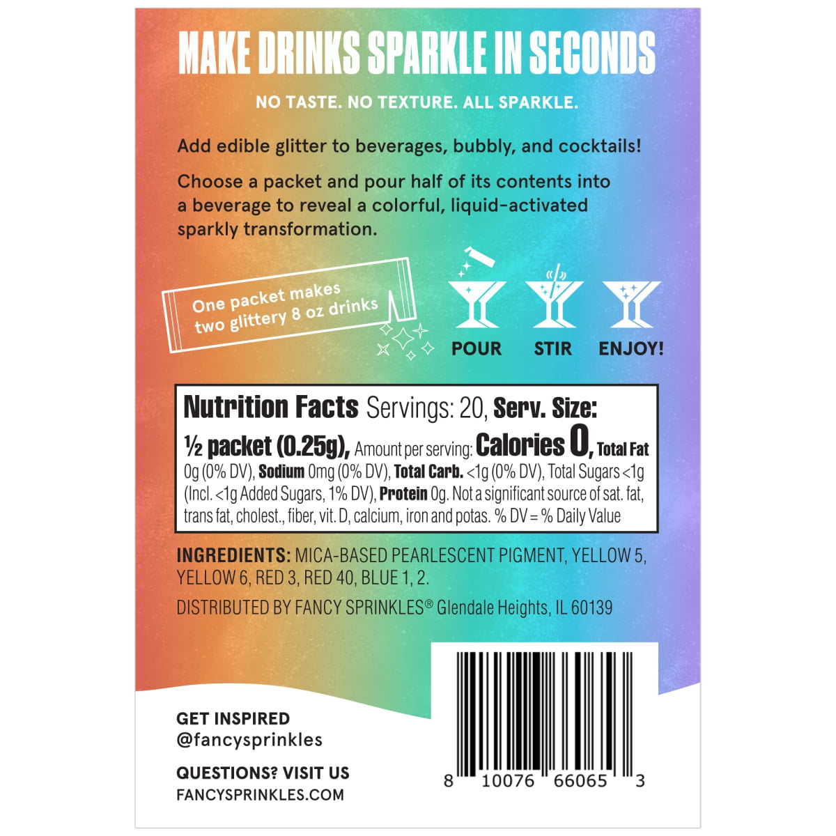- EASY TO USE | Sprinkle the Edible Glitter into an empty glass, pour beverage over glitter, and stir for an instant, shimmering transformation; Each packet easily glitters two 8-ounce drinks
