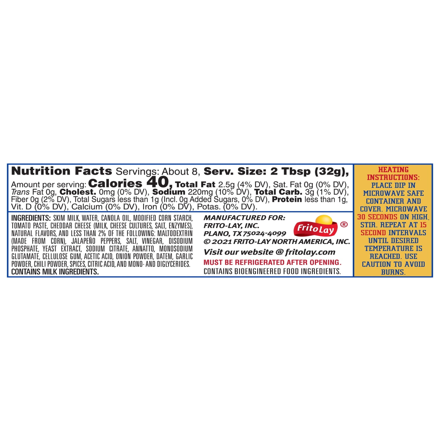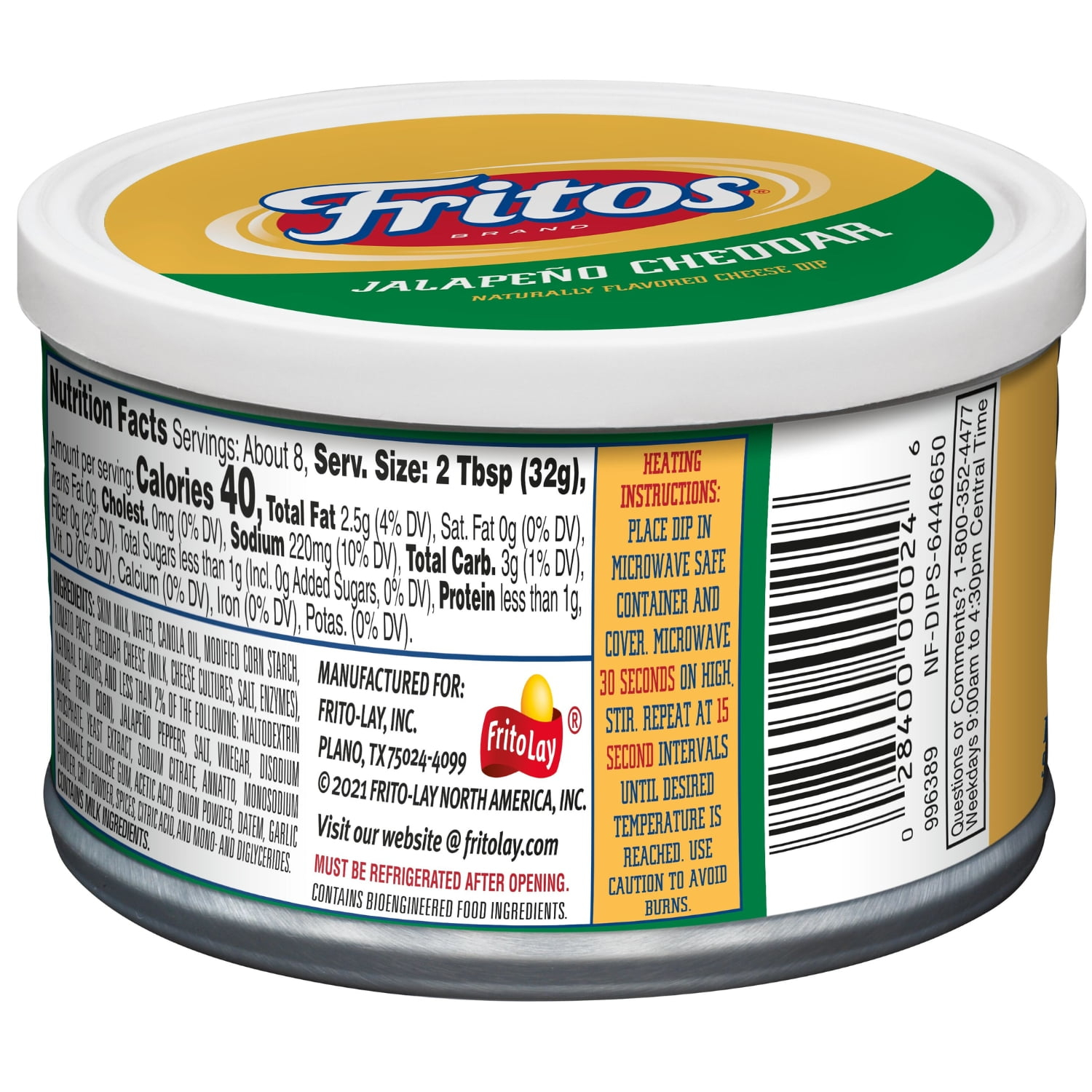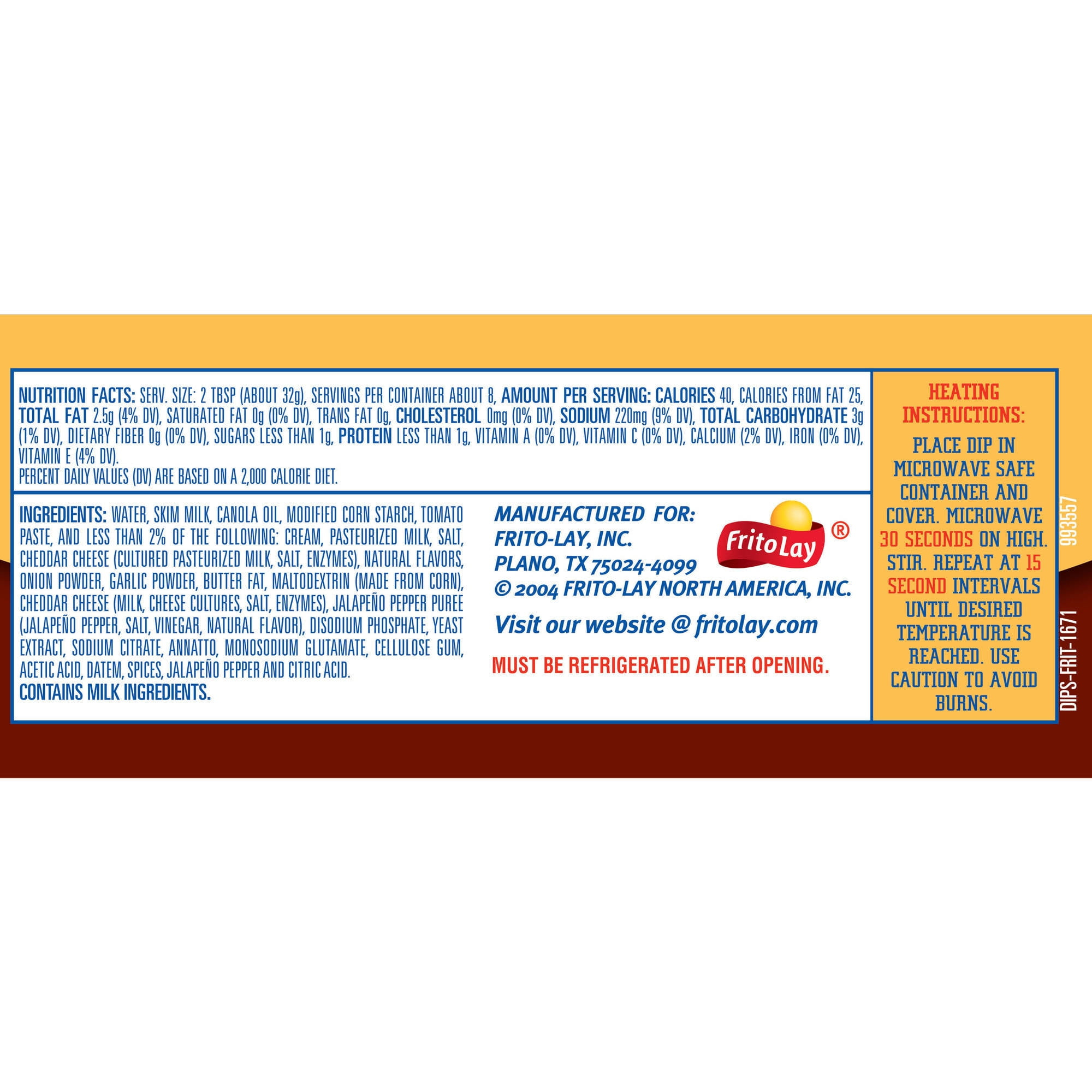 Frito Lay Dips Delicious, crowd pleasing, and convenient – it can’t get much better than Frito-Lay Chips and Dips. Whether entertaining friends, enjoying a family barbeque, or relaxing at home, our perfectly blended salsas, great tasting cheese and bean dips, and rich dairy dips are always a hit. Mix and match them to discover your own perfect chip/dip pairing! Fritos Jalapeno Cheddar Cheese Dip is infused with the great taste of jalapeno and cheddar cheese, in a convenient package. It contains no gluten ingredients and has 0g trans-fat. What’s In the Box? Fritos Dips, Jalapeno and Cheddar Cheese, 9 oz