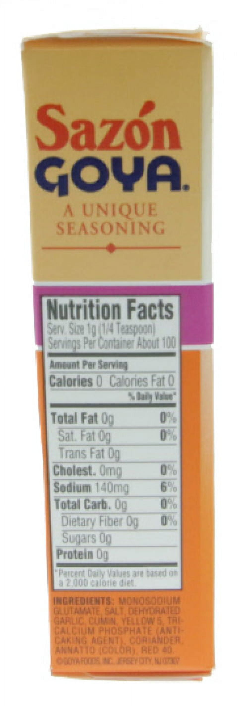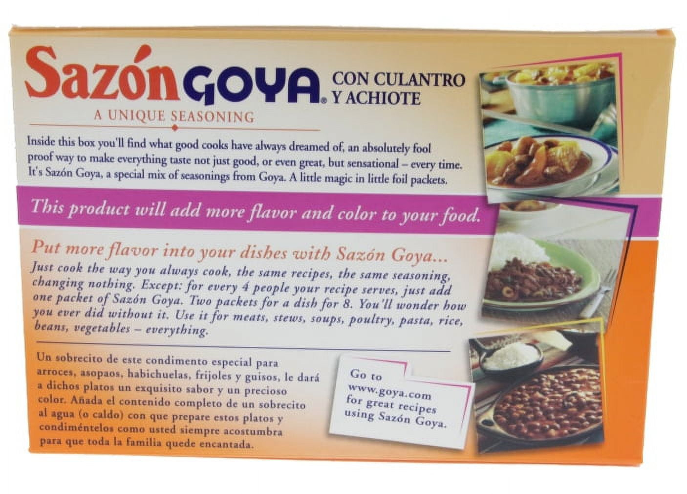 GOYA Sazon Coriander & Annatto Seasoning Econo Pak 3.52 Oz. Goya Sazon is a seasoning consisting of coriander, garlic, cumin, and annatto spices all in one foil packet to give your food dishes more flavor. Gives food an exciting color to go along with the delicious taste. This seasoning taste wonderful and is versatile! Use it on your meats, poultry, pasta dishes, rice, beans, stews, soups, and so much more! Once you and your loved ones taste a dish with Sazon Goya, you will wonder why you have waited until now to use it! Don’t leave your entrees missing out; start using Sazon Goya with coriander and annatto. ÂÂ