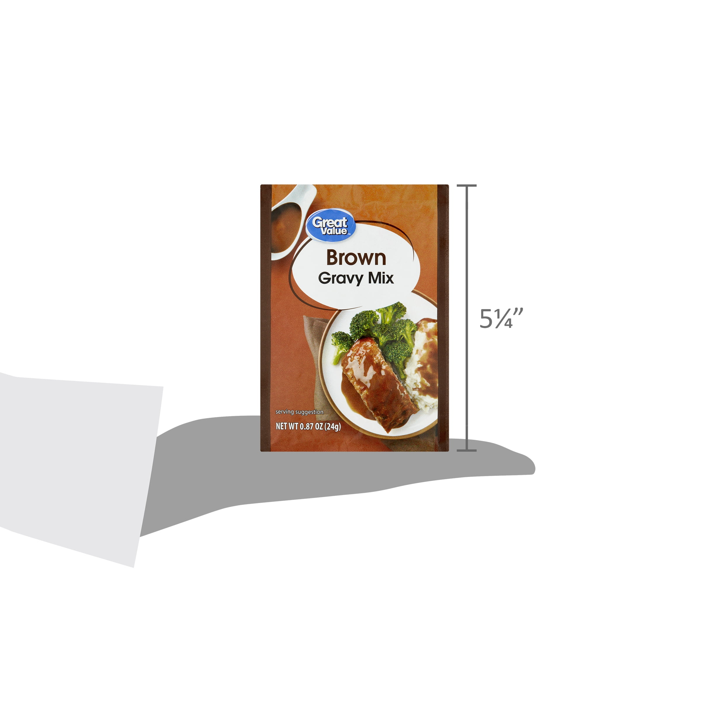 Try Great Value Brown Gravy Mix for a delicious sauce that comes together in a matter of minutes. Simply empty mix into a small saucepan and combine with cold water, bring to a boil while stirring, reduce heat and simmer for just one minute, and you have nearly instant delicious brown gravy. A perfect accompaniment for hearty dinners like pot roast, turkey, mashed potatoes, and Swedish meatballs, you will love the richness and flavor that warms you from the inside out. With only 20 calories per serving, zero sugar, and zero fat, you can smother on the goodness free of guilt. Make Great Value Brown Gravy Mix a cupboard stable!