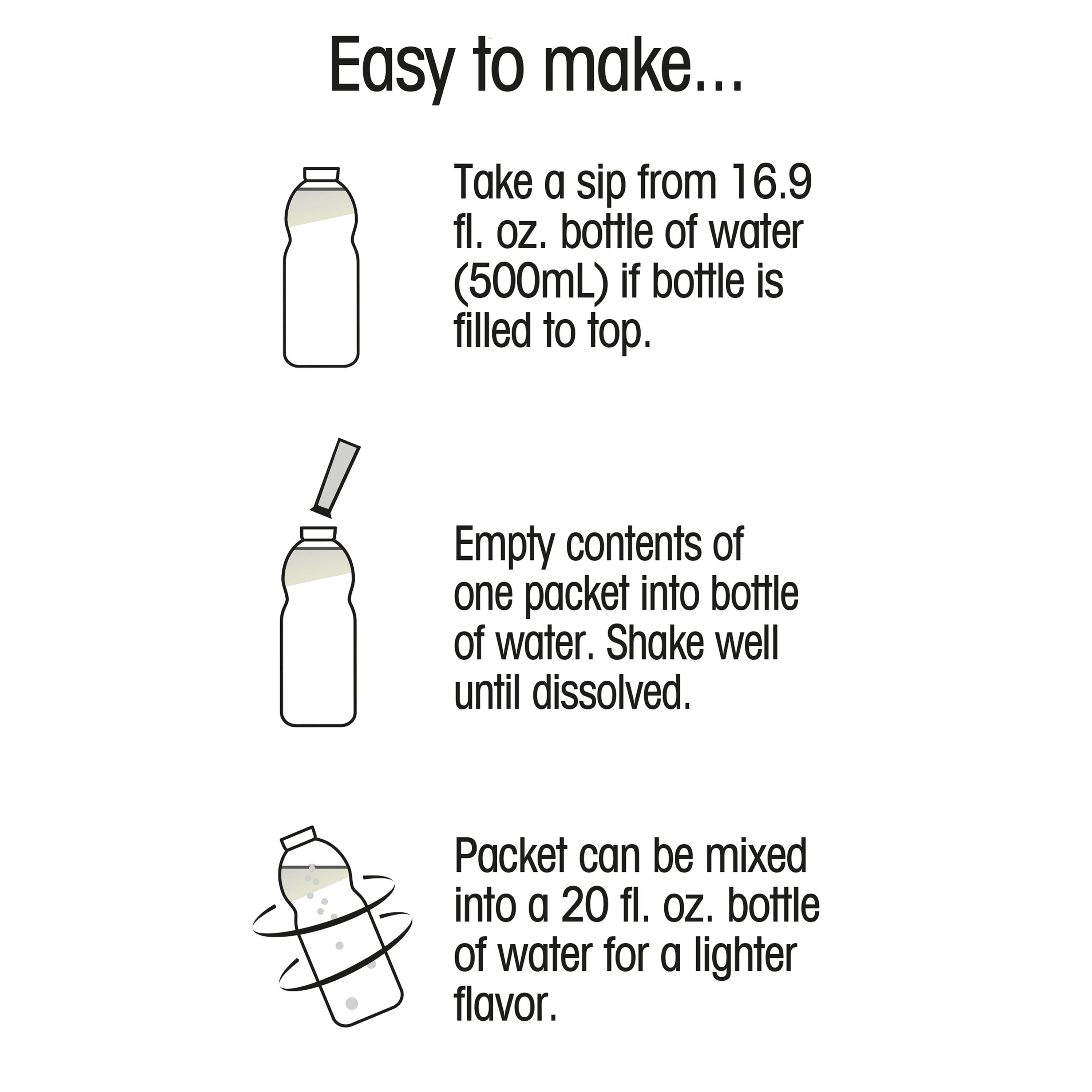 - Easy to Make SIP from a full bottle of water to make room for powder. POUR one stick into a 16.9 fl. oz. bottle of water or a large glass of water. SHAKE bottle or mix well until powder dissolves.