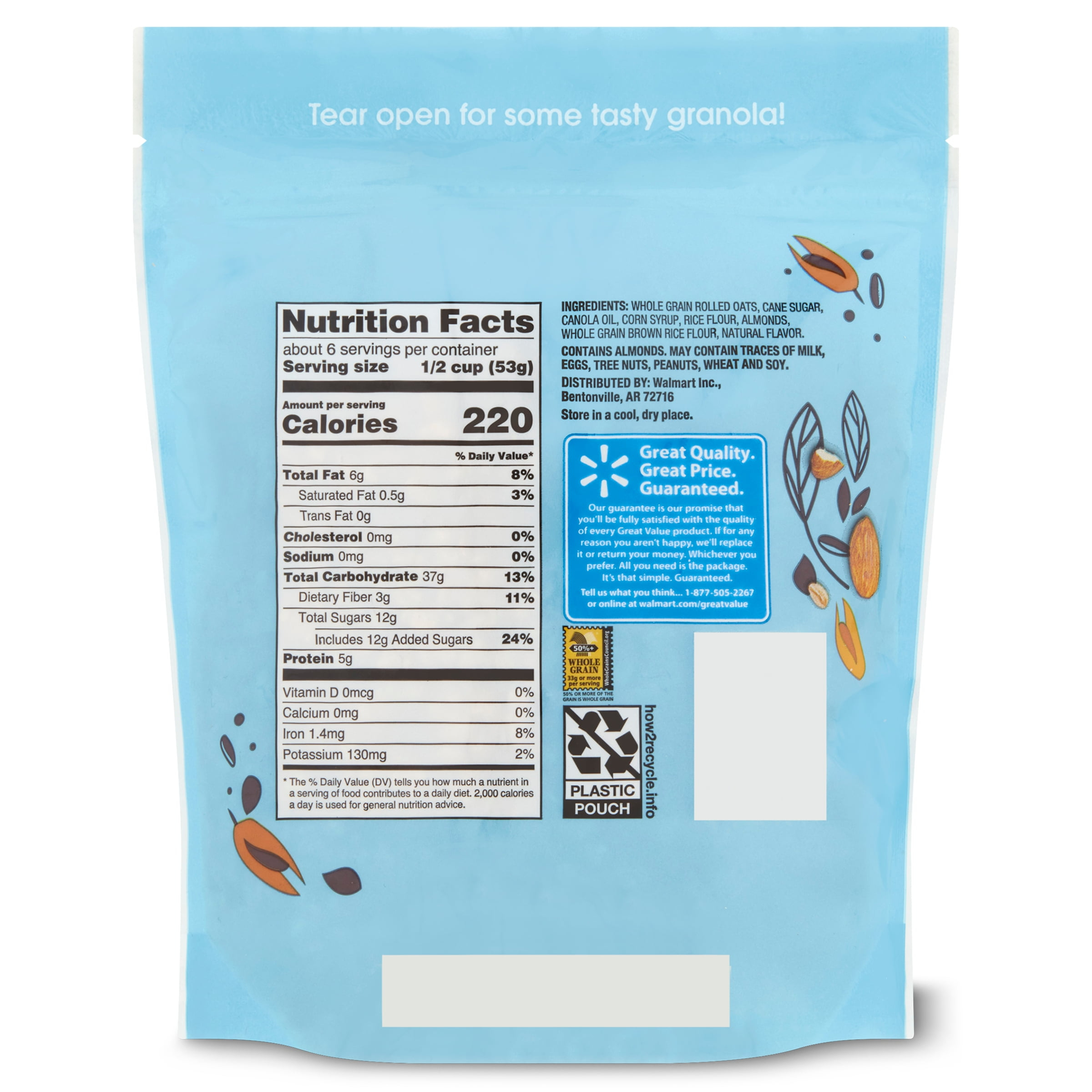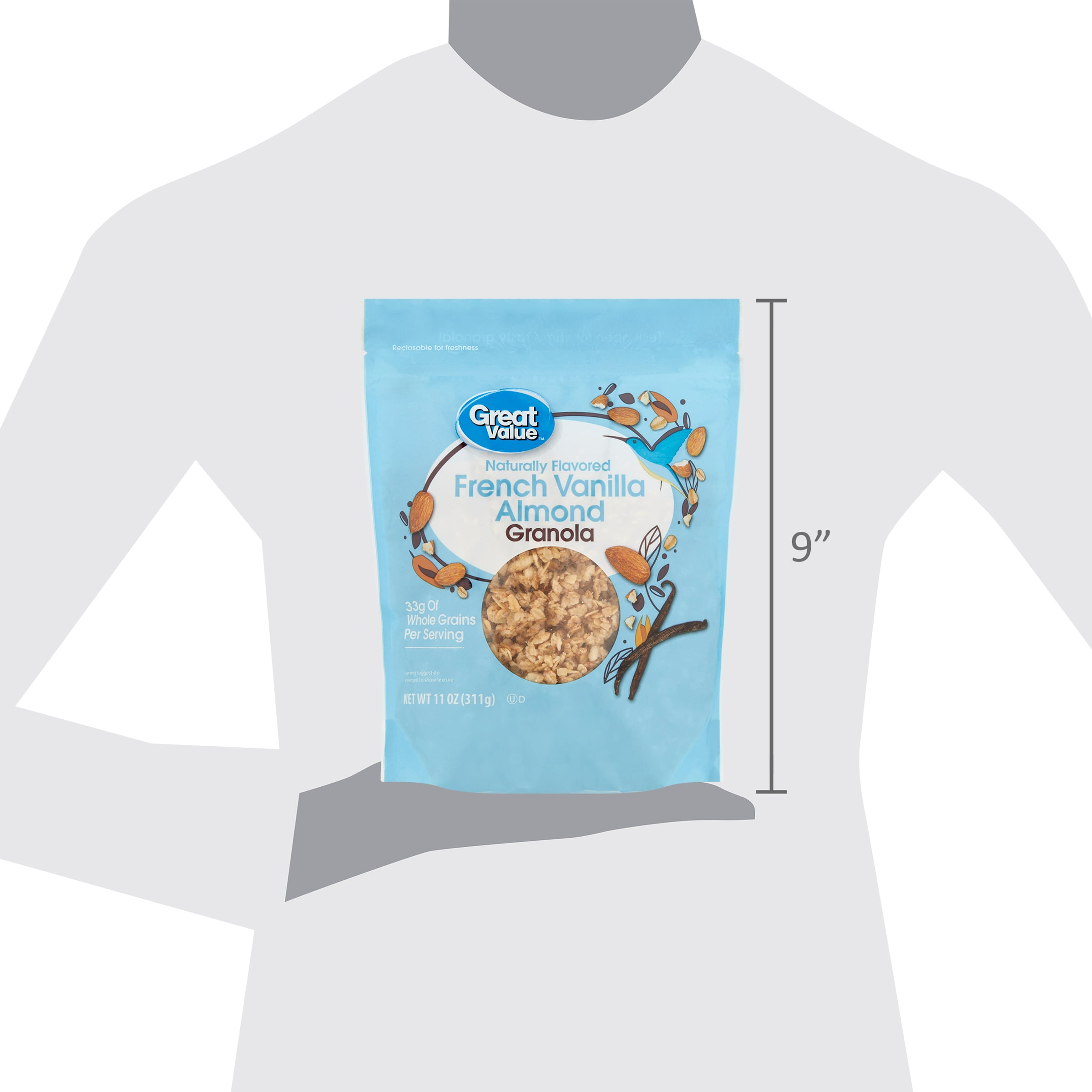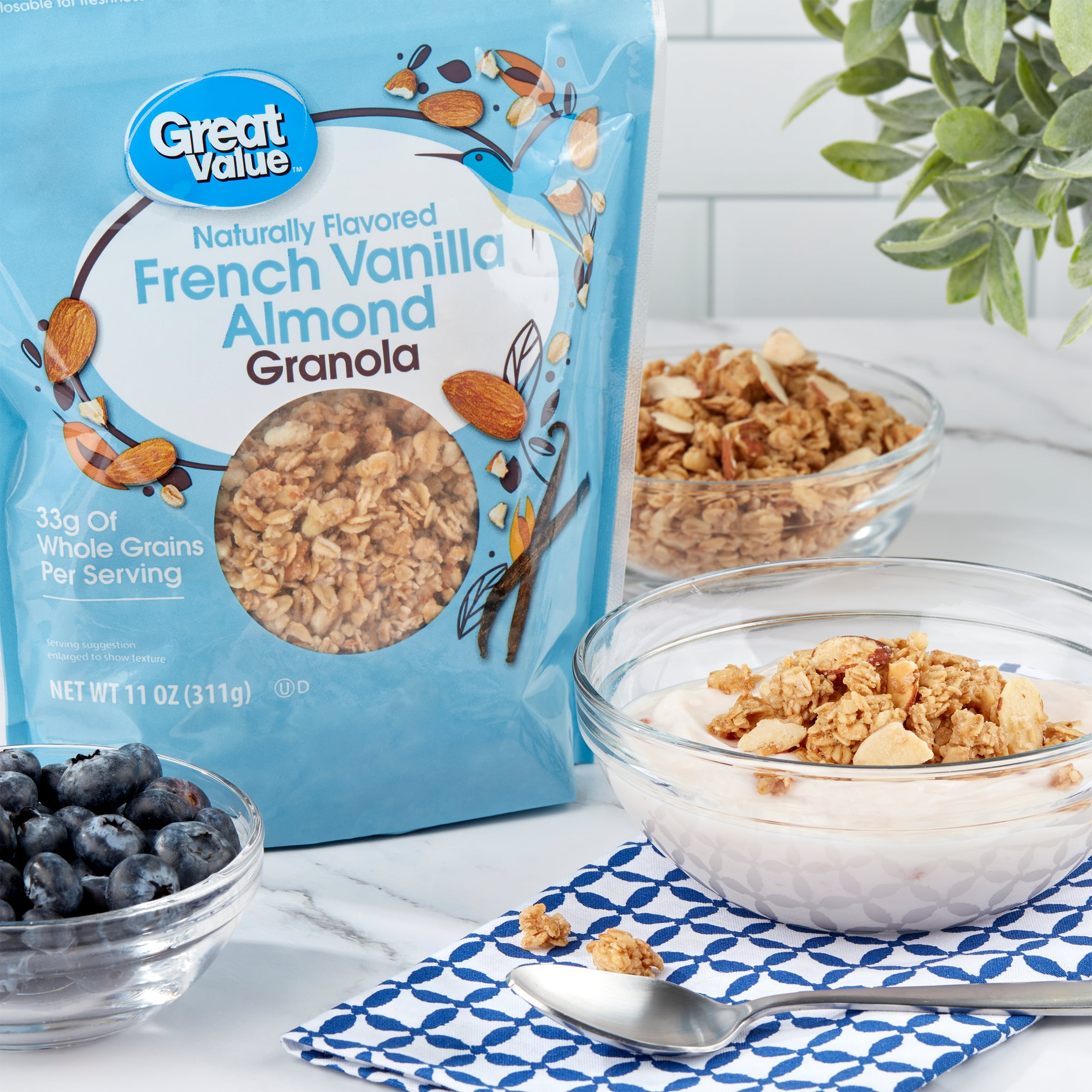 Add some sweetness to any meal with our Great Value French Vanilla Almond Granola. With 33 grams of whole grains per serving, this crunchy granola can be enjoyed in countless ways. Use it to make a tasty yogurt parfait or make your very own trail mix. Make your own granola bars or pour it into a bowl with some milk for a satisfying breakfast. Enjoy it right out of the bag for a quick and yummy snack. Bring home Great Value French Vanilla Almond Granola today. Great Value products provide families with affordable, high quality grocery and household consumable options. With our wide range of product categories spanning grocery and household consumables, we offer you a variety of products for your family’s needs.