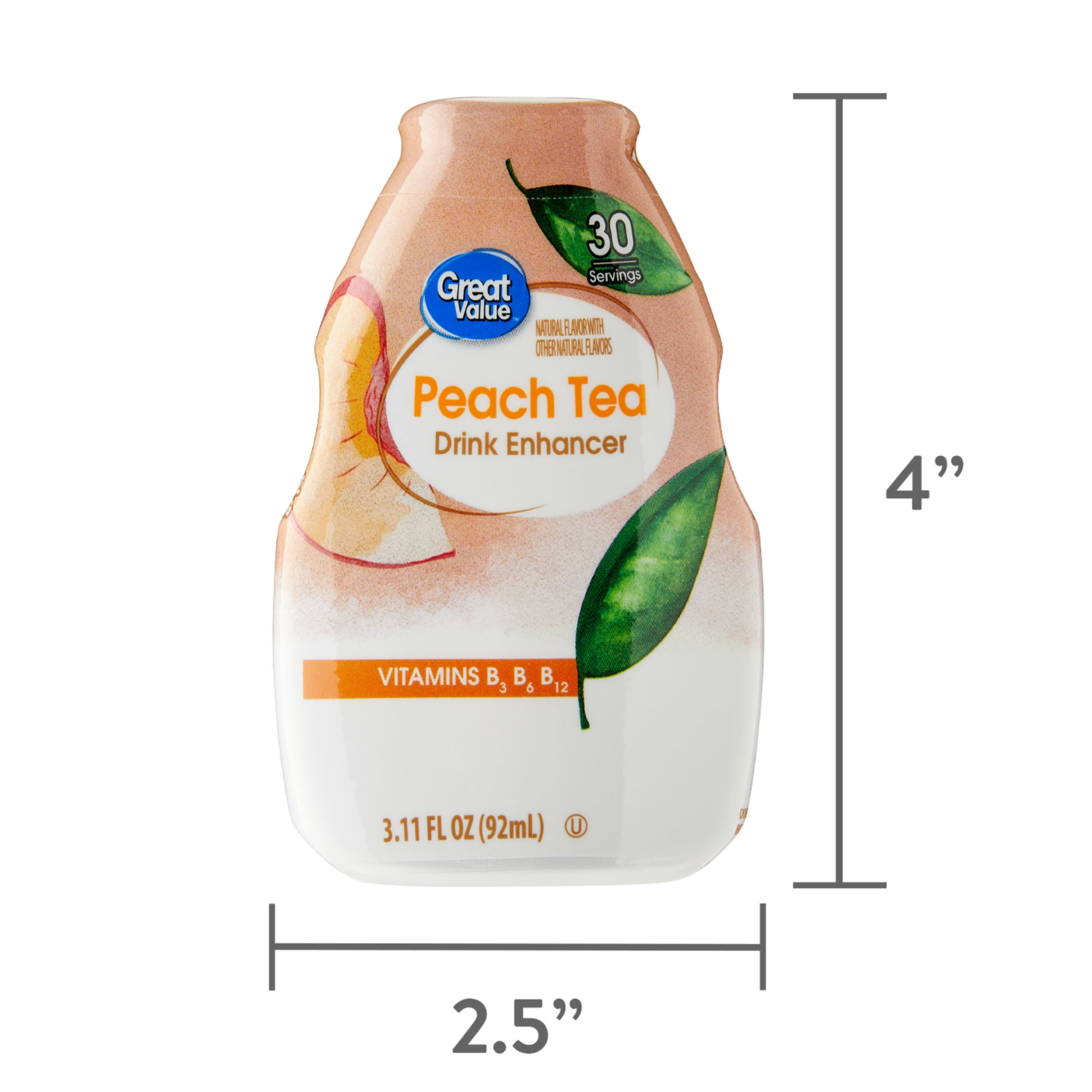 Brighten your day with the sweet, juicy flavor of Great Value Peach Tea Drink Enhancer. Whether you’re at home, at work, on the go, or at the gym, staying hydrated will be a treat with this delicious flavor enhancement. Just squeeze, shake or stir, and enjoy. This convenient 3.11-fluid ounce bottle provides 30 servings and doesn’t need refrigeration. Plus, it’s sugar and calorie free. Making sure you drink enough water is easy with Great Value Peach Tea Drink Enhancer.