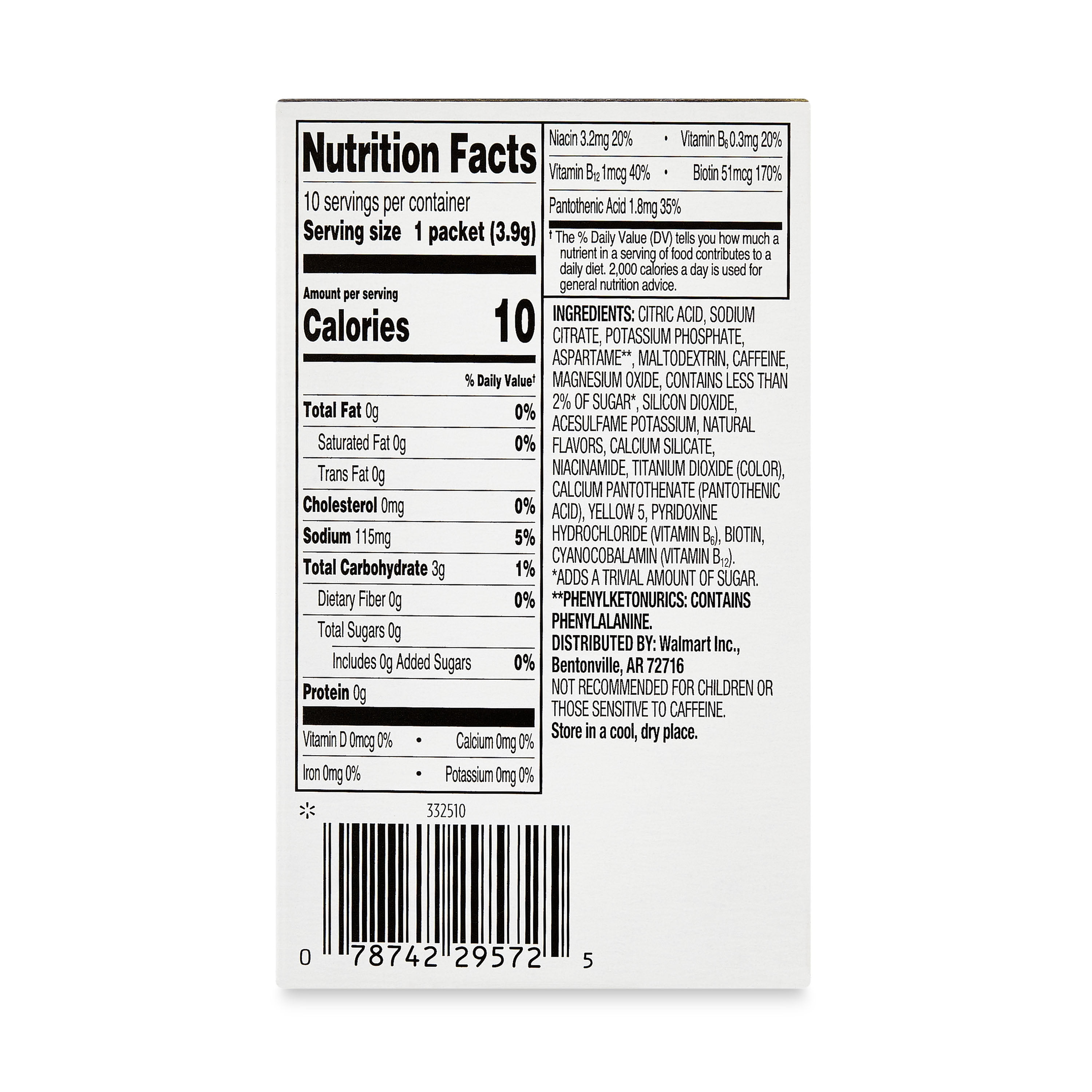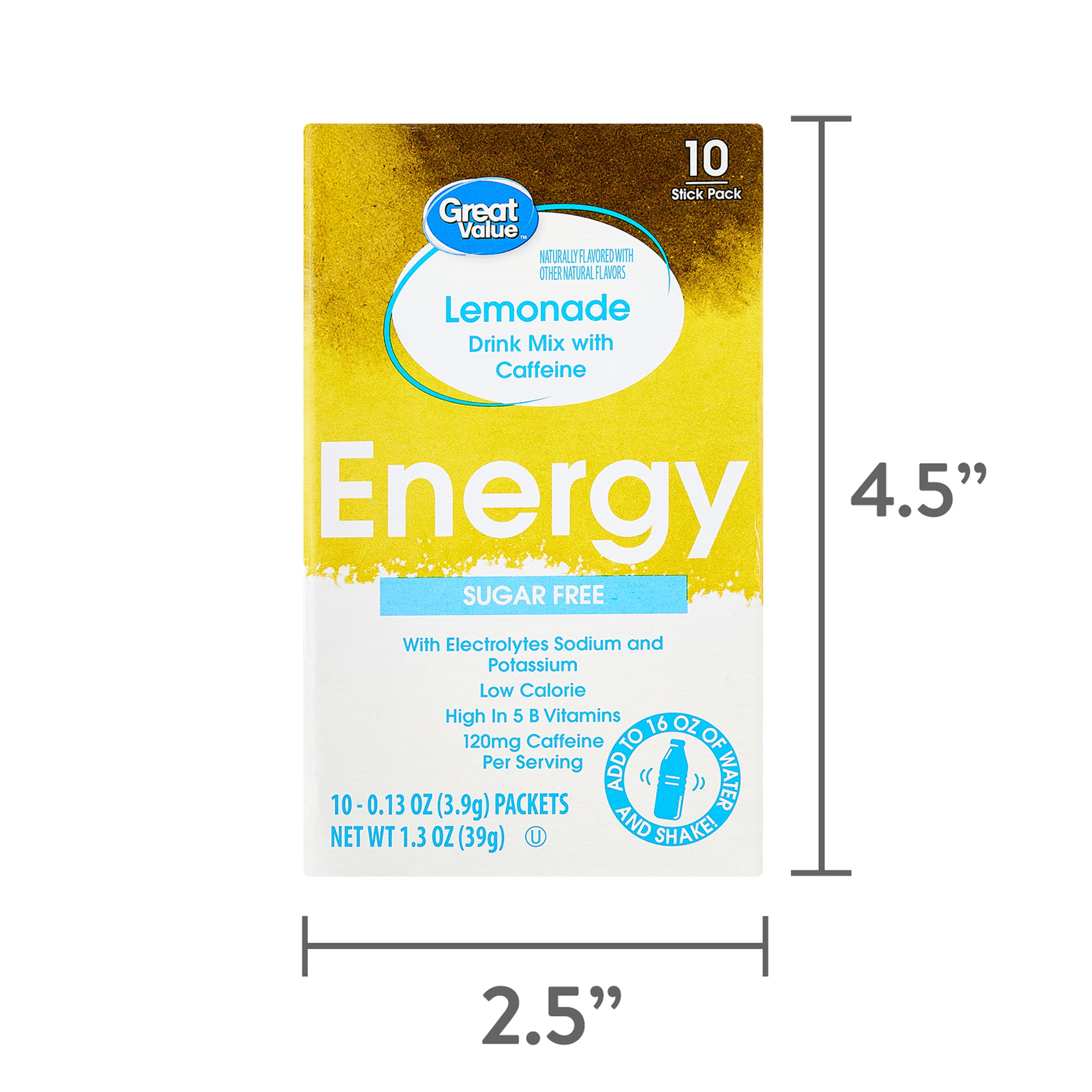 Our Great Value Energy Electrolyte Lemonade Drink Mix turns one of your favorite summertime beverages into a go-to drink for your daily routine. Each box of our Energy Drink Mix comes complete with 10 sugar-free drink-mix packets that are stocked full with essential B vitamins. With 120 milligrams of caffeine in every serving, this drink enhancer can act as an essential enhancement to your usual bottle of water when you’re out crushing a workout or it can act as a refreshing alternative to a morning coffee before work.. You can add this replenishing drink enhancer to water, sparkling water, juice, cocktails, or tea to take your favorite drinks to the next level. Give yourself the revitalizing energy you need with our Great Value Energy Electrolyte Lemonade Drink Mix.