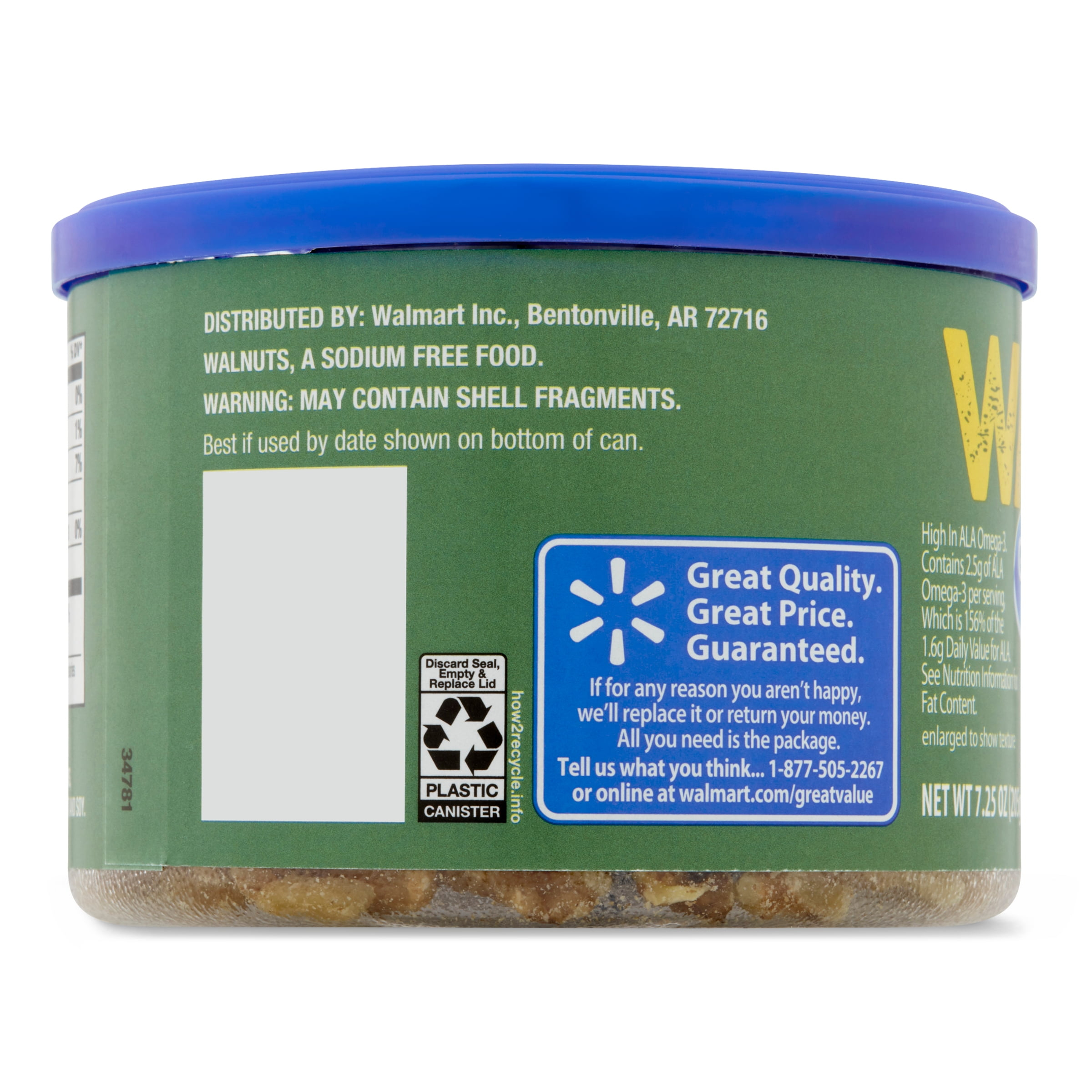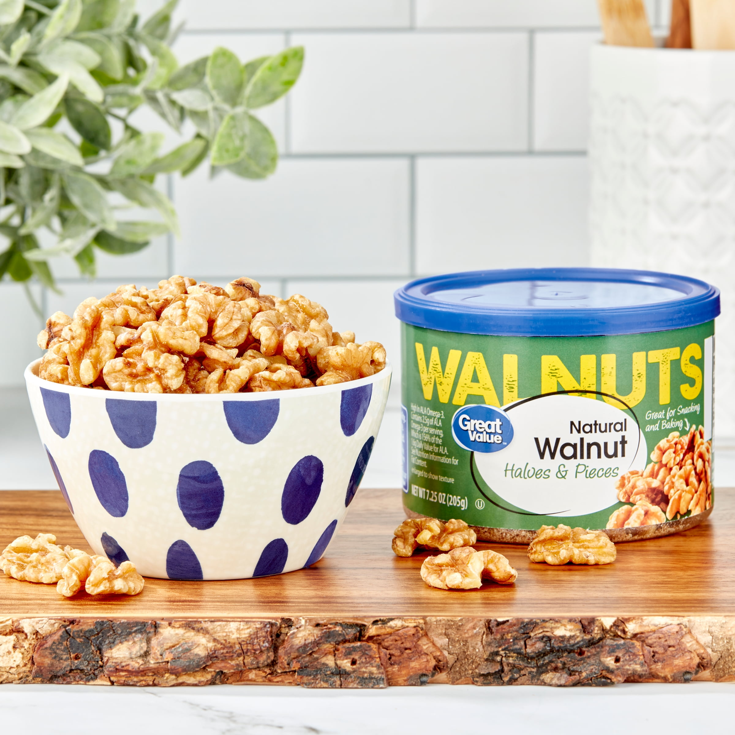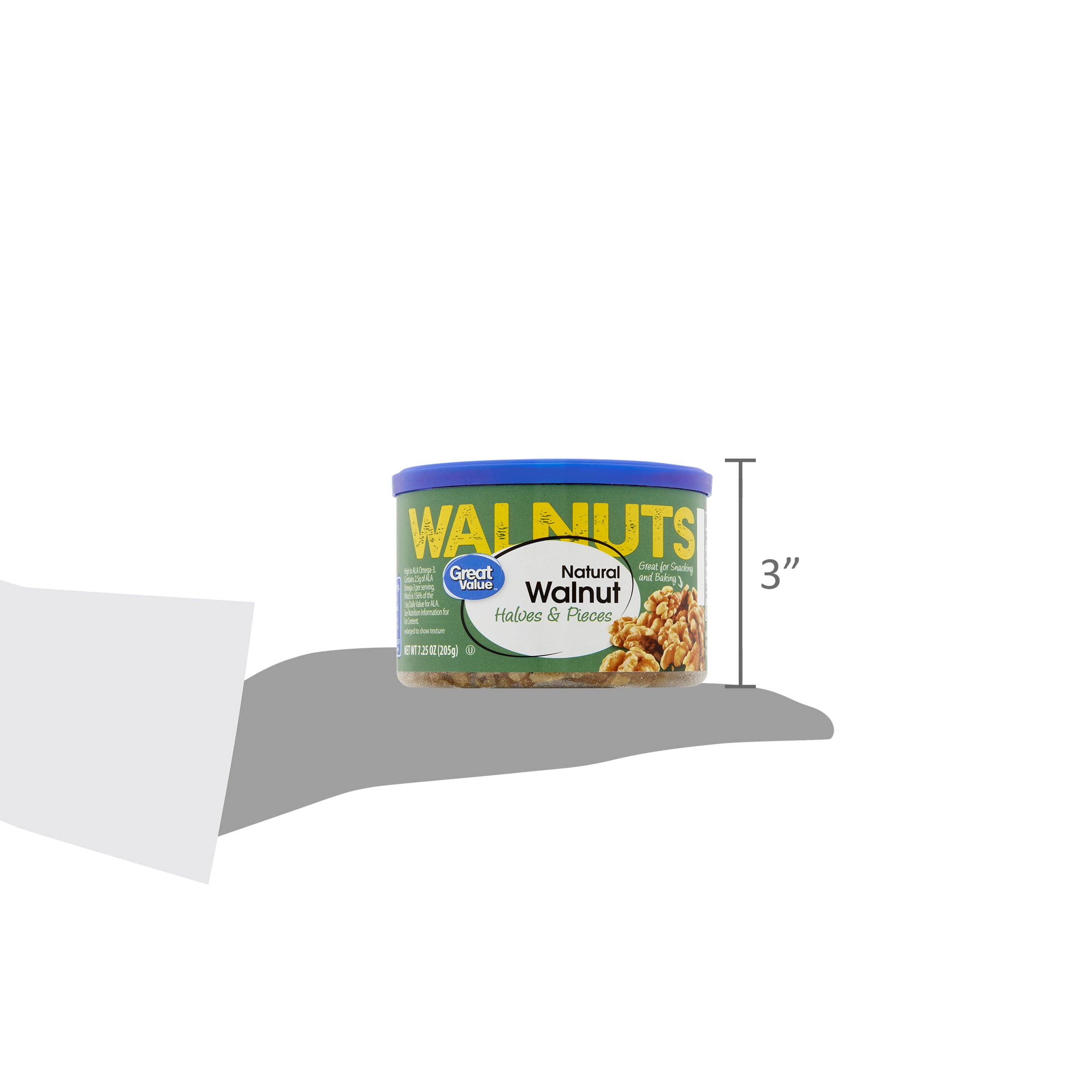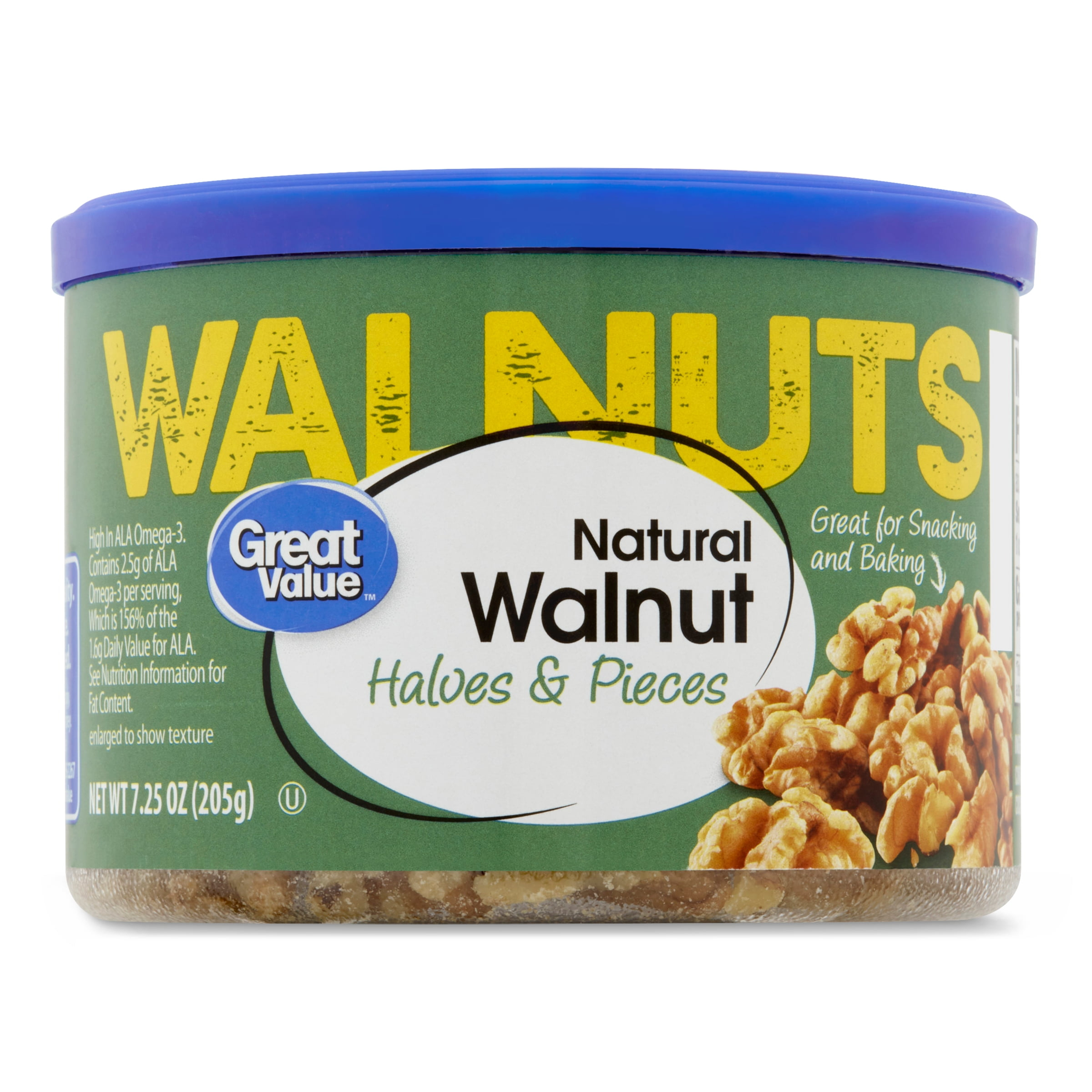 Great Value Natural Walnut Halves and Pieces are made from high-quality walnuts that make for a delightful crunchy snack. Walnuts are a rich source of ALA Omega-3 and proteins which makes them an excellent addition to your daily routine. These crunchy treats are great for snacking on throughout the day and can also be used to enhance the texture and flavor of your salads and baked goods. If you are in the mood to shake things up a little, they can also be used in your favorite trail mix and are excellent for adding to cereals, milkshakes and smoothies. Available to you in this convenient canister, these walnuts offer themselves as an excellent on-the-go snack. A healthier way to satisfy your hunger starts with Great Value Natural Walnut Halves and Pieces.