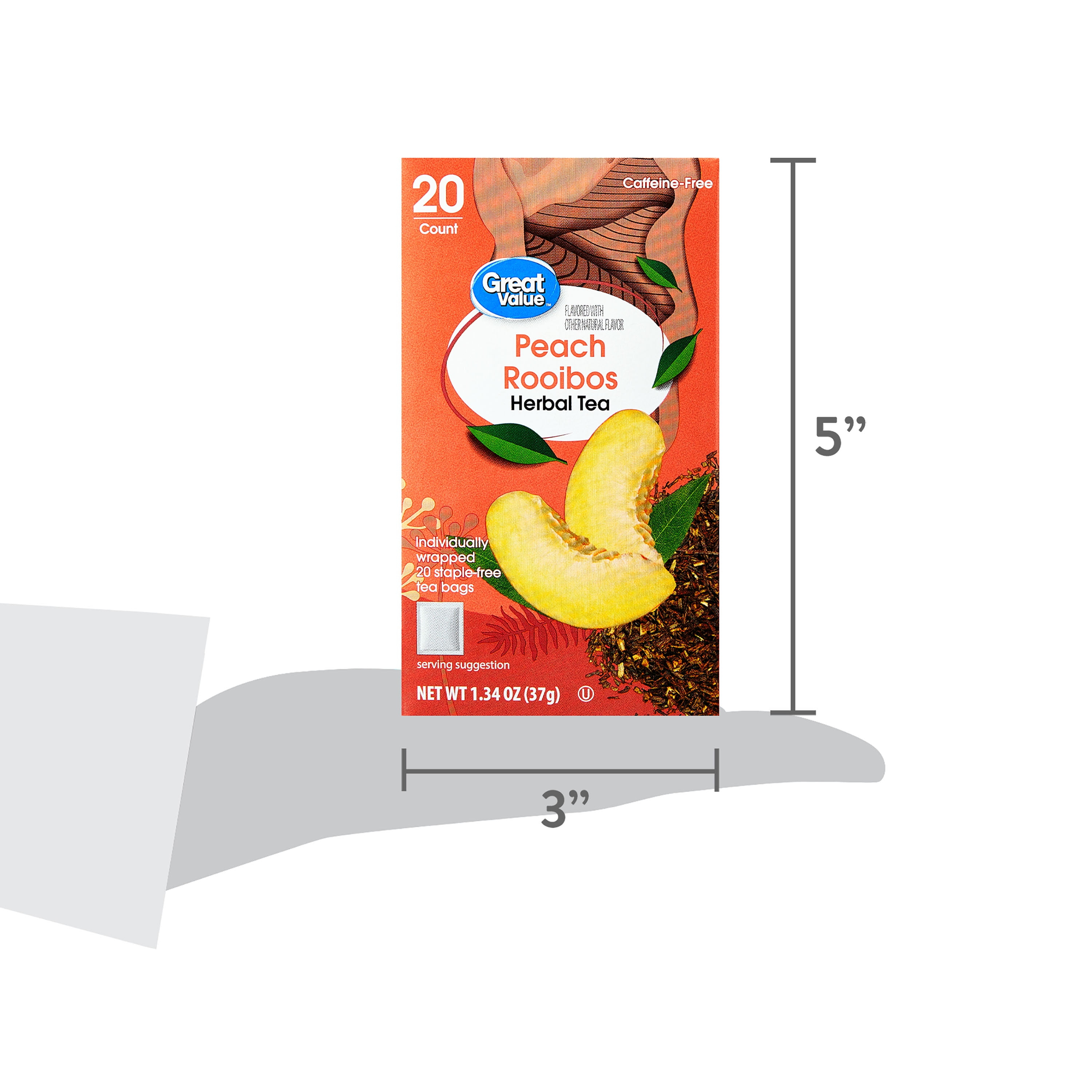 Whether prepared hot or enjoyed as a unique iced tea option, Great Value Peach Rooibos Herbal tea is a perfect addition to your herbal tea lineup. Rooted in a woody, nutty rooibos base, this blend also balances fruity, fresh-picked, ripe peach notes along with subtle hints of creamy vanilla. This light, fruity blend comes in a box of 20 individually wrapped, staple free tea bags and is caffeine-free and gluten-free. Explore your tea horizons with Great Value Peach Rooibos Herbal Tea.