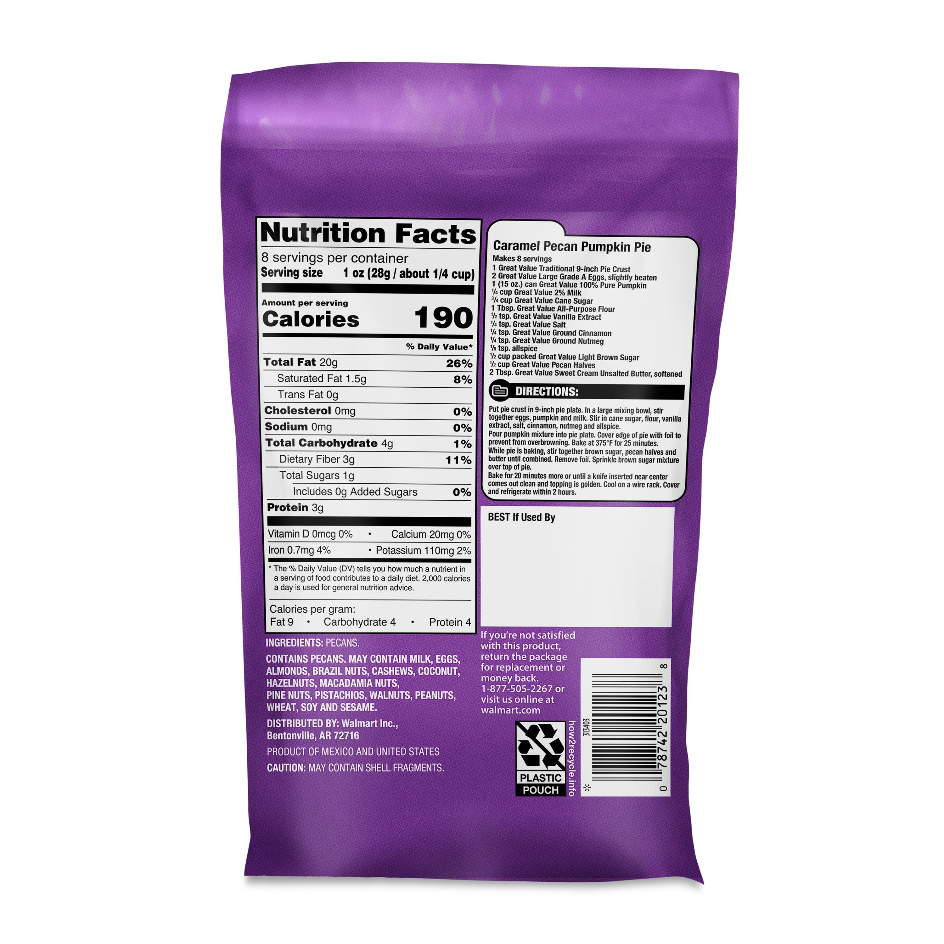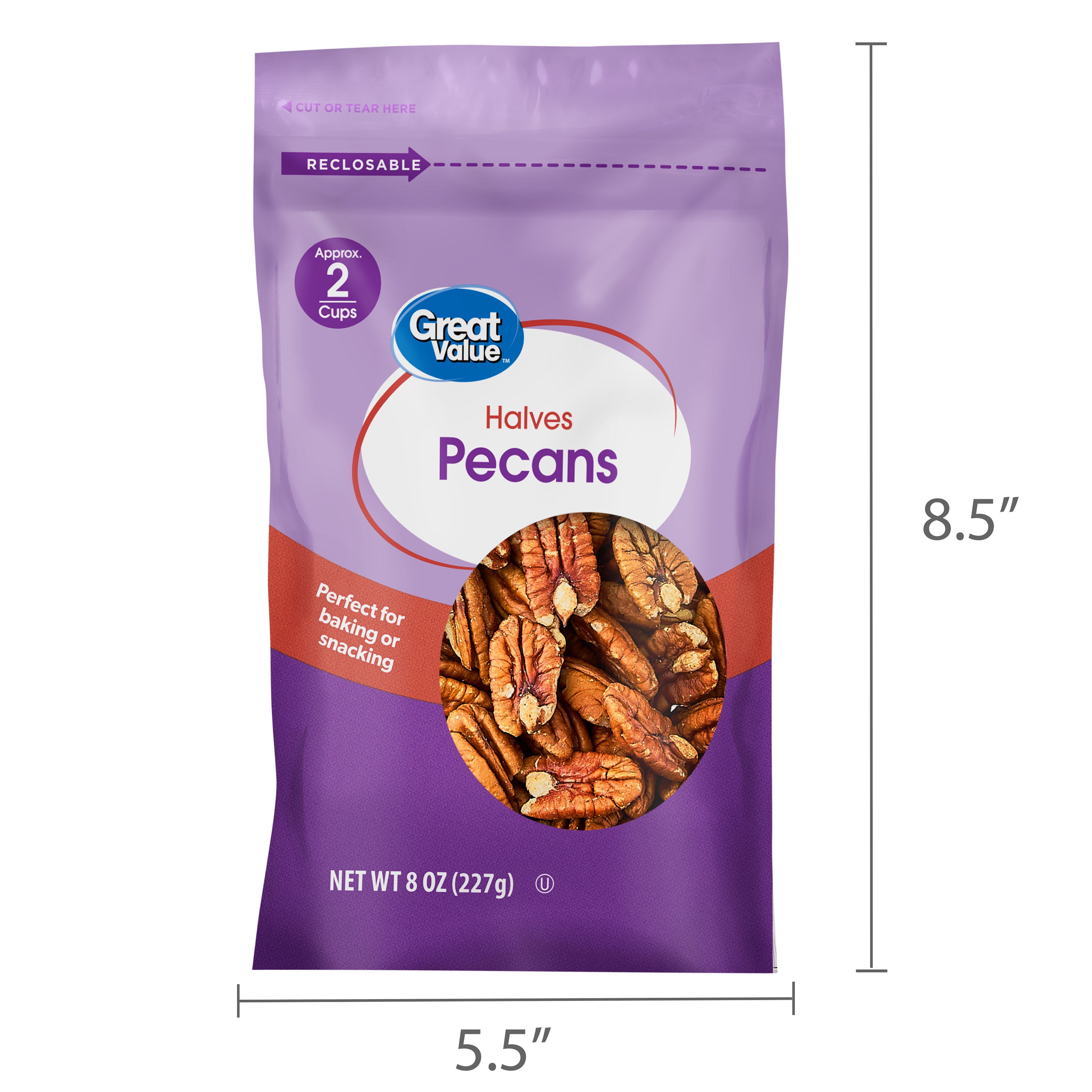 Great Value Pecan Halves are high-quality pecans that make for a perfect crunchy and savory snack. They are a rich source of healthy fats and fiber and make an excellent addition to your daily routine. These crunchy pecans are great for snacking and can also be used to enhance the texture and flavor of your salads and baked goods such as: cakes, pies, and cookies. You can even try making the decadent chocolate pecan pie recipe provided right on the bag They can also be used in your favorite trail mix and are great for topping on cereals, milkshakes, and smoothies. Available in a reclosable bag, they are an excellent on-the-go snack. Bring home Great Value Pecan Halves today!