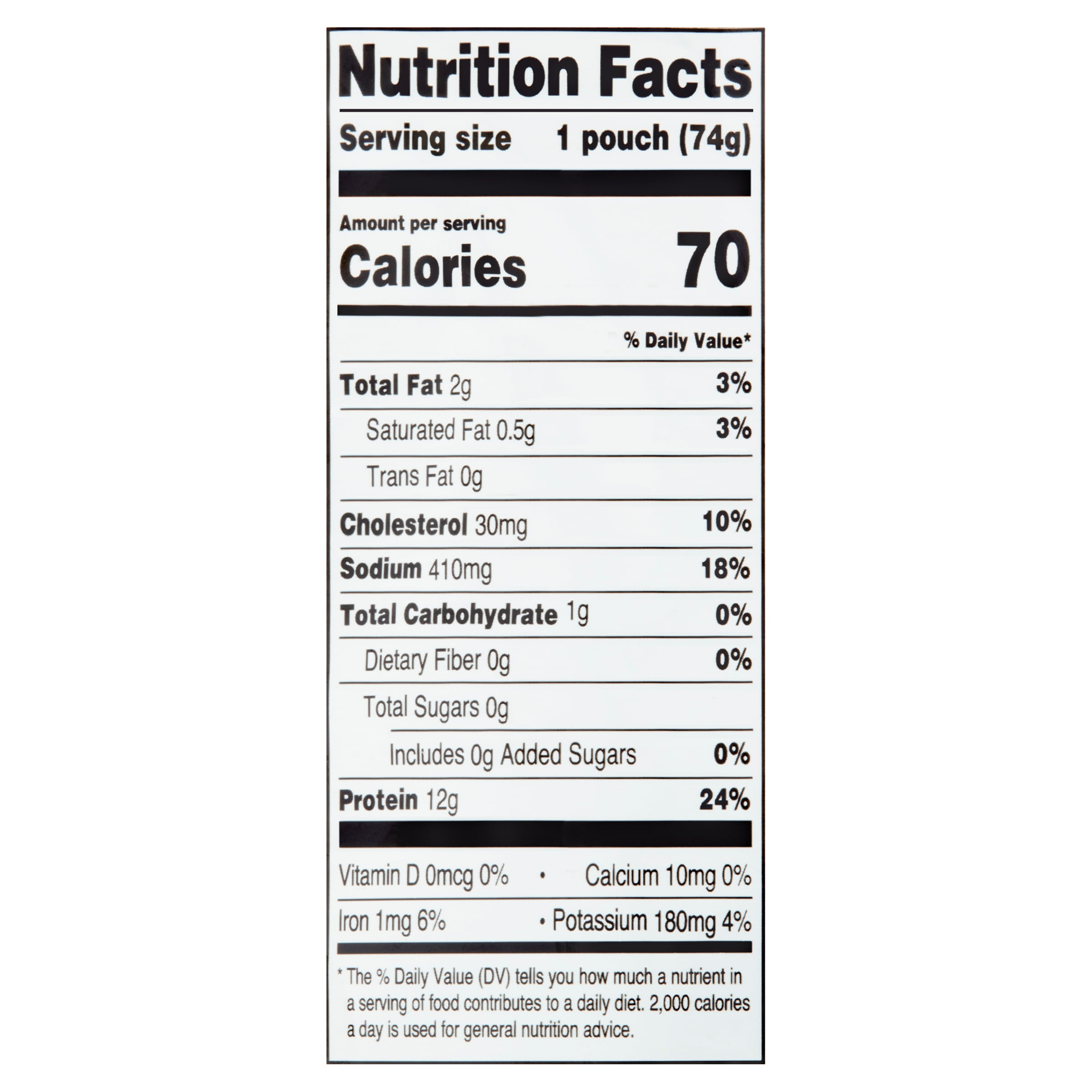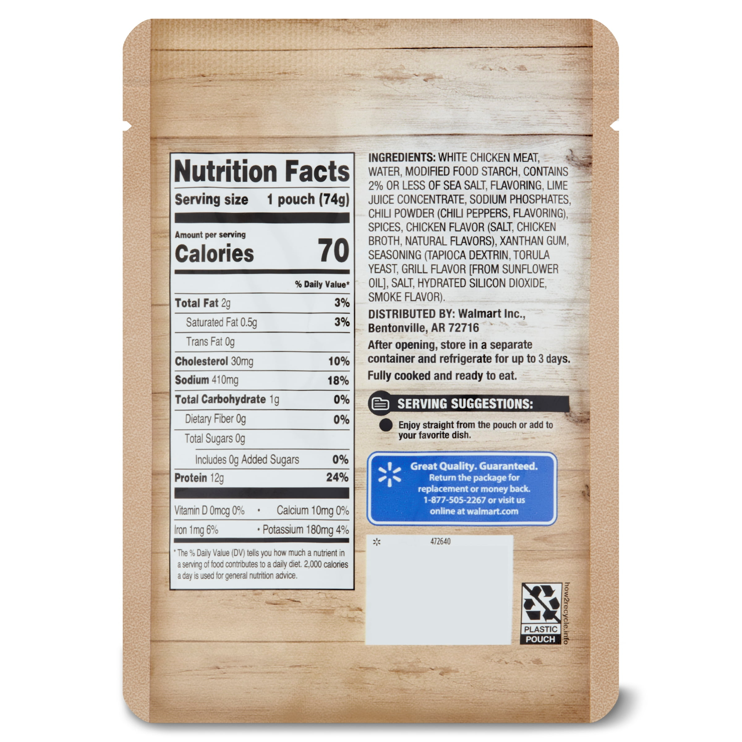 Add some delicious flavor to your next meal with Great Value Premium White Chicken. This fully-cooked chicken is gluten-free and comes in an irresistible fajita-flavored sauce. You can enjoy it straight from the pouch or you can use it to top off a salad or to add some flavor to your next pasta dish. This 2.6 ounce (74g) single-serving aluminum pouch has 12 grams of protein and only 70 calories. After opening, store in a separate container and refrigerate for up to three days. Your dinner just got better with Great Value Premium White Chicken in Fajita Flavored Sauce.
