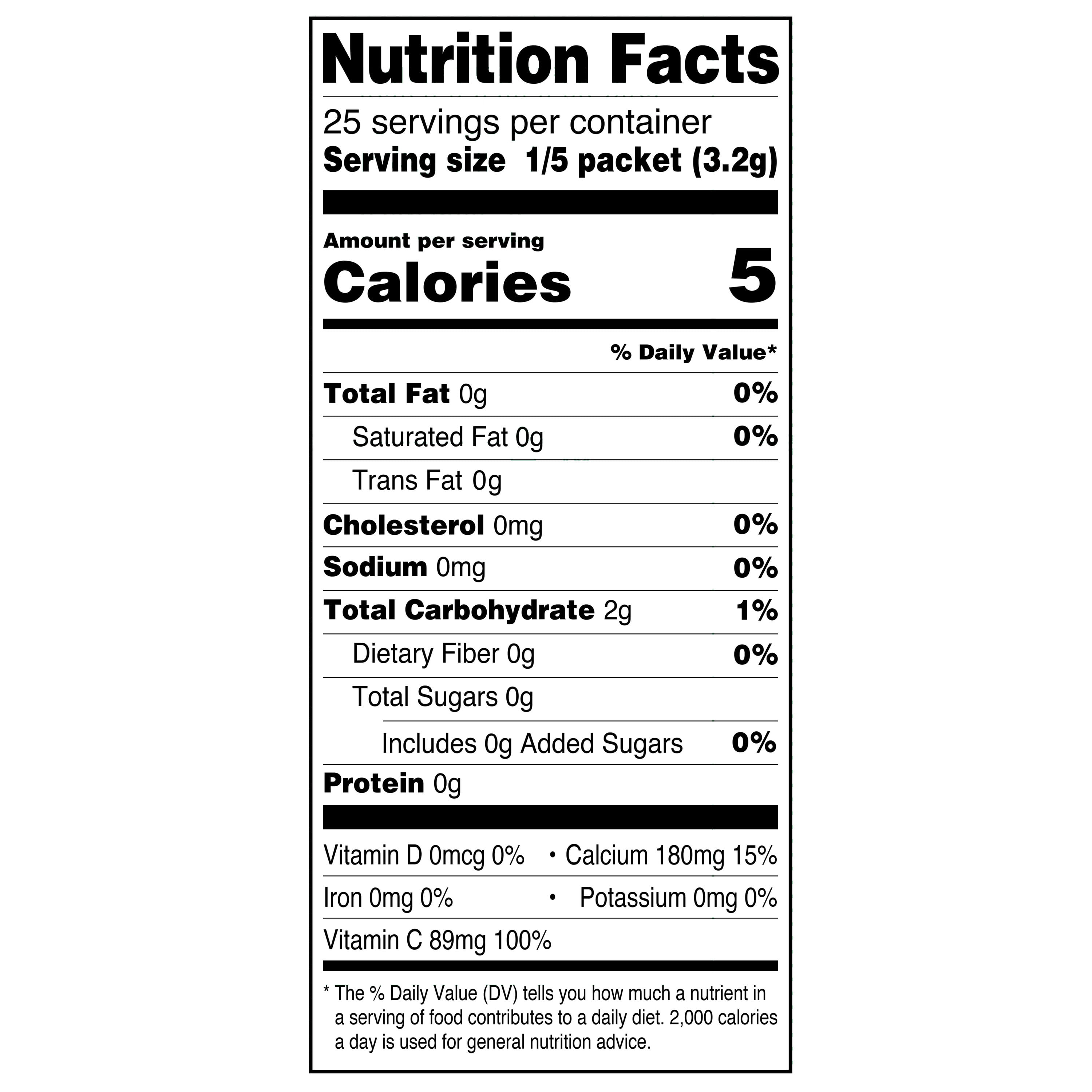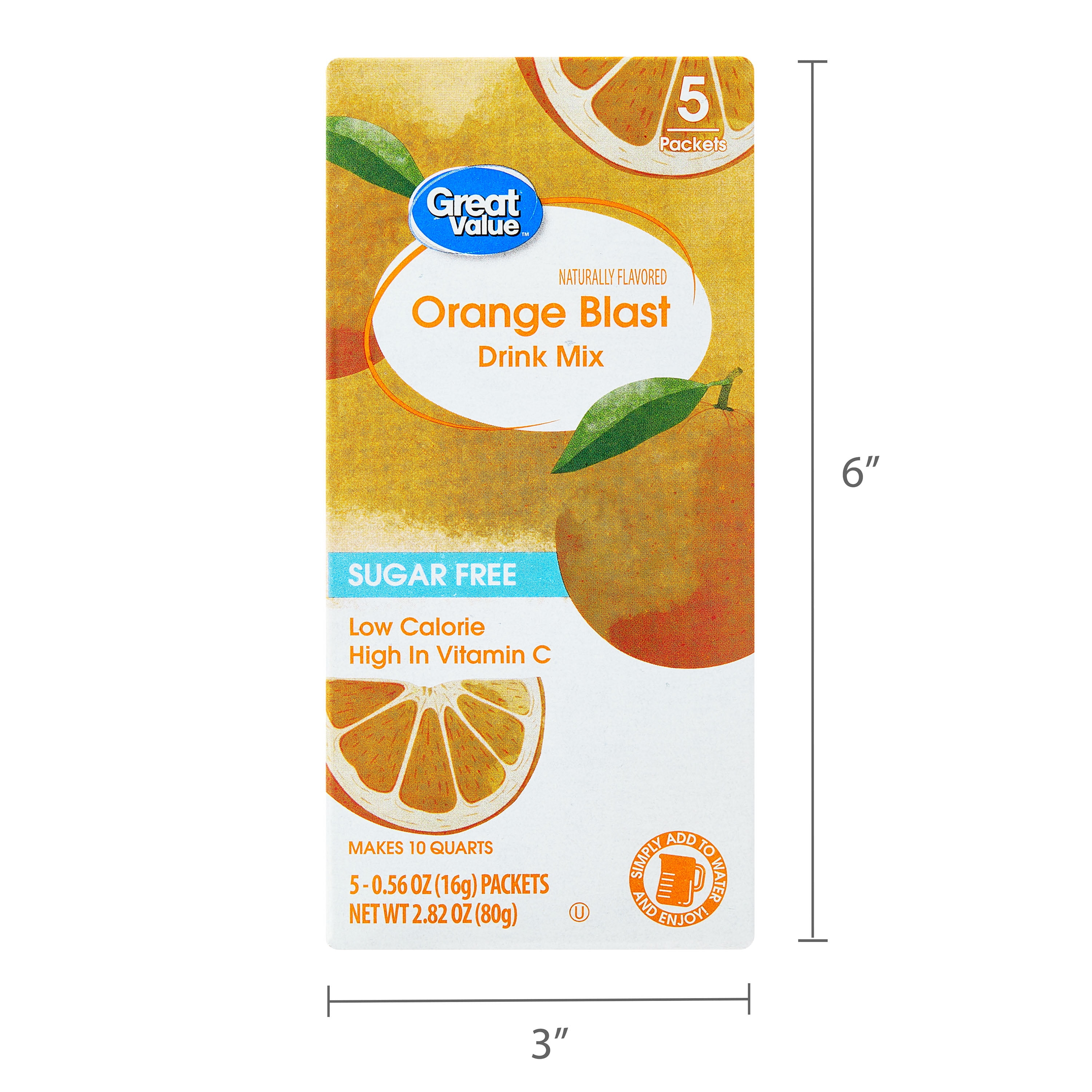 Great Value Sugar-Free Orange Early Rise Drink Mix delivers a burst of delicious orange flavor in every sip. This drink mix makes it easy to enjoy a healthy beverage at home, in the office or on the go. It is great for health-conscious individuals as it is sugar free and contains only five calories per serving. It also offers nutritional benefits as it is a great source of vitamin C. This pack comes with five individual packets of drink mix which makes a total of 10 quarts. Just add to water and watch this flavorful beverage come to life. Quench your thirst with the refreshing taste of Great Value Sugar-Free Orange Early Rise Drink Mix.