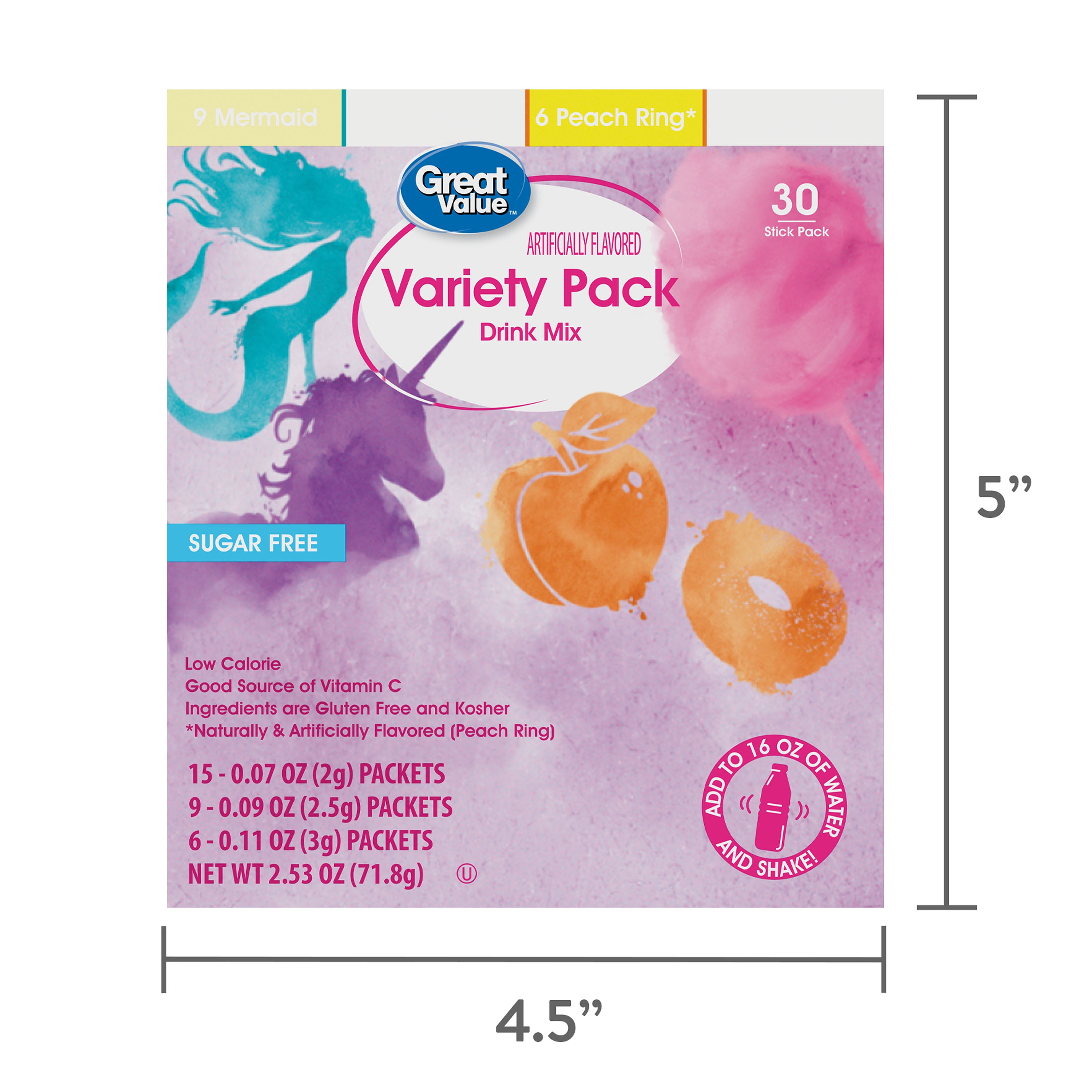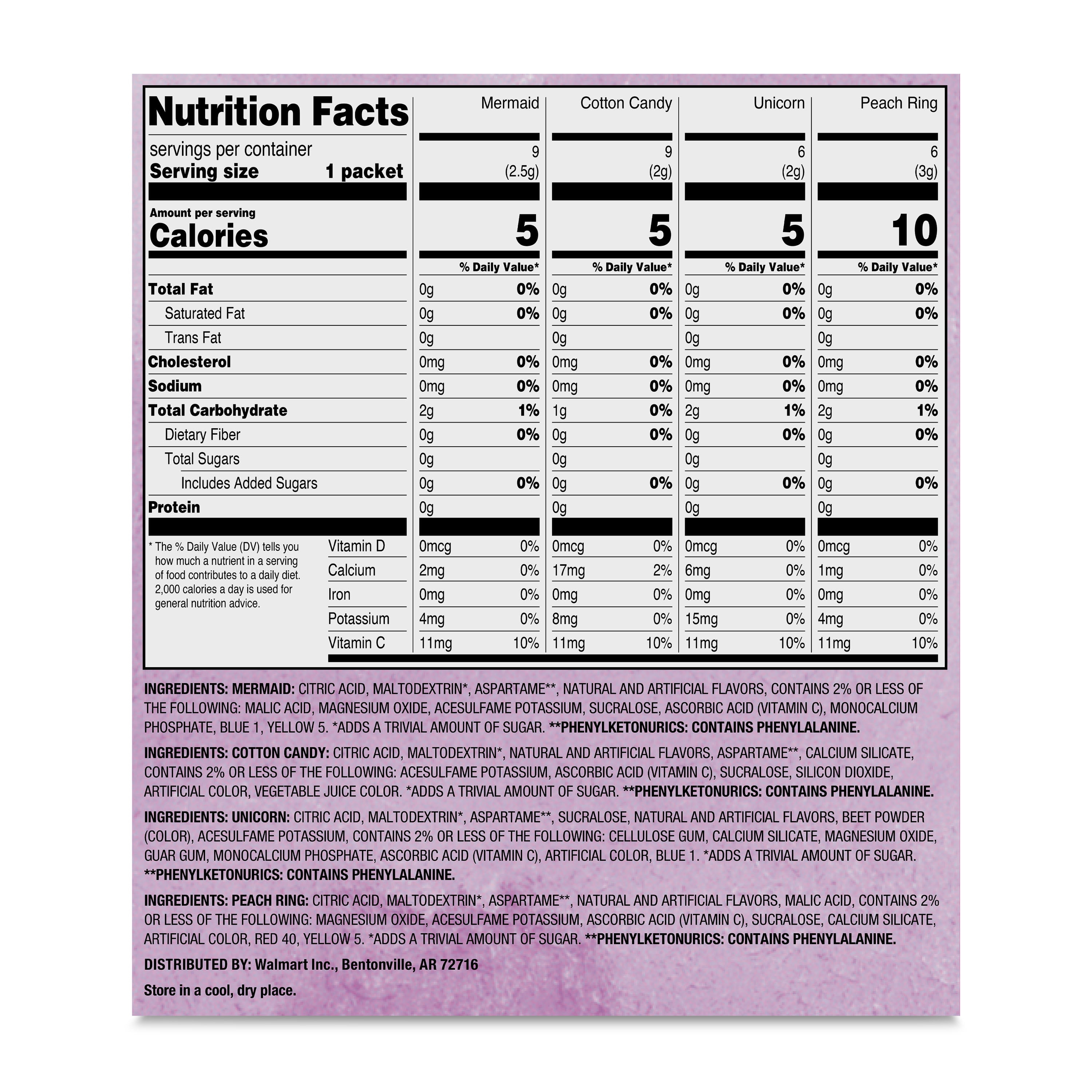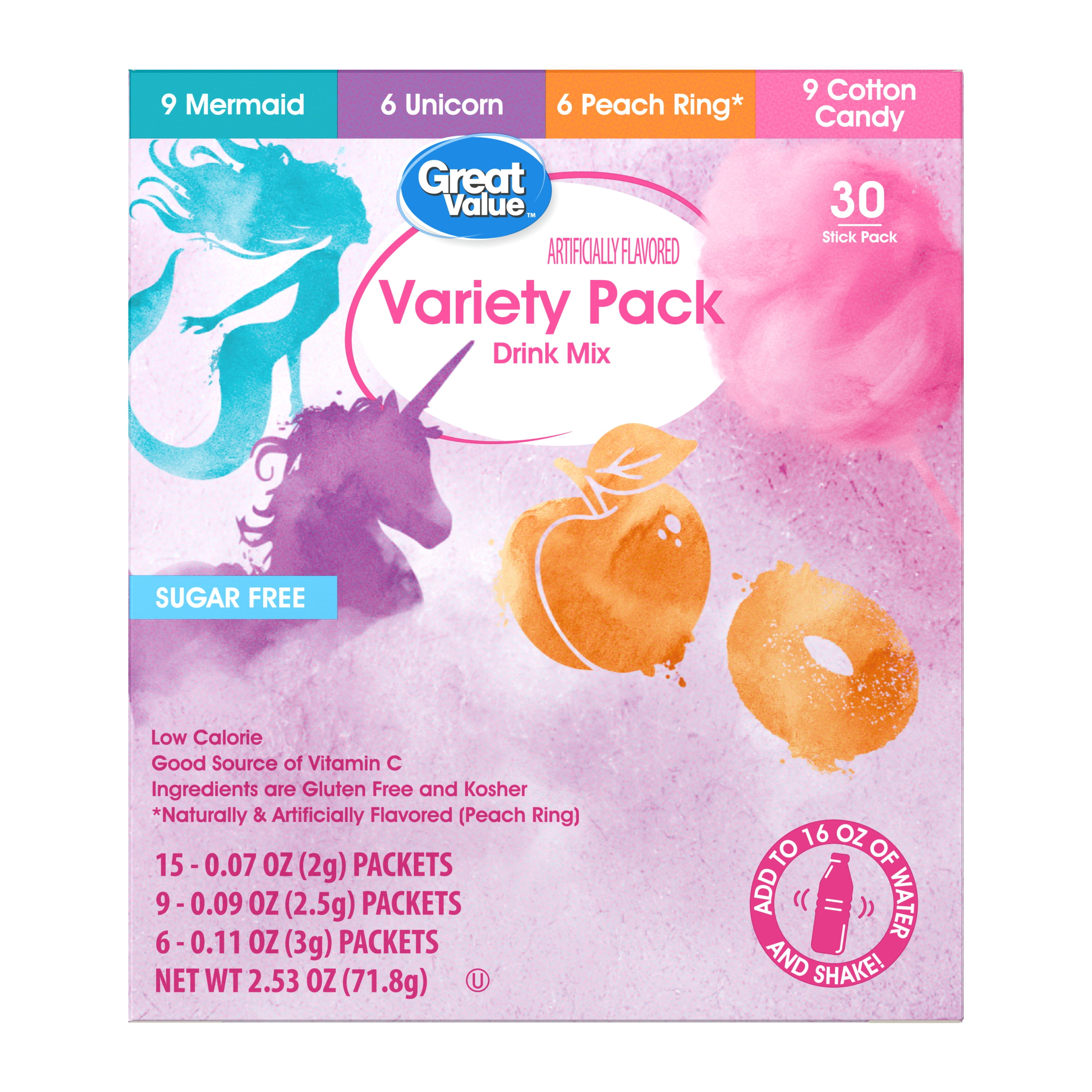 The Great Value Sugar-Free WaterTok Variety Pack Drink Mix is a refreshing low-calorie drink mix that comes in a handy box of 30 individual packets. Expertly blended with artificial flavors, these unique beverages have flavors like unicorn, mermaid, peach ring, and cotton candy. Simply empty into a 16-ounce bottle of water, shake well, and enjoy. Whether you’re at home, at work, or on an outdoor adventure, the Great Value Sugar-Free WaterTok Variety Pack Drink Mix is your go-to beverage.