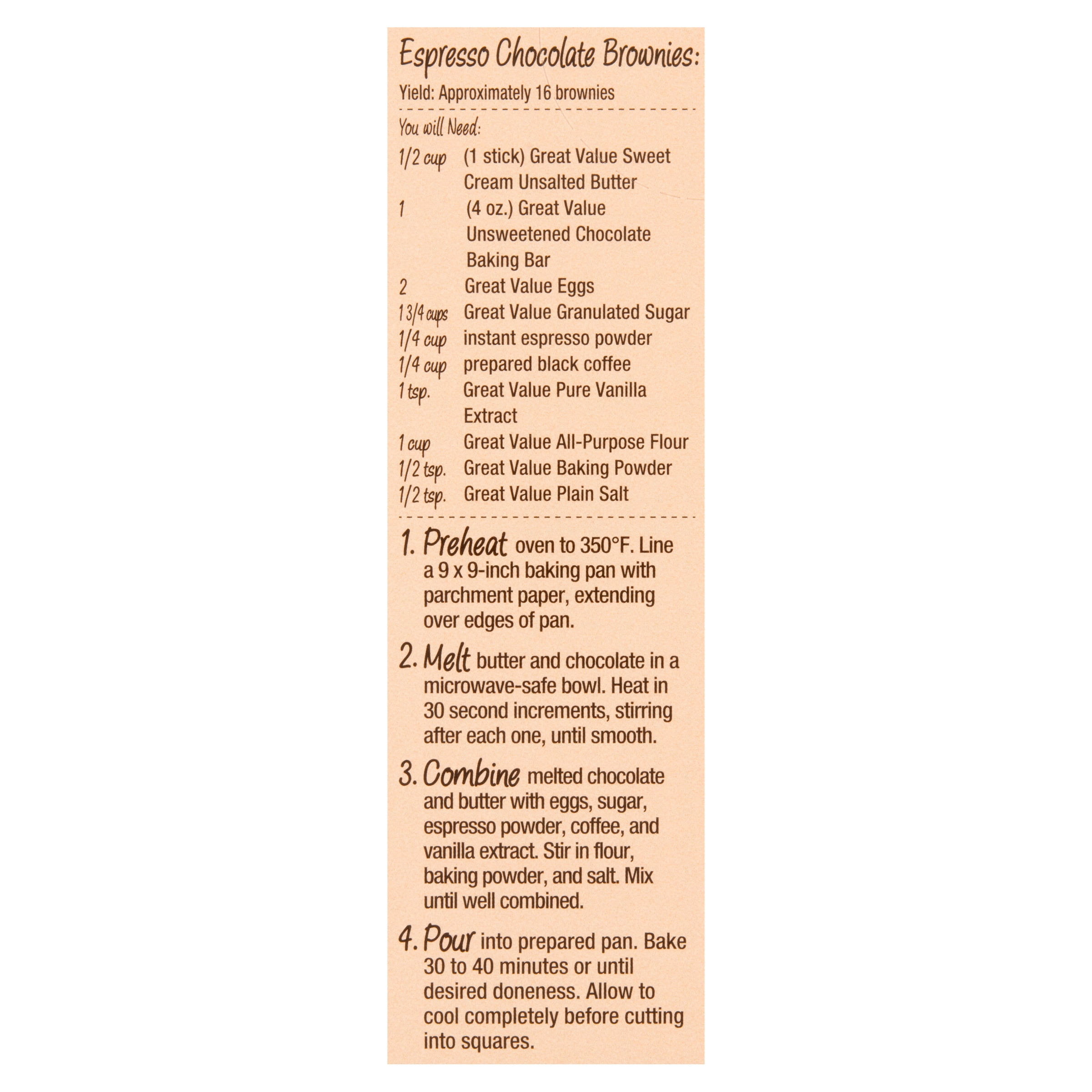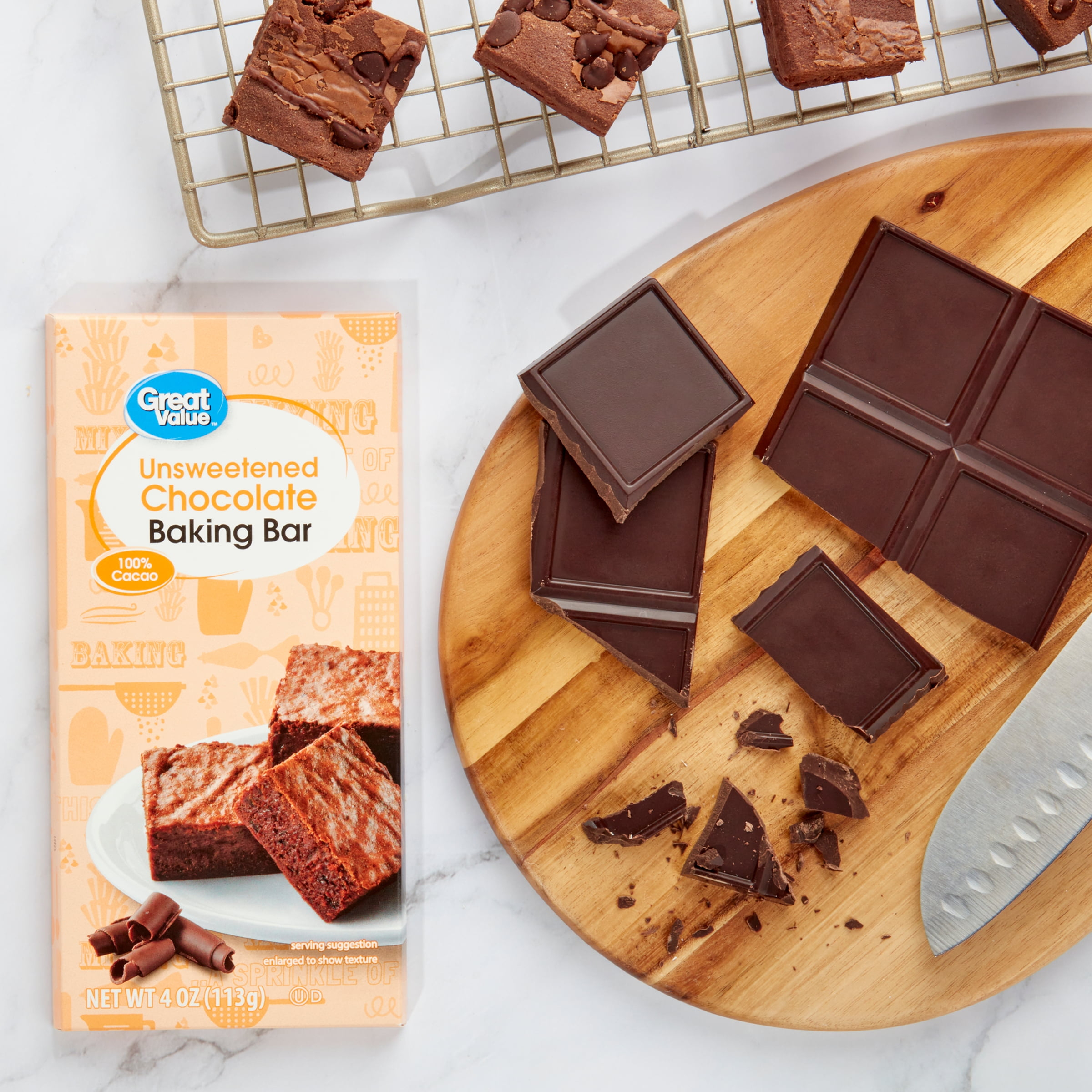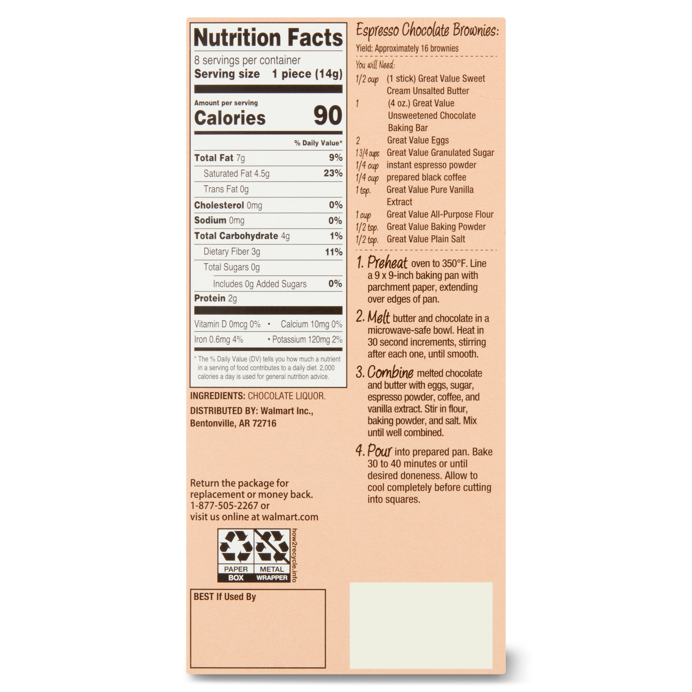 Create decadent treats with the Great Value Unsweetened Chocolate Baking Bar. Perfect for making mouthwatering brownies with walnuts, a light and airy chocolate pie, a sweet, dense chocolate fudge, and more. Made with 100 percent cacao, this chocolate bars add an intense chocolate flavor to your baking. With zero grams of sugar the bar allows you to control the amount of sugar you put in your recipes, so you can make them as sweet as you like. Use the Great Value Unsweetened Chocolate Baking Bar to add bold flavor to your recipes. Great Value products provide families with affordable, high-quality grocery and household consumable options. With our wide range of product categories spanning grocery and household consumables, we offer you a variety of products for your family’s needs. Our products are conveniently available online and in Walmart stores nationwide, allowing you to stock up and save money at the same time.