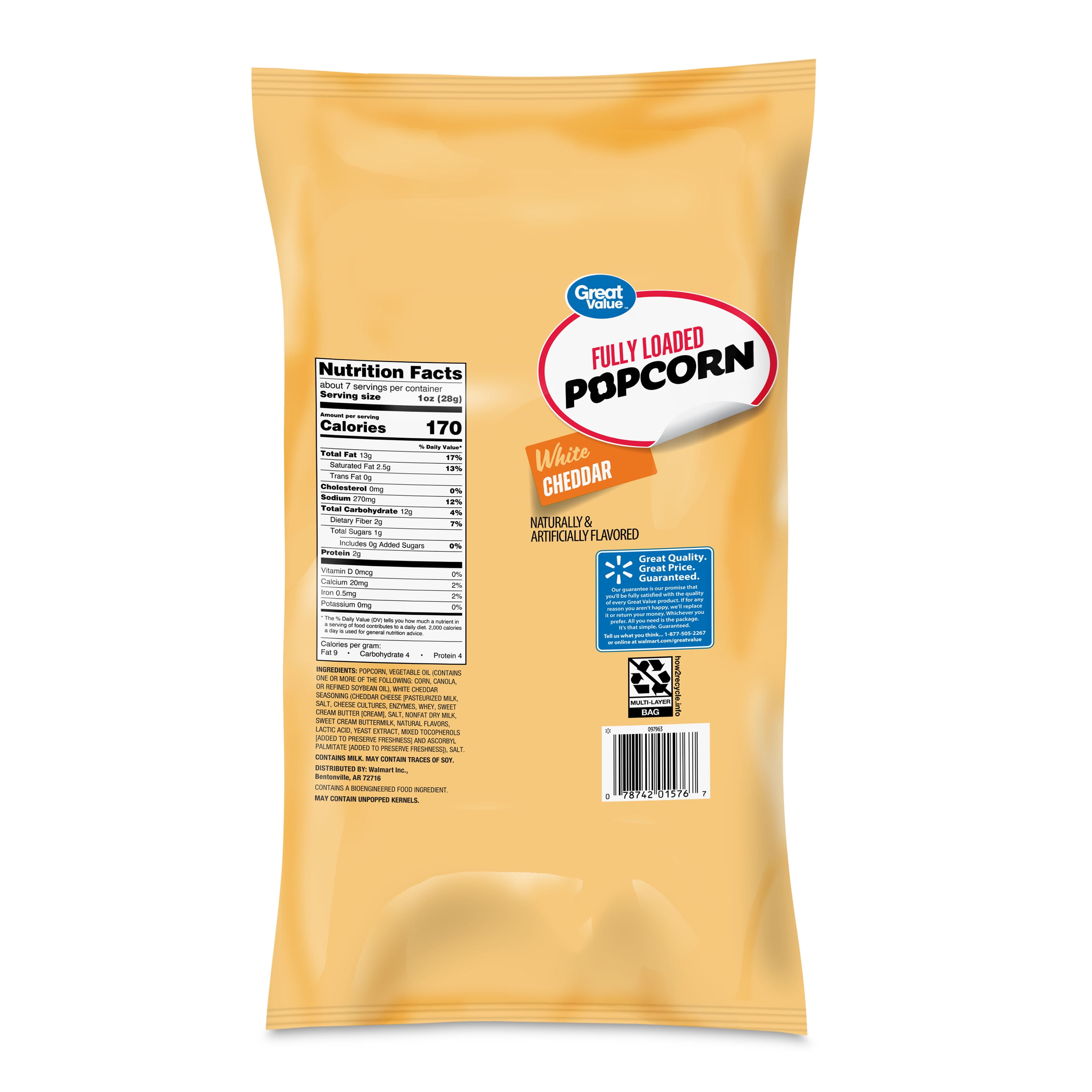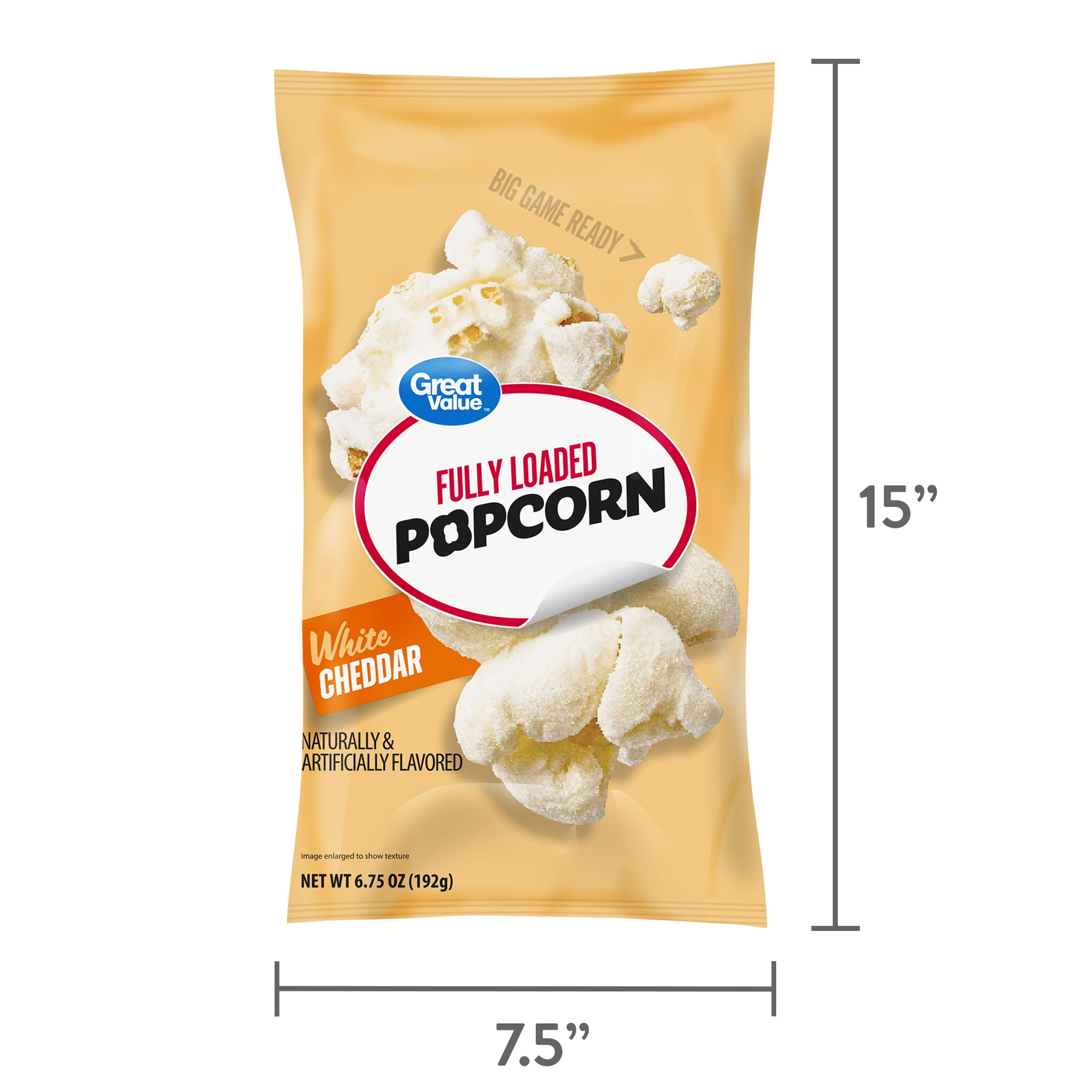 Great Value Fully Loaded White Cheddar Popcorn packs a flavorful punch with each handful. This white cheddar popcorn makes a great addition to any spread, whether it’s snacking during the big game or a savory treat at a birthday party. Each bag contains 6.75 ounces of fluffy popcorn coated with white cheddar flavor. This bag of popcorn contains about 7 servings of irresistible snacking. Stock your pantry with Great Value Fully Loaded White Cheddar Popcorn.