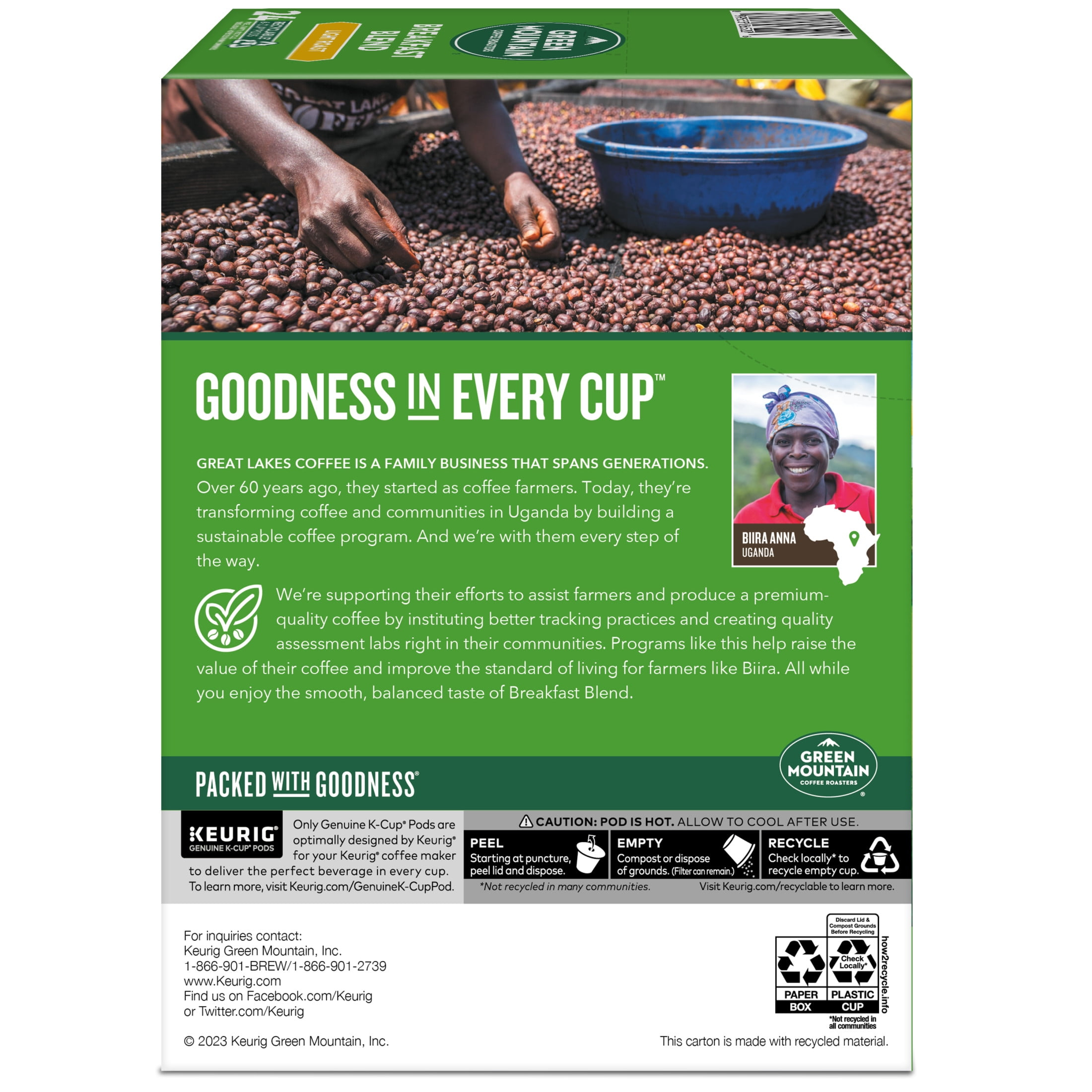 The mountains are a special place. It’s where Green Mountain Coffee Roasters was born. It’s where we developed our adventurous spirit and commitment to improving the lands through sustainably sourced coffee. We’re driven to bring the world a richer, better cup of coffee. Be bold. Be alive. Grab a cup and get out there. The Green Mountain Coffee Roasters Breakfast Blend is as eye-opening and delightful as the dawn itself. Clean and bright, with balanced sweetness, nutty flavor, and a silky mouthfeel. These single-serve K-Cup pods are compatible with all Keurig K-Cup Pod Single-Serve Coffee Makers. Each K-Cup pod is filled with the freshest ground coffee and brews a perfect, great tasting cup of coffee, every time. Certified Orthodox Union Kosher. What does being 100% responsibly sourced coffee mean? Responsibly Sourced means the coffee we purchase is grown and sold in adherence to a credible sourcing program that aligns with our company Responsible Sourcing Guidelines. Our coffee is 100% responsibly sourced. Introducing Recyclable* K-Cup Pods: Simple. Delicious. And now Recyclable. Enjoy the same great-tasting coffee you know and love, and when you’re done just peel, empty and recycle. *Check locally, not recycled in many communities. Packaging may vary. Great Lakes Coffee is a family business that spans generations. Over 60 years ago, they started as coffee farmers. Today, they’re transforming coffee and communities in Uganda by building a sustainable coffee program. And we’re with them every step of the way. We’re supporting their efforts to assist farmers and produce a premium-quality coffee by instituting better tracking practices and creating quality assessment labs right in their communities. Programs like this help raise the value of their coffee and improve the standard of living for farmers like Biira. All while you enjoy the smooth, balanced taste of Breakfast Blend.