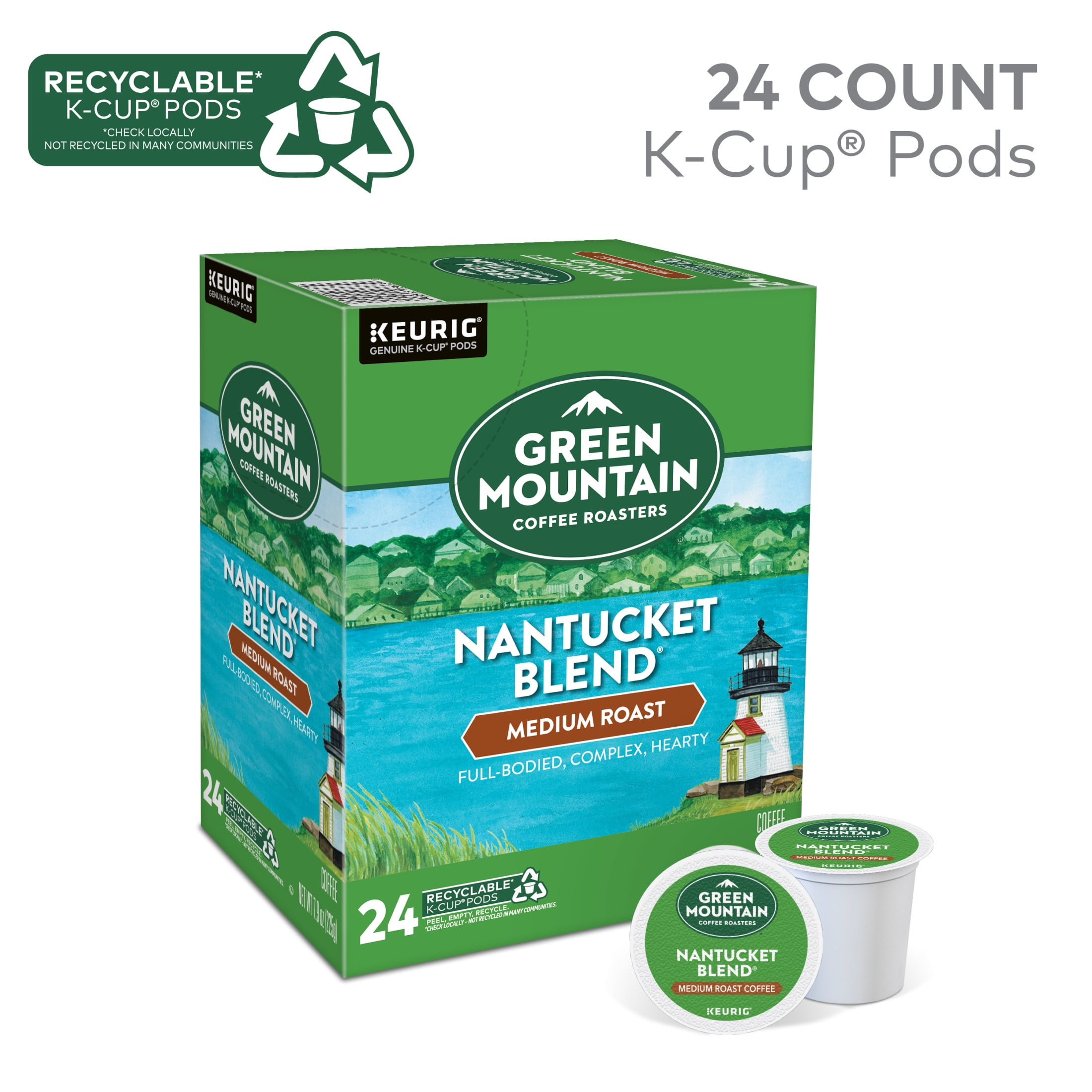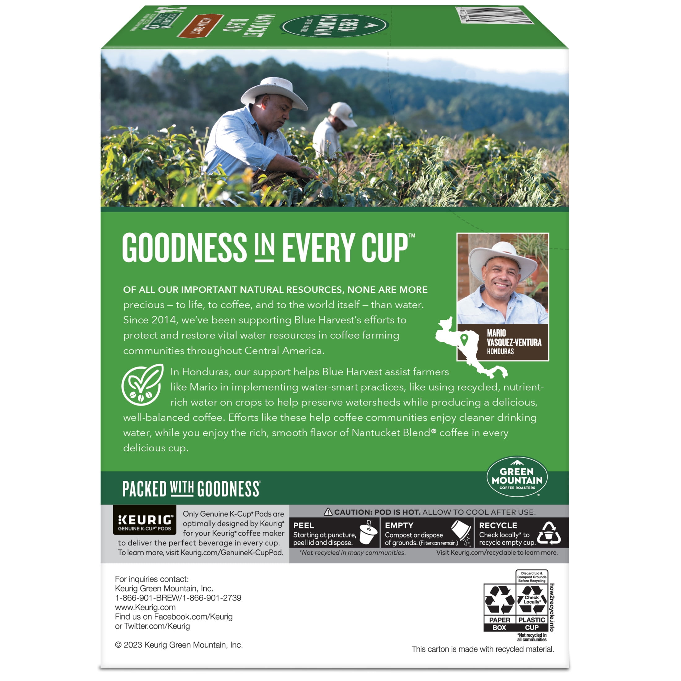 Of all our important natural resources, none are more previous – to life, to coffee, and to the world itself – than water. Since 2014, we’ve been supporting Blue Harvest’s efforts to protect and restore vital water resources in coffee and farming communities throughout Central America. In Honduras, our support helps Blue Harvest assist farmers like Mario in implementing water-smart practices, like using recycled, nutrient-rich water on crops to help preserve watersheds while producing a delicious well-balanced coffee. Efforts like these help coffee communities enjoy cleaner drinking water, while you enjoy the rich, smooth flavor of Nantucket Blend coffee in every delicious cup. The mountains are a special place. It’s where Green Mountain Coffee Roasters was born. It’s where we developed our adventurous spirit and commitment to improving the lands through sustainably sourced coffee. We’re driven to bring the world a richer, better cup of coffee. Be bold. Be alive. Grab a cup and get out there. The Green Mountain Coffee Roasters Nantucket Blend is complex mix of rich flavors from berry-hued African beans, carefully woven together with robust Indonesian beans and a touch of smoky French Roast. Caramel, chocolate, and dried fruit notes bring balance to the full-bodied, hearty blend. These single-serve K-Cup pods are compatible with all Keurig K-Cup Pod Single-Serve Coffee Makers. Each K-Cup pod is filled with the freshest ground coffee and brews a perfect, great tasting cup of coffee, every time. Certified Orthodox Union Kosher. What does being 100% responsibly sourced coffee mean? Responsibly Sourced means the coffee we purchase is grown and sold in adherence to a credible sourcing program that aligns with our company Responsible Sourcing Guidelines. Our coffee is 100% responsibly sourced.