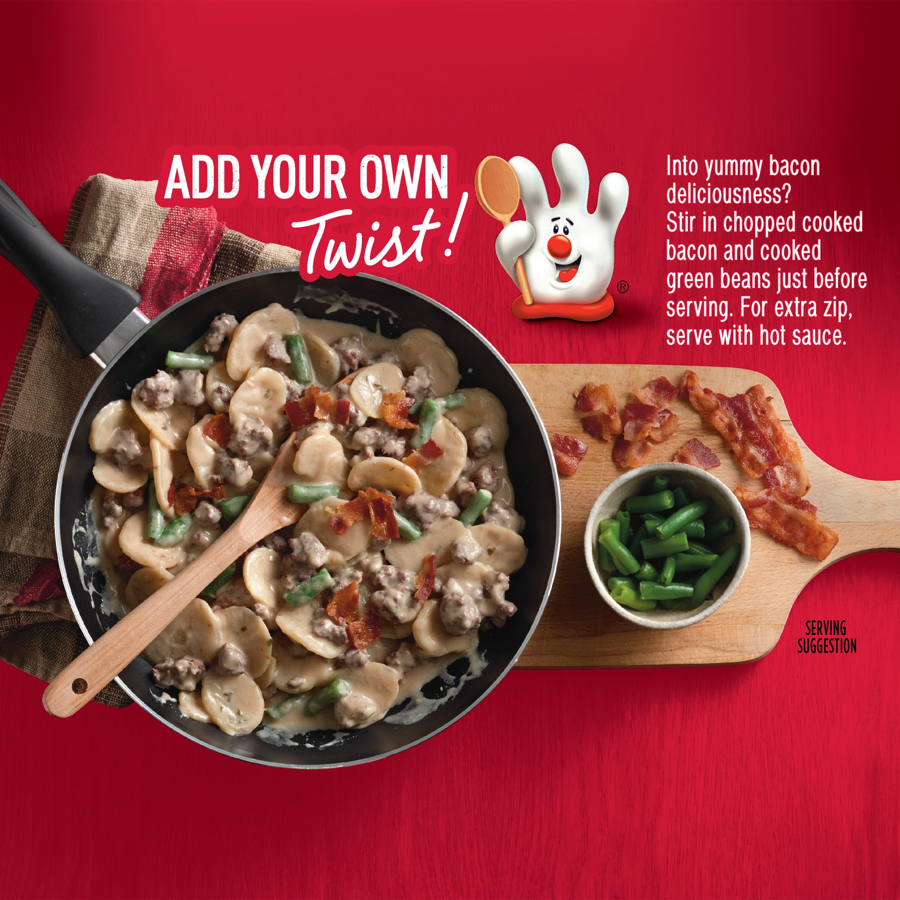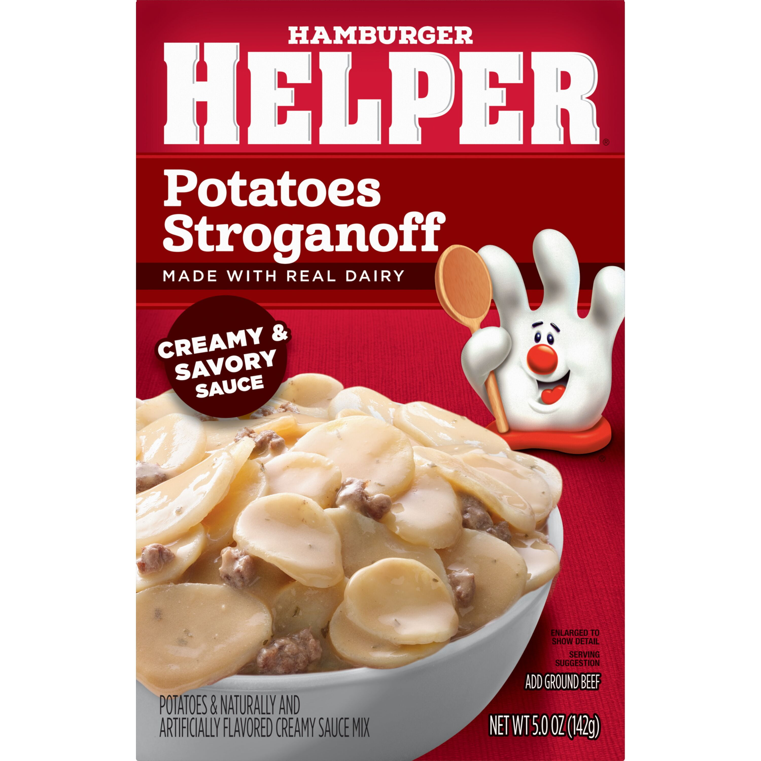 Potatoes Stroganoff Hamburger Helper is made with REAL herbs and spices for the flavors you love most. Add Your Own Twist! Into yummy bacon deliciousness? Stir in chopped cooked bacon and cooked green beans just before serving. For extra zip, serve with hot sauce.