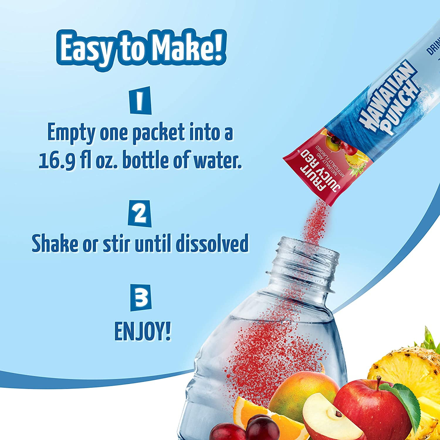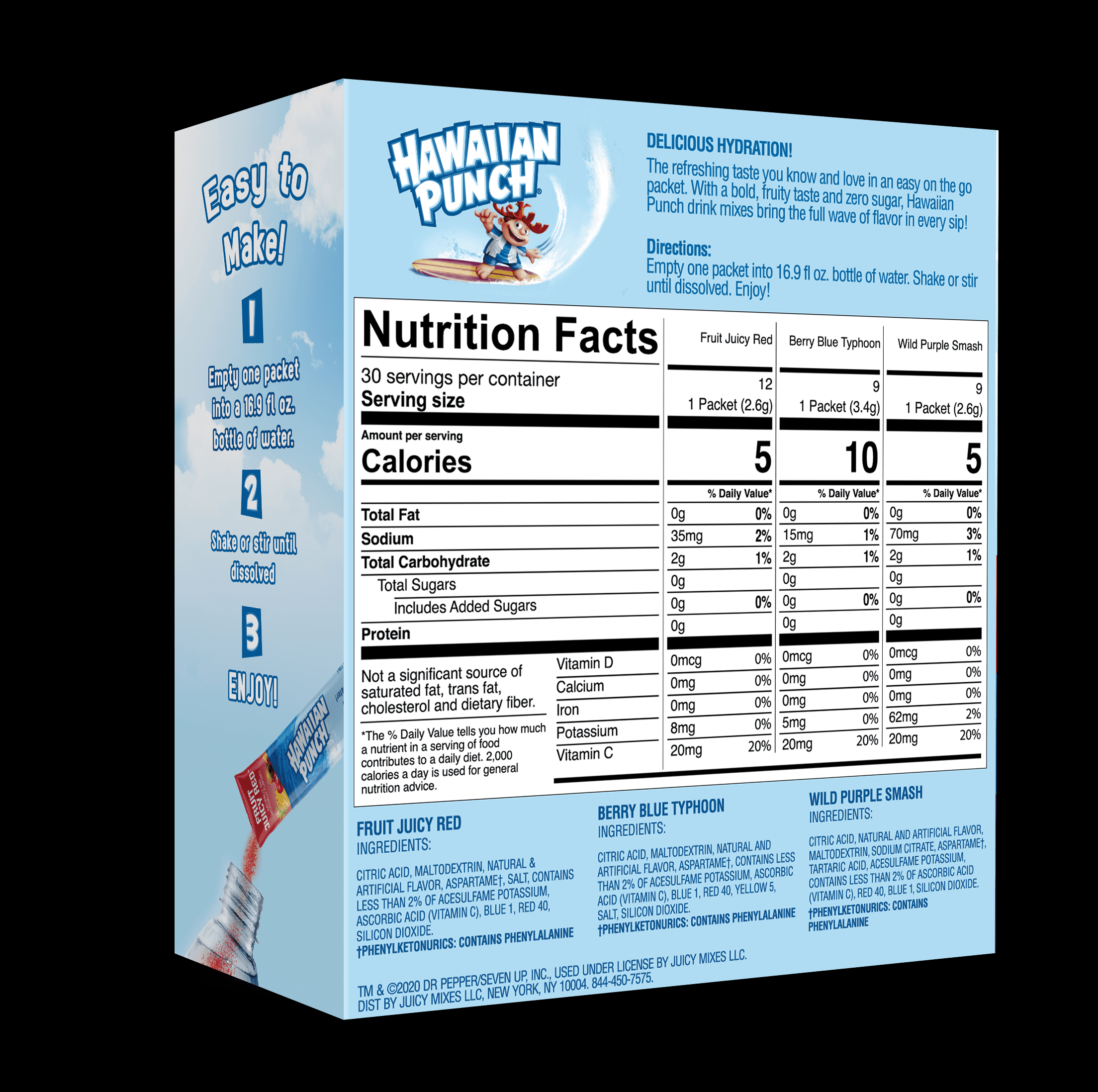 The refreshing taste you know and love in an easy on-the-go packet. With a bold, fruity taste and zero sugar, Hawaiian Punch drink mixes bring the full wave of flavor in every sip! Available in a variety of delicious flavors, Hawaiian Punch Powder Drink Mix is for consumers looking for a fun way to flavor their water without all of the extra sugar. Easily make your own flavored water at home or on the go with these portable drink mix sticks. To use, mix 1 packet with 16 fl oz of water. Use with your soda stream to make Hawaiian Punch flavored sodas or pack in your children’s lunch box to make them the most popular kid at the lunch table. Hawaiian Punch drink mixes will have the whole family drinking 8+ glasses of water each day!