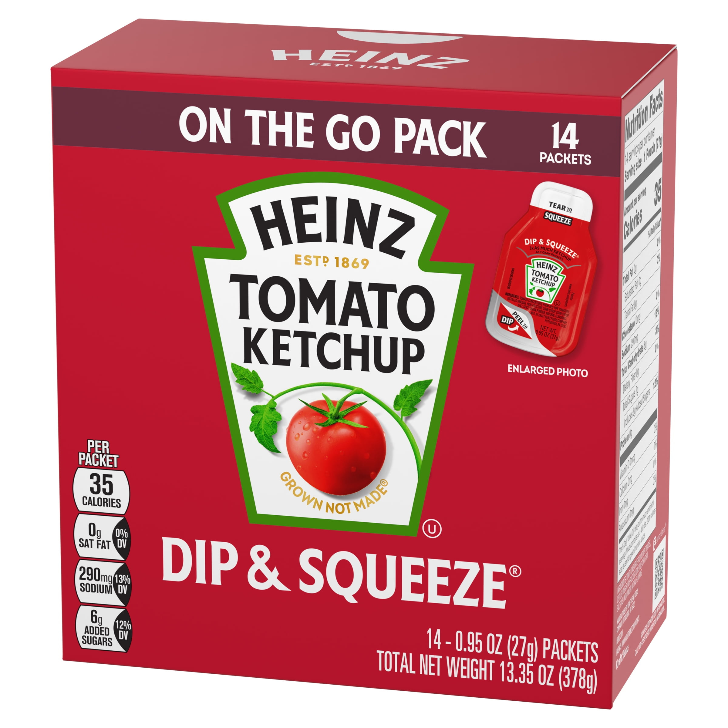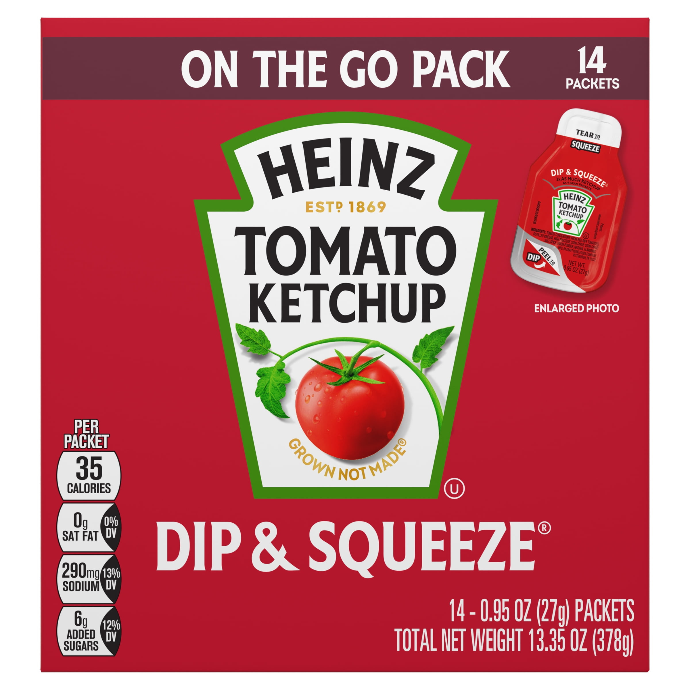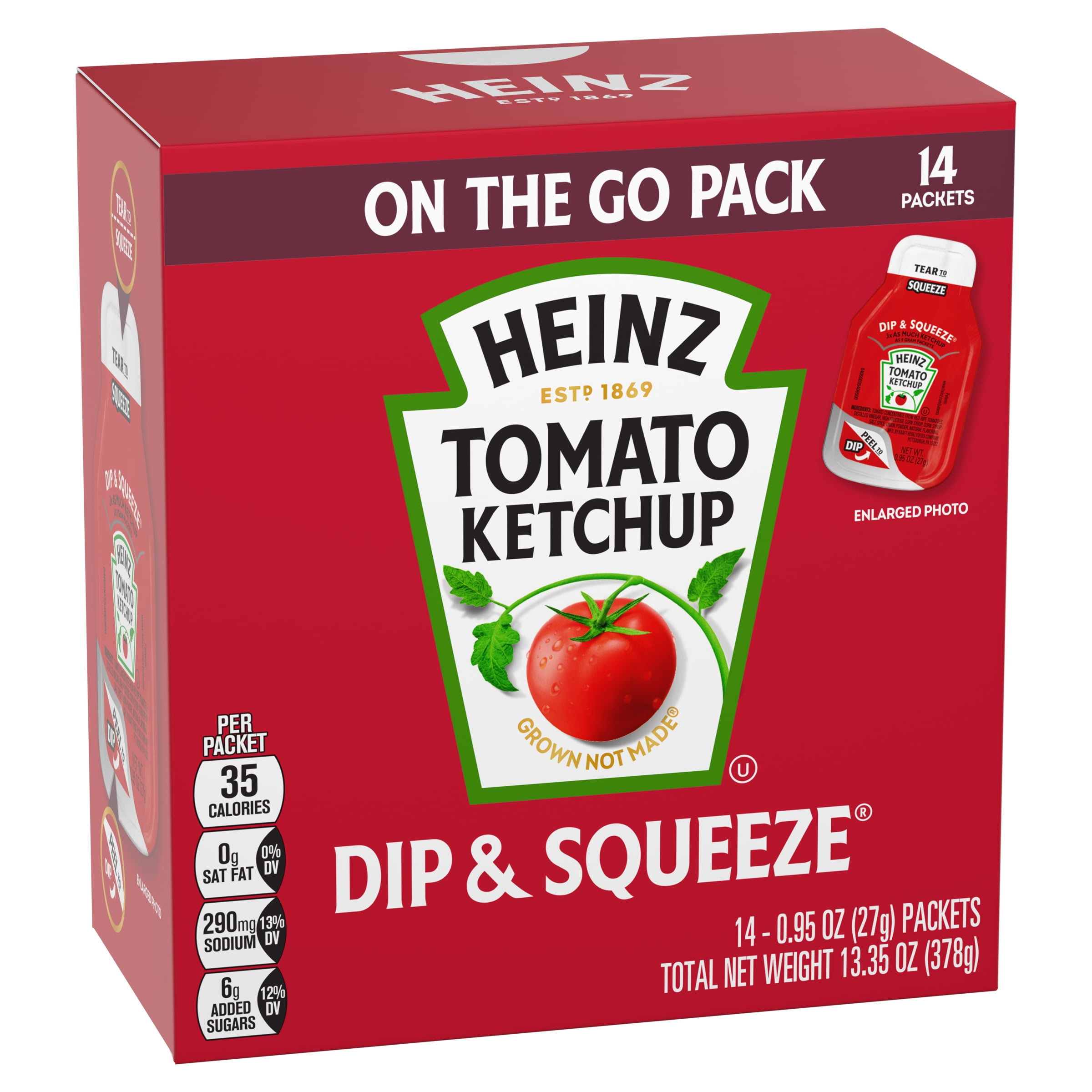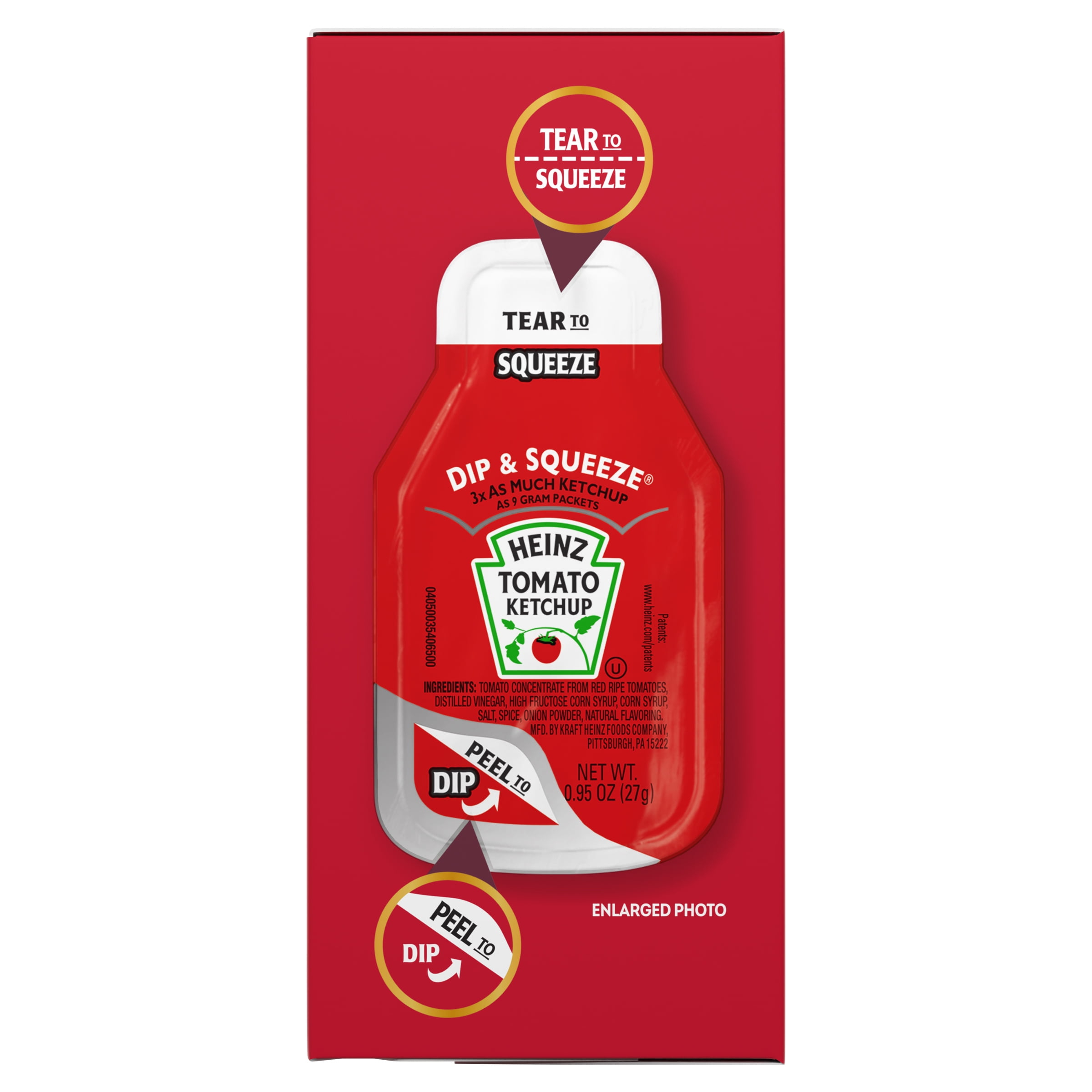 Heinz has reinvented the Ketchup packet with the innovative Dip & Squeeze single serve packets. Tear away one end to squeeze ketchup as a topping or peel away the other end to create a dunking container. Nothing else tastes like Heinz and that’s why our tomatoes come from Heinz seeds grown by farmers we know and trust. For over 150 years, Heinz has been America’s Favorite Ketchup®.
