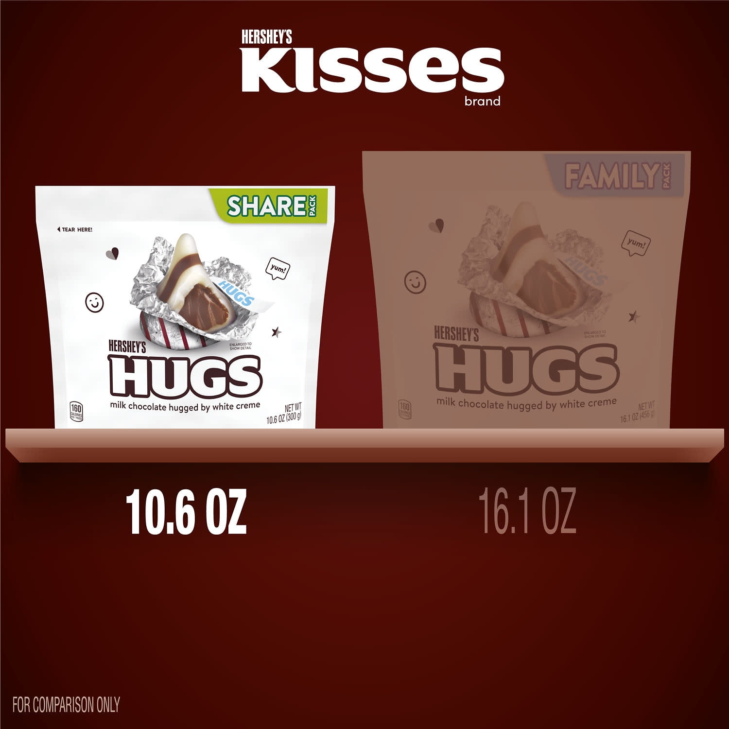 HERSHEY’S HUGS milk chocolate and white creme candies have the milk chocolate taste you know and love hugged by smooth, delectable white creme. Individually wrapped in stunning silver foils with red stripes, these kosher certified treats make the perfect treat to keep at home or in the office. Unwrap them and you’ll find even more stripes thanks to the contrast of creamy milk chocolate and white creme. Featured in a share pack, you can fill your candy dishes, lunch boxes and snack drawers with HERSHEY’S HUGS candy.