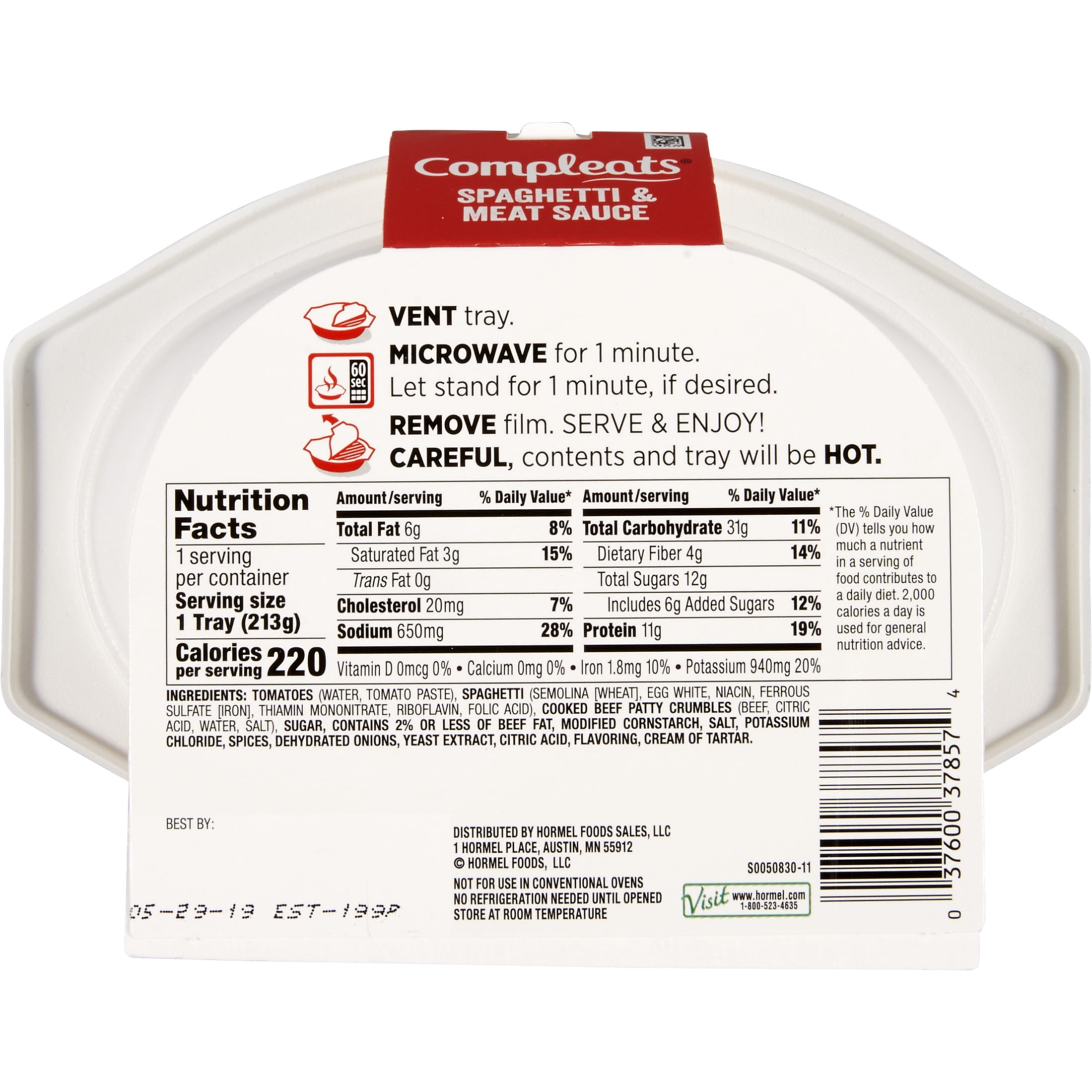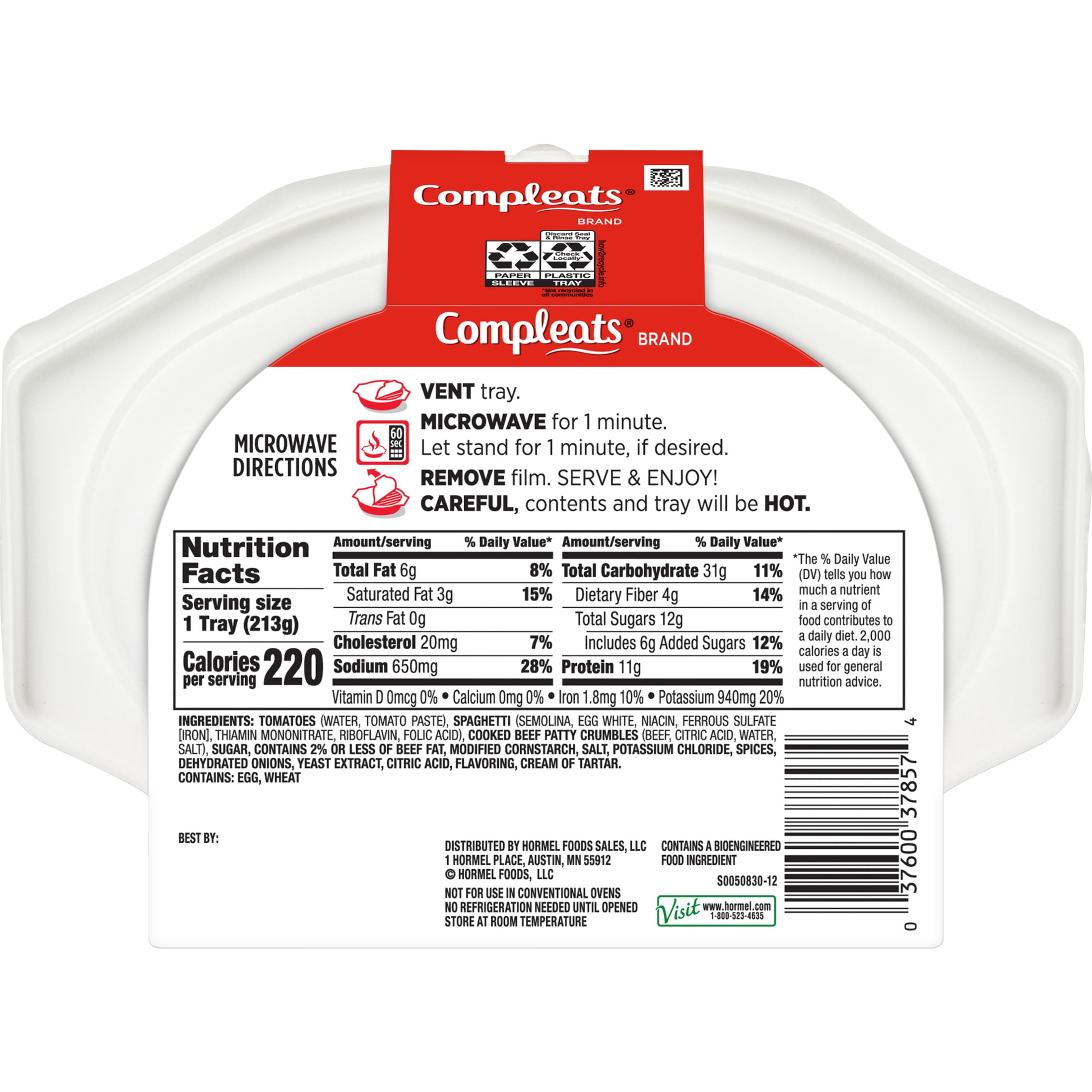 Real Food, Real Fast! HORMEL COMPLEATS Spaghetti & Meat Sauce is comfort food ready in 60 seconds. Our recipe is made with a traditional spaghetti pasta and savory meat sauce and is sure to satisfy your craving for delicious comfort food! Our microwave trays are shelf stable and go from shelf to table, no prep, no mess and no clean up! No fridge or freezer needed – put it in your pantry! HORMEL COMPLEATS entrees are made with high quality ingredients and homestyle recipes. A convenient lunch or a dinner whenever hunger hits. It’s America’s #1 selling shelf stable tray*. HORMEL COMPLEATS Spaghetti & Meat Sauce provides big flavor and a big value! With 11 grams of protein per serving and no artificial ingredients it’s sure to satisfy your appetite. Includes one 7.5 oz plastic microwaveable tray of HORMEL COMPLEATS Spaghetti & Meat Sauce. *Based on last 52 weeks IRI data. All trademarks, logos, and images are owned by Hormel Foods Corporation, its subsidiaries and affiliates. Copyright Hormel Foods, LLC