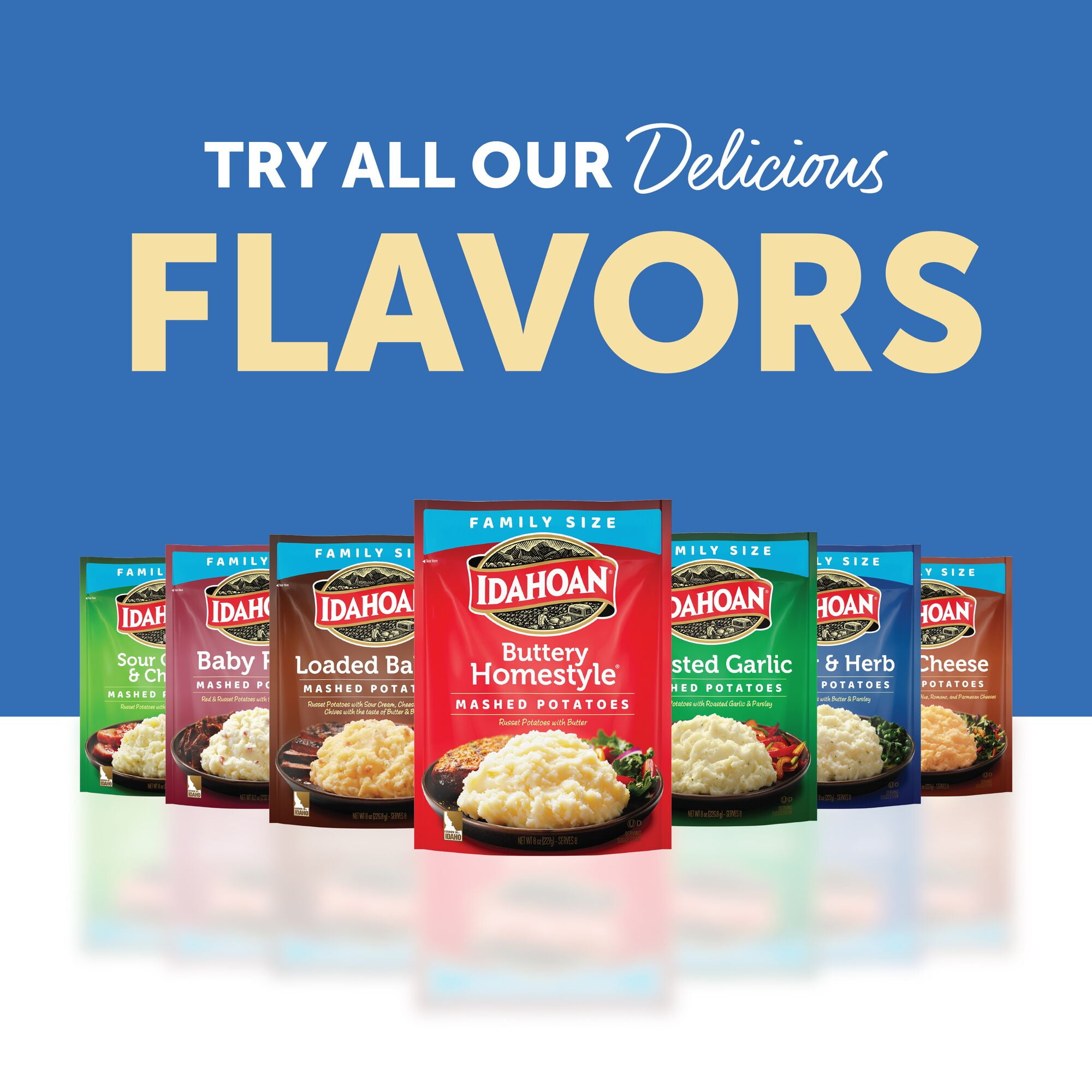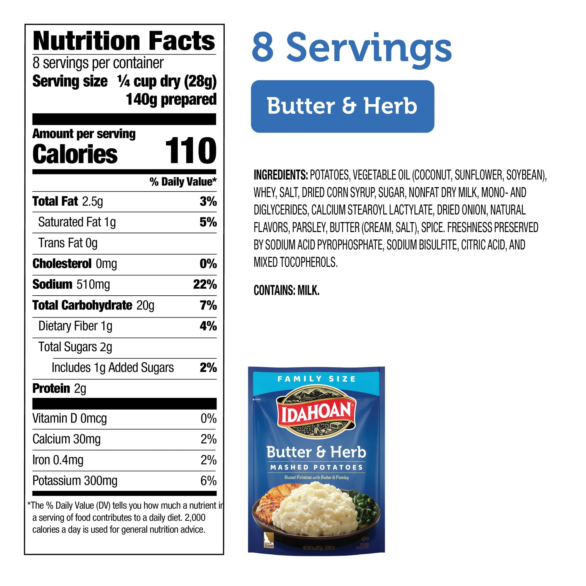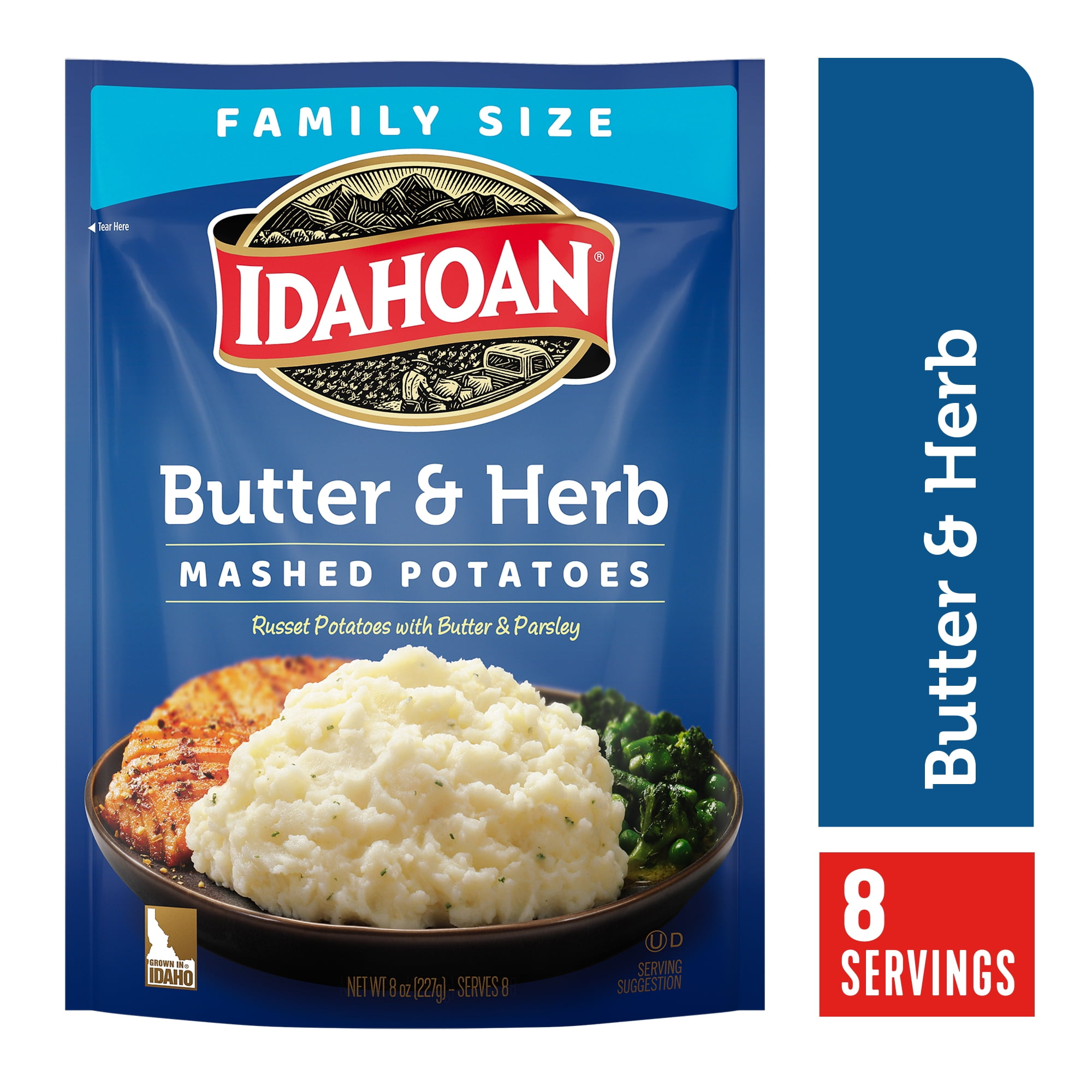 Whip up delicious, rich mashed potatoes in minutes with Idahoan Butter & Herb Mashed Potatoes! Our mashed potatoes are always made with 100% real Idaho potatoes. Perfect for a variety of wholesome recipes, Idahoan Butter & Herb Mashed Potatoes are easy to prepare and ready in minutes. Simply heat water on stovetop or in a microwave, add the entire pouch of mashed potatoes, and voilà! Each 8oz pouch with eight (half cup) servings. Our mission of innovation will continue to bring you quality 100% real Idaho potatoes in all the ways you love. Whether it’s quality mashed potatoes, casseroles or hash browns, in a pouch, cup or more, Idahoan Foods will continue to bring you Homemade Taste—Every Time.