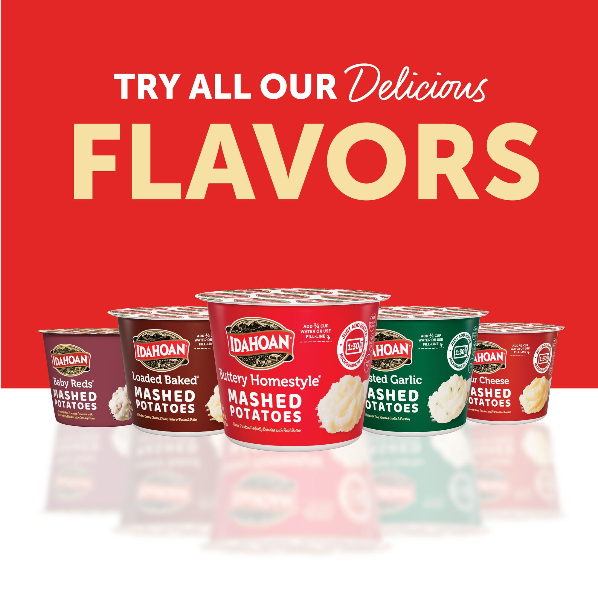 Whip up delicious, rich mashed potatoes in minutes with Idahoan Buttery Homestyle Mashed Potatoes! We’re sure you’ll find many great uses for Idahoan’s Buttery Homestyle Mashed Potatoes Cup, from snacks to work-time lunch sides. The flavor of Idahoan’s best, now in an ultra-convenient pack. Our instant mashed potatoes are always made with 100% Real Idaho potatoes make for a classic favorite. Perfect for a variety of wholesome recipes, Idahoan Buttery Homestyle Mashed Potatoes are easy to prepare and ready in minutes. Simply add cold water to fill-line in cup, stir, microwave for 1 1/2 minutes, and voilà! Each order includes (6) 4-pack (1.5oz) cups. Whether you’re looking for traditional comfort food, or wanting a modern spin on classic dishes, Idahoan delivers Homemade Taste—Every Time.